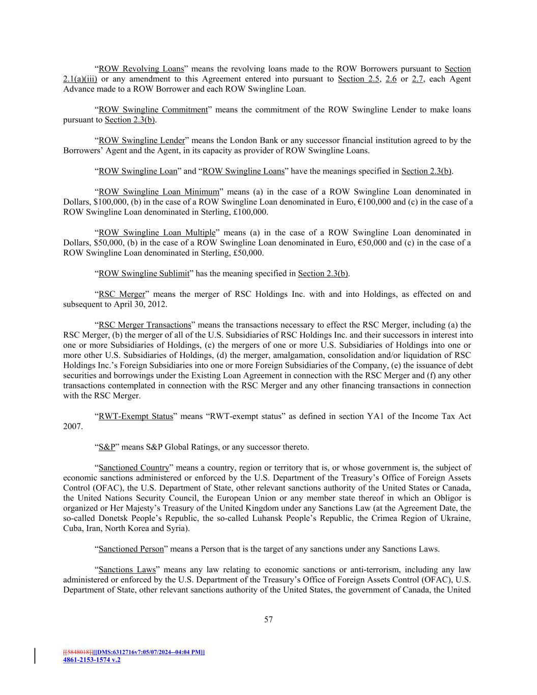 “ROW Revolving Loans” means the revolving loans made to the ROW Borrowers pursuant to Section 2.1(a)(iii) or any amendment to this Agreement entered into pursuant to Section 2.5, 2.6 or 2.7, each Agent Advance made to a ROW Borrower and each ROW Swingline Loan. “ROW Swingline Commitment” means the commitment of the ROW Swingline Lender to make loans pursuant to Section 2.3(b). “ROW Swingline Lender” means the London Bank or any successor financial institution agreed to by the Borrowers’ Agent and the Agent, in its capacity as provider of ROW Swingline Loans. “ROW Swingline Loan” and “ROW Swingline Loans” have the meanings specified in Section 2.3(b). “ROW Swingline Loan Minimum” means (a) in the case of a ROW Swingline Loan denominated in Dollars, $100,000, (b) in the case of a ROW Swingline Loan denominated in Euro, €100,000 and (c) in the case of a ROW Swingline Loan denominated in Sterling, £100,000. “ROW Swingline Loan Multiple” means (a) in the case of a ROW Swingline Loan denominated in Dollars, $50,000, (b) in the case of a ROW Swingline Loan denominated in Euro, €50,000 and (c) in the case of a ROW Swingline Loan denominated in Sterling, £50,000. “ROW Swingline Sublimit” has the meaning specified in Section 2.3(b). “RSC Merger” means the merger of RSC Holdings Inc. with and into Holdings, as effected on and subsequent to April 30, 2012. “RSC Merger Transactions” means the transactions necessary to effect the RSC Merger, including (a) the RSC Merger, (b) the merger of all of the U.S. Subsidiaries of RSC Holdings Inc. and their successors in interest into one or more Subsidiaries of Holdings, (c) the mergers of one or more U.S. Subsidiaries of Holdings into one or more other U.S. Subsidiaries of Holdings, (d) the merger, amalgamation, consolidation and/or liquidation of RSC Holdings Inc.’s Foreign Subsidiaries into one or more Foreign Subsidiaries of the Company, (e) the issuance of debt securities and borrowings under the Existing Loan Agreement in connection with the RSC Merger and (f) any other transactions contemplated in connection with the RSC Merger and any other financing transactions in connection with the RSC Merger. “RWT-Exempt Status” means “RWT-exempt status” as defined in section YA1 of the Income Tax Act 2007. “S&P” means S&P Global Ratings, or any successor thereto. “Sanctioned Country” means a country, region or territory that is, or whose government is, the subject of economic sanctions administered or enforced by the U.S. Department of the Treasury’s Office of Foreign Assets Control (OFAC), the U.S. Department of State, other relevant sanctions authority of the United States or Canada, the United Nations Security Council, the European Union or any member state thereof in which an Obligor is organized or Her Majesty’s Treasury of the United Kingdom under any Sanctions Law (at the Agreement Date, the so-called Donetsk People’s Republic, the so-called Luhansk People’s Republic, the Crimea Region of Ukraine, Cuba, Iran, North Korea and Syria). “Sanctioned Person” means a Person that is the target of any sanctions under any Sanctions Laws. “Sanctions Laws” means any law relating to economic sanctions or anti-terrorism, including any law administered or enforced by the U.S. Department of the Treasury’s Office of Foreign Assets Control (OFAC), U.S. Department of State, other relevant sanctions authority of the United States, the government of Canada, the United 57 [[5848018]][[DMS:6312716v7:05/07/2024--04:04 PM]] 4861-2153-1574 v.2