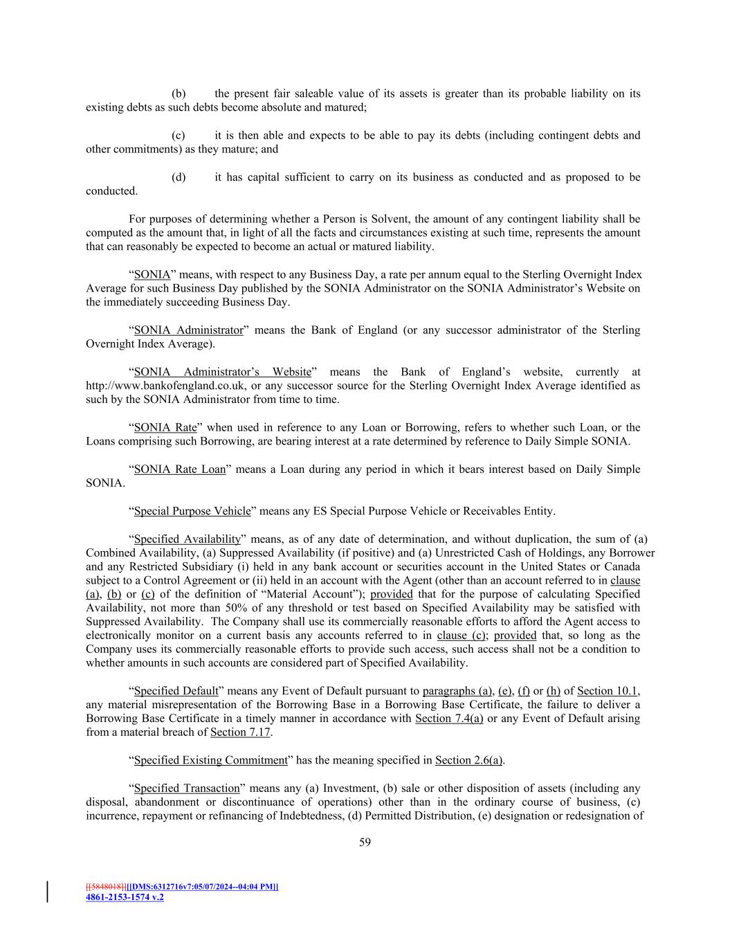 (b) the present fair saleable value of its assets is greater than its probable liability on its existing debts as such debts become absolute and matured; (c) it is then able and expects to be able to pay its debts (including contingent debts and other commitments) as they mature; and (d) it has capital sufficient to carry on its business as conducted and as proposed to be conducted. For purposes of determining whether a Person is Solvent, the amount of any contingent liability shall be computed as the amount that, in light of all the facts and circumstances existing at such time, represents the amount that can reasonably be expected to become an actual or matured liability. “SONIA” means, with respect to any Business Day, a rate per annum equal to the Sterling Overnight Index Average for such Business Day published by the SONIA Administrator on the SONIA Administrator’s Website on the immediately succeeding Business Day. “SONIA Administrator” means the Bank of England (or any successor administrator of the Sterling Overnight Index Average). “SONIA Administrator’s Website” means the Bank of England’s website, currently at http://www.bankofengland.co.uk, or any successor source for the Sterling Overnight Index Average identified as such by the SONIA Administrator from time to time. “SONIA Rate” when used in reference to any Loan or Borrowing, refers to whether such Loan, or the Loans comprising such Borrowing, are bearing interest at a rate determined by reference to Daily Simple SONIA. “SONIA Rate Loan” means a Loan during any period in which it bears interest based on Daily Simple SONIA. “Special Purpose Vehicle” means any ES Special Purpose Vehicle or Receivables Entity. “Specified Availability” means, as of any date of determination, and without duplication, the sum of (a) Combined Availability, (a) Suppressed Availability (if positive) and (a) Unrestricted Cash of Holdings, any Borrower and any Restricted Subsidiary (i) held in any bank account or securities account in the United States or Canada subject to a Control Agreement or (ii) held in an account with the Agent (other than an account referred to in clause (a), (b) or (c) of the definition of “Material Account”); provided that for the purpose of calculating Specified Availability, not more than 50% of any threshold or test based on Specified Availability may be satisfied with Suppressed Availability. The Company shall use its commercially reasonable efforts to afford the Agent access to electronically monitor on a current basis any accounts referred to in clause (c); provided that, so long as the Company uses its commercially reasonable efforts to provide such access, such access shall not be a condition to whether amounts in such accounts are considered part of Specified Availability. “Specified Default” means any Event of Default pursuant to paragraphs (a), (e), (f) or (h) of Section 10.1, any material misrepresentation of the Borrowing Base in a Borrowing Base Certificate, the failure to deliver a Borrowing Base Certificate in a timely manner in accordance with Section 7.4(a) or any Event of Default arising from a material breach of Section 7.17. “Specified Existing Commitment” has the meaning specified in Section 2.6(a). “Specified Transaction” means any (a) Investment, (b) sale or other disposition of assets (including any disposal, abandonment or discontinuance of operations) other than in the ordinary course of business, (c) incurrence, repayment or refinancing of Indebtedness, (d) Permitted Distribution, (e) designation or redesignation of 59 [[5848018]][[DMS:6312716v7:05/07/2024--04:04 PM]] 4861-2153-1574 v.2