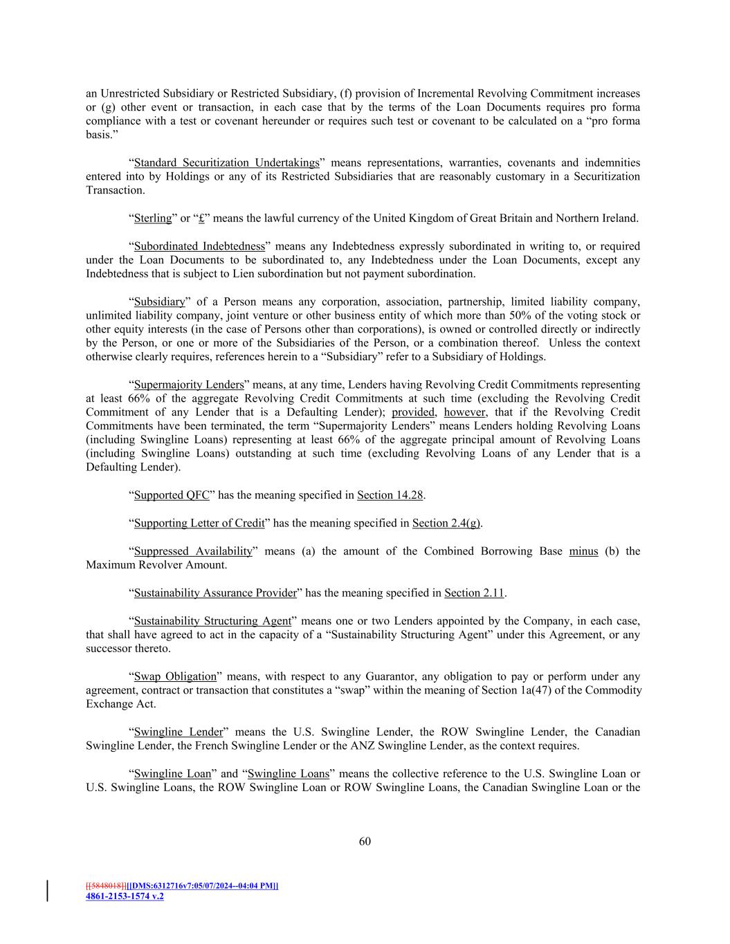 an Unrestricted Subsidiary or Restricted Subsidiary, (f) provision of Incremental Revolving Commitment increases or (g) other event or transaction, in each case that by the terms of the Loan Documents requires pro forma compliance with a test or covenant hereunder or requires such test or covenant to be calculated on a “pro forma basis.” “Standard Securitization Undertakings” means representations, warranties, covenants and indemnities entered into by Holdings or any of its Restricted Subsidiaries that are reasonably customary in a Securitization Transaction. “Sterling” or “£” means the lawful currency of the United Kingdom of Great Britain and Northern Ireland. “Subordinated Indebtedness” means any Indebtedness expressly subordinated in writing to, or required under the Loan Documents to be subordinated to, any Indebtedness under the Loan Documents, except any Indebtedness that is subject to Lien subordination but not payment subordination. “Subsidiary” of a Person means any corporation, association, partnership, limited liability company, unlimited liability company, joint venture or other business entity of which more than 50% of the voting stock or other equity interests (in the case of Persons other than corporations), is owned or controlled directly or indirectly by the Person, or one or more of the Subsidiaries of the Person, or a combination thereof. Unless the context otherwise clearly requires, references herein to a “Subsidiary” refer to a Subsidiary of Holdings. “Supermajority Lenders” means, at any time, Lenders having Revolving Credit Commitments representing at least 66% of the aggregate Revolving Credit Commitments at such time (excluding the Revolving Credit Commitment of any Lender that is a Defaulting Lender); provided, however, that if the Revolving Credit Commitments have been terminated, the term “Supermajority Lenders” means Lenders holding Revolving Loans (including Swingline Loans) representing at least 66% of the aggregate principal amount of Revolving Loans (including Swingline Loans) outstanding at such time (excluding Revolving Loans of any Lender that is a Defaulting Lender). “Supported QFC” has the meaning specified in Section 14.28. “Supporting Letter of Credit” has the meaning specified in Section 2.4(g). “Suppressed Availability” means (a) the amount of the Combined Borrowing Base minus (b) the Maximum Revolver Amount. “Sustainability Assurance Provider” has the meaning specified in Section 2.11. “Sustainability Structuring Agent” means one or two Lenders appointed by the Company, in each case, that shall have agreed to act in the capacity of a “Sustainability Structuring Agent” under this Agreement, or any successor thereto. “Swap Obligation” means, with respect to any Guarantor, any obligation to pay or perform under any agreement, contract or transaction that constitutes a “swap” within the meaning of Section 1a(47) of the Commodity Exchange Act. “Swingline Lender” means the U.S. Swingline Lender, the ROW Swingline Lender, the Canadian Swingline Lender, the French Swingline Lender or the ANZ Swingline Lender, as the context requires. “Swingline Loan” and “Swingline Loans” means the collective reference to the U.S. Swingline Loan or U.S. Swingline Loans, the ROW Swingline Loan or ROW Swingline Loans, the Canadian Swingline Loan or the 60 [[5848018]][[DMS:6312716v7:05/07/2024--04:04 PM]] 4861-2153-1574 v.2