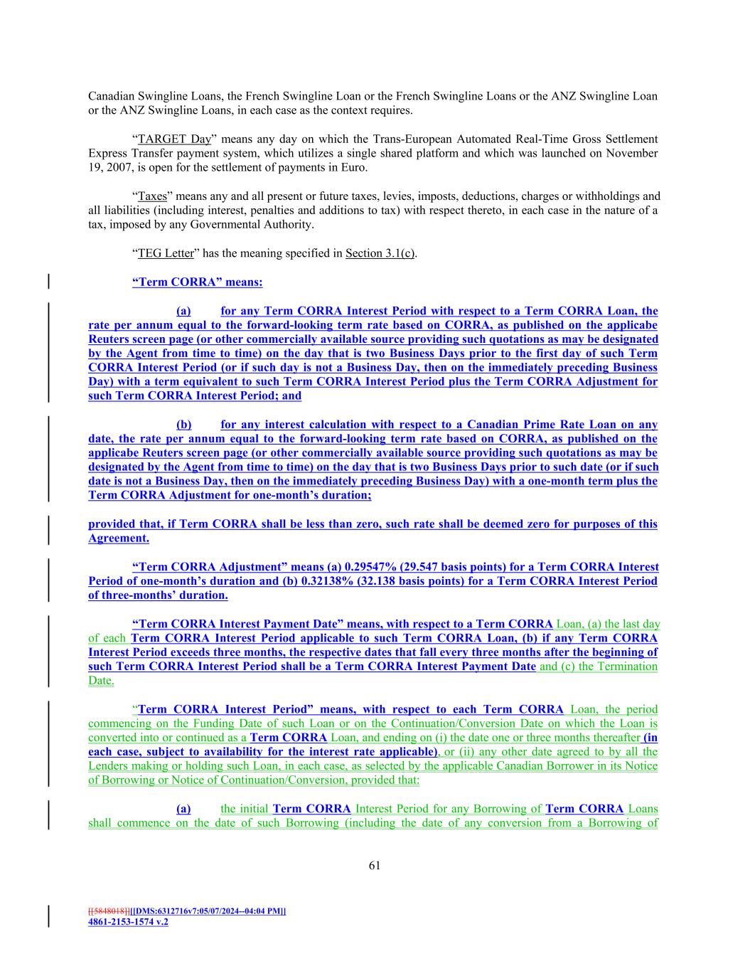 Canadian Swingline Loans, the French Swingline Loan or the French Swingline Loans or the ANZ Swingline Loan or the ANZ Swingline Loans, in each case as the context requires. “TARGET Day” means any day on which the Trans-European Automated Real-Time Gross Settlement Express Transfer payment system, which utilizes a single shared platform and which was launched on November 19, 2007, is open for the settlement of payments in Euro. “Taxes” means any and all present or future taxes, levies, imposts, deductions, charges or withholdings and all liabilities (including interest, penalties and additions to tax) with respect thereto, in each case in the nature of a tax, imposed by any Governmental Authority. “TEG Letter” has the meaning specified in Section 3.1(c). “Term CORRA” means: (a) for any Term CORRA Interest Period with respect to a Term CORRA Loan, the rate per annum equal to the forward-looking term rate based on CORRA, as published on the applicabe Reuters screen page (or other commercially available source providing such quotations as may be designated by the Agent from time to time) on the day that is two Business Days prior to the first day of such Term CORRA Interest Period (or if such day is not a Business Day, then on the immediately preceding Business Day) with a term equivalent to such Term CORRA Interest Period plus the Term CORRA Adjustment for such Term CORRA Interest Period; and (b) for any interest calculation with respect to a Canadian Prime Rate Loan on any date, the rate per annum equal to the forward-looking term rate based on CORRA, as published on the applicabe Reuters screen page (or other commercially available source providing such quotations as may be designated by the Agent from time to time) on the day that is two Business Days prior to such date (or if such date is not a Business Day, then on the immediately preceding Business Day) with a one-month term plus the Term CORRA Adjustment for one-month’s duration; provided that, if Term CORRA shall be less than zero, such rate shall be deemed zero for purposes of this Agreement. “Term CORRA Adjustment” means (a) 0.29547% (29.547 basis points) for a Term CORRA Interest Period of one-month’s duration and (b) 0.32138% (32.138 basis points) for a Term CORRA Interest Period of three-months’ duration. “Term CORRA Interest Payment Date” means, with respect to a Term CORRA Loan, (a) the last day of each Term CORRA Interest Period applicable to such Term CORRA Loan, (b) if any Term CORRA Interest Period exceeds three months, the respective dates that fall every three months after the beginning of such Term CORRA Interest Period shall be a Term CORRA Interest Payment Date and (c) the Termination Date. “Term CORRA Interest Period” means, with respect to each Term CORRA Loan, the period commencing on the Funding Date of such Loan or on the Continuation/Conversion Date on which the Loan is converted into or continued as a Term CORRA Loan, and ending on (i) the date one or three months thereafter (in each case, subject to availability for the interest rate applicable), or (ii) any other date agreed to by all the Lenders making or holding such Loan, in each case, as selected by the applicable Canadian Borrower in its Notice of Borrowing or Notice of Continuation/Conversion, provided that: (a) the initial Term CORRA Interest Period for any Borrowing of Term CORRA Loans shall commence on the date of such Borrowing (including the date of any conversion from a Borrowing of 61 [[5848018]][[DMS:6312716v7:05/07/2024--04:04 PM]] 4861-2153-1574 v.2