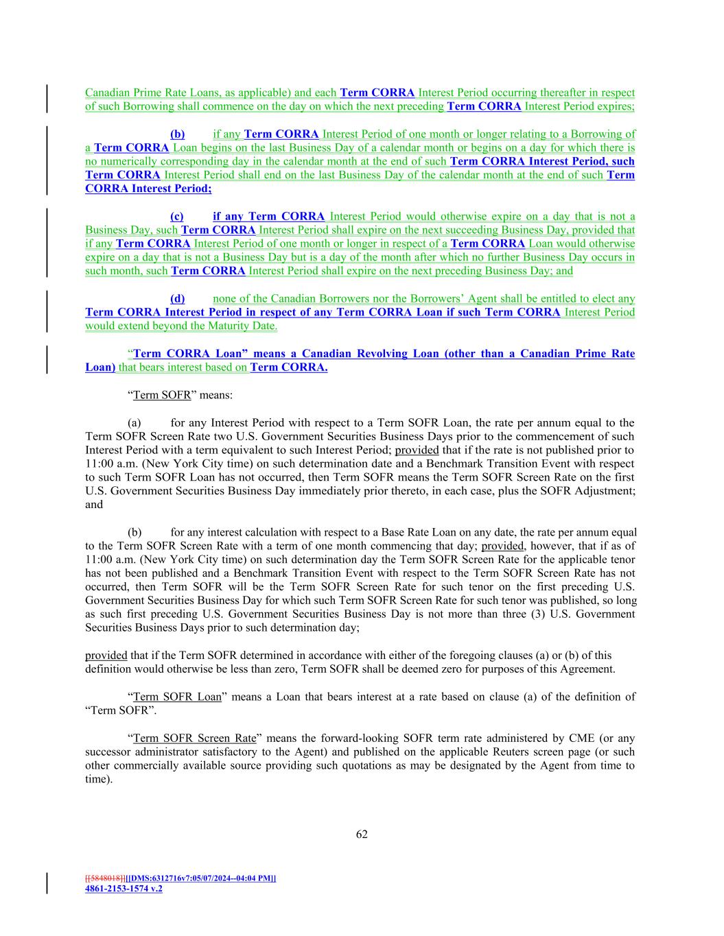 Canadian Prime Rate Loans, as applicable) and each Term CORRA Interest Period occurring thereafter in respect of such Borrowing shall commence on the day on which the next preceding Term CORRA Interest Period expires; (b) if any Term CORRA Interest Period of one month or longer relating to a Borrowing of a Term CORRA Loan begins on the last Business Day of a calendar month or begins on a day for which there is no numerically corresponding day in the calendar month at the end of such Term CORRA Interest Period, such Term CORRA Interest Period shall end on the last Business Day of the calendar month at the end of such Term CORRA Interest Period; (c) if any Term CORRA Interest Period would otherwise expire on a day that is not a Business Day, such Term CORRA Interest Period shall expire on the next succeeding Business Day, provided that if any Term CORRA Interest Period of one month or longer in respect of a Term CORRA Loan would otherwise expire on a day that is not a Business Day but is a day of the month after which no further Business Day occurs in such month, such Term CORRA Interest Period shall expire on the next preceding Business Day; and (d) none of the Canadian Borrowers nor the Borrowers’ Agent shall be entitled to elect any Term CORRA Interest Period in respect of any Term CORRA Loan if such Term CORRA Interest Period would extend beyond the Maturity Date. “Term CORRA Loan” means a Canadian Revolving Loan (other than a Canadian Prime Rate Loan) that bears interest based on Term CORRA. “Term SOFR” means: (a) for any Interest Period with respect to a Term SOFR Loan, the rate per annum equal to the Term SOFR Screen Rate two U.S. Government Securities Business Days prior to the commencement of such Interest Period with a term equivalent to such Interest Period; provided that if the rate is not published prior to 11:00 a.m. (New York City time) on such determination date and a Benchmark Transition Event with respect to such Term SOFR Loan has not occurred, then Term SOFR means the Term SOFR Screen Rate on the first U.S. Government Securities Business Day immediately prior thereto, in each case, plus the SOFR Adjustment; and (b) for any interest calculation with respect to a Base Rate Loan on any date, the rate per annum equal to the Term SOFR Screen Rate with a term of one month commencing that day; provided, however, that if as of 11:00 a.m. (New York City time) on such determination day the Term SOFR Screen Rate for the applicable tenor has not been published and a Benchmark Transition Event with respect to the Term SOFR Screen Rate has not occurred, then Term SOFR will be the Term SOFR Screen Rate for such tenor on the first preceding U.S. Government Securities Business Day for which such Term SOFR Screen Rate for such tenor was published, so long as such first preceding U.S. Government Securities Business Day is not more than three (3) U.S. Government Securities Business Days prior to such determination day; provided that if the Term SOFR determined in accordance with either of the foregoing clauses (a) or (b) of this definition would otherwise be less than zero, Term SOFR shall be deemed zero for purposes of this Agreement. “Term SOFR Loan” means a Loan that bears interest at a rate based on clause (a) of the definition of “Term SOFR”. “Term SOFR Screen Rate” means the forward-looking SOFR term rate administered by CME (or any successor administrator satisfactory to the Agent) and published on the applicable Reuters screen page (or such other commercially available source providing such quotations as may be designated by the Agent from time to time). 62 [[5848018]][[DMS:6312716v7:05/07/2024--04:04 PM]] 4861-2153-1574 v.2