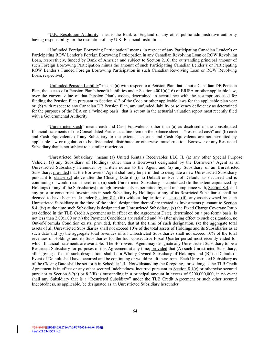 “U.K. Resolution Authority” means the Bank of England or any other public administrative authority having responsibility for the resolution of any U.K. Financial Institution. “Unfunded Foreign Borrowing Participation” means, in respect of any Participating Canadian Lender’s or Participating ROW Lender’s Foreign Borrowing Participation in any Canadian Revolving Loan or ROW Revolving Loan, respectively, funded by Bank of America and subject to Section 2.10, the outstanding principal amount of such Foreign Borrowing Participation minus the amount of such Participating Canadian Lender’s or Participating ROW Lender’s Funded Foreign Borrowing Participation in such Canadian Revolving Loan or ROW Revolving Loan, respectively. “Unfunded Pension Liability” means (a) with respect to a Pension Plan that is not a Canadian DB Pension Plan, the excess of a Pension Plan’s benefit liabilities under Section 4001(a)(16) of ERISA or other applicable law, over the current value of that Pension Plan’s assets, determined in accordance with the assumptions used for funding the Pension Plan pursuant to Section 412 of the Code or other applicable laws for the applicable plan year or, (b) with respect to any Canadian DB Pension Plan, any unfunded liability or solvency deficiency as determined for the purposes of the PBA on a “wind-up basis” that is set out in the actuarial valuation report most recently filed with a Governmental Authority. “Unrestricted Cash” means cash and Cash Equivalents, other than (a) as disclosed in the consolidated financial statements of the Consolidated Parties as a line item on the balance sheet as “restricted cash” and (b) cash and Cash Equivalents of any Subsidiary to the extent such cash and Cash Equivalents are not permitted by applicable law or regulation to be dividended, distributed or otherwise transferred to a Borrower or any Restricted Subsidiary that is not subject to a similar restriction. “Unrestricted Subsidiary” means (a) United Rentals Receivables LLC II, (a) any other Special Purpose Vehicle, (a) any Subsidiary of Holdings (other than a Borrower) designated by the Borrowers’ Agent as an Unrestricted Subsidiary hereunder by written notice to the Agent and (a) any Subsidiary of an Unrestricted Subsidiary; provided that the Borrowers’ Agent shall only be permitted to designate a new Unrestricted Subsidiary pursuant to clause (c) above after the Closing Date if (i) no Default or Event of Default has occurred and is continuing or would result therefrom, (ii) such Unrestricted Subsidiary is capitalized (to the extent capitalized by Holdings or any of the Subsidiaries) through Investments as permitted by, and in compliance with, Section 8.4, and any prior or concurrent Investments in such Subsidiary by Holdings or any of its Restricted Subsidiaries shall be deemed to have been made under Section 8.4, (iii) without duplication of clause (ii), any assets owned by such Unrestricted Subsidiary at the time of the initial designation thereof are treated as Investments pursuant to Section 8.4, (iv) at the time such Subsidiary is designated an Unrestricted Subsidiary, (x) the Fixed Charge Coverage Ratio (as defined in the TLB Credit Agreement as in effect on the Agreement Date), determined on a pro forma basis, is not less than 2.00:1.00 or (y) the Payment Conditions are satisfied and (v) after giving effect to such designation, no Out-of-Formula Condition exists; provided, further, that at the time of such designation, (x) the aggregate total assets of all Unrestricted Subsidiaries shall not exceed 10% of the total assets of Holdings and its Subsidiaries as at such date and (y) the aggregate total revenues of all Unrestricted Subsidiaries shall not exceed 10% of the total revenues of Holdings and its Subsidiaries for the four consecutive Fiscal Quarter period most recently ended for which financial statements are available. The Borrowers’ Agent may designate any Unrestricted Subsidiary to be a Restricted Subsidiary for purposes of this Agreement at any time; provided that (A) such Unrestricted Subsidiary, after giving effect to such designation, shall be a Wholly Owned Subsidiary of Holdings and (B) no Default or Event of Default shall have occurred and be continuing or would result therefrom. Each Unrestricted Subsidiary as of the Closing Date shall be set forth in Schedule 1.4. Notwithstanding the foregoing, for so long as the TLB Credit Agreement is in effect or any other secured Indebtedness incurred pursuant to Section 8.1(c) or otherwise secured pursuant to Section 8.2(c) or 8.2(ii) is outstanding in a principal amount in excess of $200,000,000, in no event shall any Subsidiary that is a “Restricted Subsidiary” under the TLB Credit Agreement or such other secured Indebtedness, as applicable, be designated as an Unrestricted Subsidiary hereunder. 64 [[5848018]][[DMS:6312716v7:05/07/2024--04:04 PM]] 4861-2153-1574 v.2