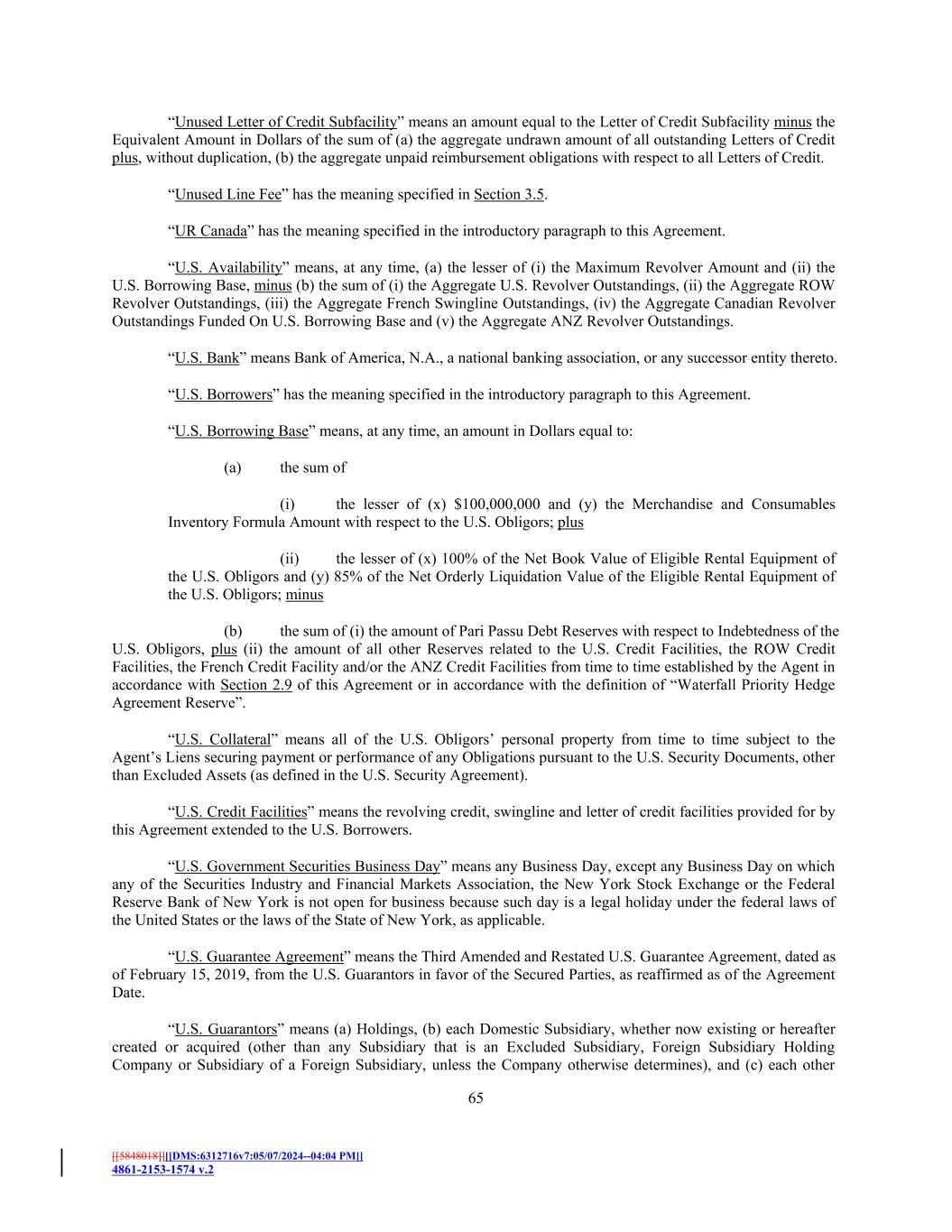 “Unused Letter of Credit Subfacility” means an amount equal to the Letter of Credit Subfacility minus the Equivalent Amount in Dollars of the sum of (a) the aggregate undrawn amount of all outstanding Letters of Credit plus, without duplication, (b) the aggregate unpaid reimbursement obligations with respect to all Letters of Credit. “Unused Line Fee” has the meaning specified in Section 3.5. “UR Canada” has the meaning specified in the introductory paragraph to this Agreement. “U.S. Availability” means, at any time, (a) the lesser of (i) the Maximum Revolver Amount and (ii) the U.S. Borrowing Base, minus (b) the sum of (i) the Aggregate U.S. Revolver Outstandings, (ii) the Aggregate ROW Revolver Outstandings, (iii) the Aggregate French Swingline Outstandings, (iv) the Aggregate Canadian Revolver Outstandings Funded On U.S. Borrowing Base and (v) the Aggregate ANZ Revolver Outstandings. “U.S. Bank” means Bank of America, N.A., a national banking association, or any successor entity thereto. “U.S. Borrowers” has the meaning specified in the introductory paragraph to this Agreement. “U.S. Borrowing Base” means, at any time, an amount in Dollars equal to: (a) the sum of (i) the lesser of (x) $100,000,000 and (y) the Merchandise and Consumables Inventory Formula Amount with respect to the U.S. Obligors; plus (ii) the lesser of (x) 100% of the Net Book Value of Eligible Rental Equipment of the U.S. Obligors and (y) 85% of the Net Orderly Liquidation Value of the Eligible Rental Equipment of the U.S. Obligors; minus (b) the sum of (i) the amount of Pari Passu Debt Reserves with respect to Indebtedness of the U.S. Obligors, plus (ii) the amount of all other Reserves related to the U.S. Credit Facilities, the ROW Credit Facilities, the French Credit Facility and/or the ANZ Credit Facilities from time to time established by the Agent in accordance with Section 2.9 of this Agreement or in accordance with the definition of “Waterfall Priority Hedge Agreement Reserve”. “U.S. Collateral” means all of the U.S. Obligors’ personal property from time to time subject to the Agent’s Liens securing payment or performance of any Obligations pursuant to the U.S. Security Documents, other than Excluded Assets (as defined in the U.S. Security Agreement). “U.S. Credit Facilities” means the revolving credit, swingline and letter of credit facilities provided for by this Agreement extended to the U.S. Borrowers. “U.S. Government Securities Business Day” means any Business Day, except any Business Day on which any of the Securities Industry and Financial Markets Association, the New York Stock Exchange or the Federal Reserve Bank of New York is not open for business because such day is a legal holiday under the federal laws of the United States or the laws of the State of New York, as applicable. “U.S. Guarantee Agreement” means the Third Amended and Restated U.S. Guarantee Agreement, dated as of February 15, 2019, from the U.S. Guarantors in favor of the Secured Parties, as reaffirmed as of the Agreement Date. “U.S. Guarantors” means (a) Holdings, (b) each Domestic Subsidiary, whether now existing or hereafter created or acquired (other than any Subsidiary that is an Excluded Subsidiary, Foreign Subsidiary Holding Company or Subsidiary of a Foreign Subsidiary, unless the Company otherwise determines), and (c) each other 65 [[5848018]][[DMS:6312716v7:05/07/2024--04:04 PM]] 4861-2153-1574 v.2