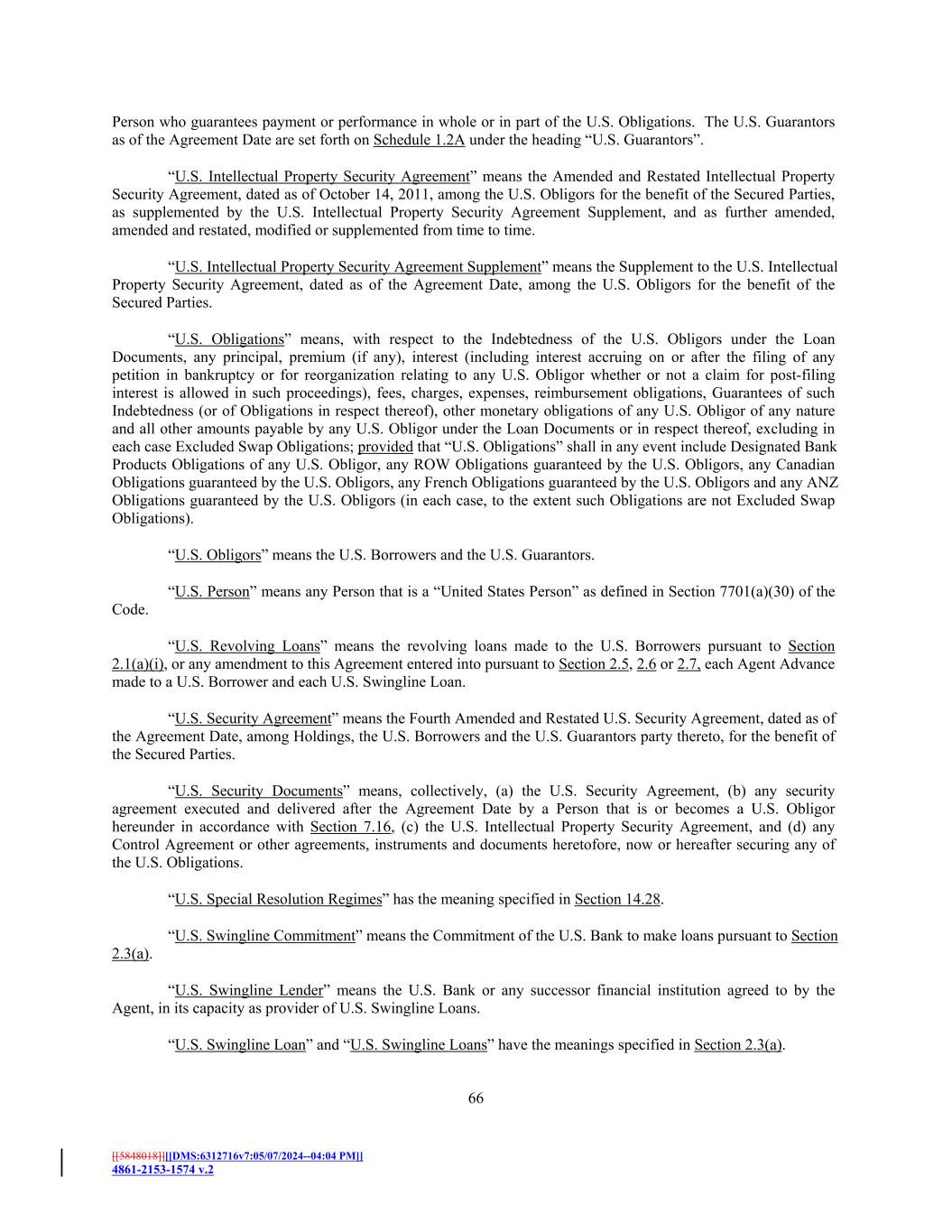 Person who guarantees payment or performance in whole or in part of the U.S. Obligations. The U.S. Guarantors as of the Agreement Date are set forth on Schedule 1.2A under the heading “U.S. Guarantors”. “U.S. Intellectual Property Security Agreement” means the Amended and Restated Intellectual Property Security Agreement, dated as of October 14, 2011, among the U.S. Obligors for the benefit of the Secured Parties, as supplemented by the U.S. Intellectual Property Security Agreement Supplement, and as further amended, amended and restated, modified or supplemented from time to time. “U.S. Intellectual Property Security Agreement Supplement” means the Supplement to the U.S. Intellectual Property Security Agreement, dated as of the Agreement Date, among the U.S. Obligors for the benefit of the Secured Parties. “U.S. Obligations” means, with respect to the Indebtedness of the U.S. Obligors under the Loan Documents, any principal, premium (if any), interest (including interest accruing on or after the filing of any petition in bankruptcy or for reorganization relating to any U.S. Obligor whether or not a claim for post-filing interest is allowed in such proceedings), fees, charges, expenses, reimbursement obligations, Guarantees of such Indebtedness (or of Obligations in respect thereof), other monetary obligations of any U.S. Obligor of any nature and all other amounts payable by any U.S. Obligor under the Loan Documents or in respect thereof, excluding in each case Excluded Swap Obligations; provided that “U.S. Obligations” shall in any event include Designated Bank Products Obligations of any U.S. Obligor, any ROW Obligations guaranteed by the U.S. Obligors, any Canadian Obligations guaranteed by the U.S. Obligors, any French Obligations guaranteed by the U.S. Obligors and any ANZ Obligations guaranteed by the U.S. Obligors (in each case, to the extent such Obligations are not Excluded Swap Obligations). “U.S. Obligors” means the U.S. Borrowers and the U.S. Guarantors. “U.S. Person” means any Person that is a “United States Person” as defined in Section 7701(a)(30) of the Code. “U.S. Revolving Loans” means the revolving loans made to the U.S. Borrowers pursuant to Section 2.1(a)(i), or any amendment to this Agreement entered into pursuant to Section 2.5, 2.6 or 2.7, each Agent Advance made to a U.S. Borrower and each U.S. Swingline Loan. “U.S. Security Agreement” means the Fourth Amended and Restated U.S. Security Agreement, dated as of the Agreement Date, among Holdings, the U.S. Borrowers and the U.S. Guarantors party thereto, for the benefit of the Secured Parties. “U.S. Security Documents” means, collectively, (a) the U.S. Security Agreement, (b) any security agreement executed and delivered after the Agreement Date by a Person that is or becomes a U.S. Obligor hereunder in accordance with Section 7.16, (c) the U.S. Intellectual Property Security Agreement, and (d) any Control Agreement or other agreements, instruments and documents heretofore, now or hereafter securing any of the U.S. Obligations. “U.S. Special Resolution Regimes” has the meaning specified in Section 14.28. “U.S. Swingline Commitment” means the Commitment of the U.S. Bank to make loans pursuant to Section 2.3(a). “U.S. Swingline Lender” means the U.S. Bank or any successor financial institution agreed to by the Agent, in its capacity as provider of U.S. Swingline Loans. “U.S. Swingline Loan” and “U.S. Swingline Loans” have the meanings specified in Section 2.3(a). 66 [[5848018]][[DMS:6312716v7:05/07/2024--04:04 PM]] 4861-2153-1574 v.2