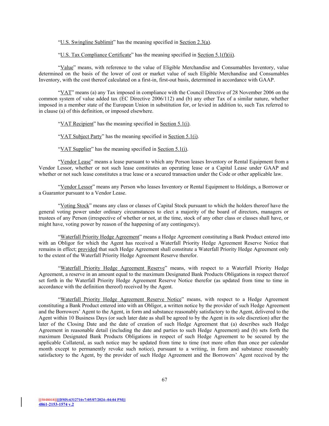 “U.S. Swingline Sublimit” has the meaning specified in Section 2.3(a). “U.S. Tax Compliance Certificate” has the meaning specified in Section 5.1(f)(ii). “Value” means, with reference to the value of Eligible Merchandise and Consumables Inventory, value determined on the basis of the lower of cost or market value of such Eligible Merchandise and Consumables Inventory, with the cost thereof calculated on a first-in, first-out basis, determined in accordance with GAAP. “VAT” means (a) any Tax imposed in compliance with the Council Directive of 28 November 2006 on the common system of value added tax (EC Directive 2006/112) and (b) any other Tax of a similar nature, whether imposed in a member state of the European Union in substitution for, or levied in addition to, such Tax referred to in clause (a) of this definition, or imposed elsewhere. “VAT Recipient” has the meaning specified in Section 5.1(i). “VAT Subject Party” has the meaning specified in Section 5.1(i). “VAT Supplier” has the meaning specified in Section 5.1(i). “Vendor Lease” means a lease pursuant to which any Person leases Inventory or Rental Equipment from a Vendor Lessor, whether or not such lease constitutes an operating lease or a Capital Lease under GAAP and whether or not such lease constitutes a true lease or a secured transaction under the Code or other applicable law. “Vendor Lessor” means any Person who leases Inventory or Rental Equipment to Holdings, a Borrower or a Guarantor pursuant to a Vendor Lease. “Voting Stock” means any class or classes of Capital Stock pursuant to which the holders thereof have the general voting power under ordinary circumstances to elect a majority of the board of directors, managers or trustees of any Person (irrespective of whether or not, at the time, stock of any other class or classes shall have, or might have, voting power by reason of the happening of any contingency). “Waterfall Priority Hedge Agreement” means a Hedge Agreement constituting a Bank Product entered into with an Obligor for which the Agent has received a Waterfall Priority Hedge Agreement Reserve Notice that remains in effect; provided that such Hedge Agreement shall constitute a Waterfall Priority Hedge Agreement only to the extent of the Waterfall Priority Hedge Agreement Reserve therefor. “Waterfall Priority Hedge Agreement Reserve” means, with respect to a Waterfall Priority Hedge Agreement, a reserve in an amount equal to the maximum Designated Bank Products Obligations in respect thereof set forth in the Waterfall Priority Hedge Agreement Reserve Notice therefor (as updated from time to time in accordance with the definition thereof) received by the Agent. “Waterfall Priority Hedge Agreement Reserve Notice” means, with respect to a Hedge Agreement constituting a Bank Product entered into with an Obligor, a written notice by the provider of such Hedge Agreement and the Borrowers’ Agent to the Agent, in form and substance reasonably satisfactory to the Agent, delivered to the Agent within 10 Business Days (or such later date as shall be agreed to by the Agent in its sole discretion) after the later of the Closing Date and the date of creation of such Hedge Agreement that (a) describes such Hedge Agreement in reasonable detail (including the date and parties to such Hedge Agreement) and (b) sets forth the maximum Designated Bank Products Obligations in respect of such Hedge Agreement to be secured by the applicable Collateral, as such notice may be updated from time to time (not more often than once per calendar month except to permanently revoke such notice), pursuant to a writing, in form and substance reasonably satisfactory to the Agent, by the provider of such Hedge Agreement and the Borrowers’ Agent received by the 67 [[5848018]][[DMS:6312716v7:05/07/2024--04:04 PM]] 4861-2153-1574 v.2