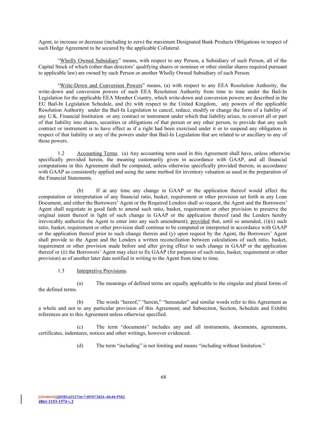 Agent, to increase or decrease (including to zero) the maximum Designated Bank Products Obligations in respect of such Hedge Agreement to be secured by the applicable Collateral. “Wholly Owned Subsidiary” means, with respect to any Person, a Subsidiary of such Person, all of the Capital Stock of which (other than directors’ qualifying shares or nominee or other similar shares required pursuant to applicable law) are owned by such Person or another Wholly Owned Subsidiary of such Person. “Write-Down and Conversion Powers” means, (a) with respect to any EEA Resolution Authority, the write-down and conversion powers of such EEA Resolution Authority from time to time under the Bail-In Legislation for the applicable EEA Member Country, which write-down and conversion powers are described in the EU Bail-In Legislation Schedule, and (b) with respect to the United Kingdom, any powers of the applicable Resolution Authority under the Bail-In Legislation to cancel, reduce, modify or change the form of a liability of any U.K. Financial Institution or any contract or instrument under which that liability arises, to convert all or part of that liability into shares, securities or obligations of that person or any other person, to provide that any such contract or instrument is to have effect as if a right had been exercised under it or to suspend any obligation in respect of that liability or any of the powers under that Bail-In Legislation that are related to or ancillary to any of those powers. 1.2 Accounting Terms. (a) Any accounting term used in this Agreement shall have, unless otherwise specifically provided herein, the meaning customarily given in accordance with GAAP, and all financial computations in this Agreement shall be computed, unless otherwise specifically provided therein, in accordance with GAAP as consistently applied and using the same method for inventory valuation as used in the preparation of the Financial Statements. (b) If at any time any change in GAAP or the application thereof would affect the computation or interpretation of any financial ratio, basket, requirement or other provision set forth in any Loan Document, and either the Borrowers’ Agent or the Required Lenders shall so request, the Agent and the Borrowers’ Agent shall negotiate in good faith to amend such ratio, basket, requirement or other provision to preserve the original intent thereof in light of such change in GAAP or the application thereof (and the Lenders hereby irrevocably authorize the Agent to enter into any such amendment); provided that, until so amended, (i)(x) such ratio, basket, requirement or other provision shall continue to be computed or interpreted in accordance with GAAP or the application thereof prior to such change therein and (y) upon request by the Agent, the Borrowers’ Agent shall provide to the Agent and the Lenders a written reconciliation between calculations of such ratio, basket, requirement or other provision made before and after giving effect to such change in GAAP or the application thereof or (ii) the Borrowers’ Agent may elect to fix GAAP (for purposes of such ratio, basket, requirement or other provision) as of another later date notified in writing to the Agent from time to time. 1.3 Interpretive Provisions. (a) The meanings of defined terms are equally applicable to the singular and plural forms of the defined terms. (b) The words “hereof,” “herein,” “hereunder” and similar words refer to this Agreement as a whole and not to any particular provision of this Agreement; and Subsection, Section, Schedule and Exhibit references are to this Agreement unless otherwise specified. (c) The term “documents” includes any and all instruments, documents, agreements, certificates, indentures, notices and other writings, however evidenced. (d) The term “including” is not limiting and means “including without limitation.” 68 [[5848018]][[DMS:6312716v7:05/07/2024--04:04 PM]] 4861-2153-1574 v.2