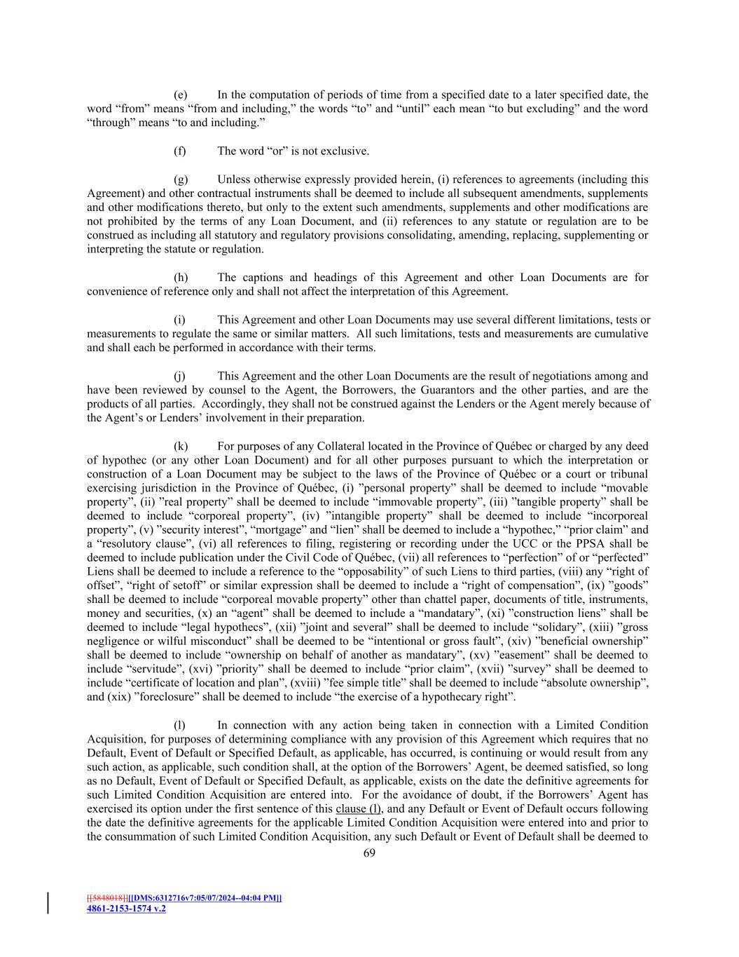 (e) In the computation of periods of time from a specified date to a later specified date, the word “from” means “from and including,” the words “to” and “until” each mean “to but excluding” and the word “through” means “to and including.” (f) The word “or” is not exclusive. (g) Unless otherwise expressly provided herein, (i) references to agreements (including this Agreement) and other contractual instruments shall be deemed to include all subsequent amendments, supplements and other modifications thereto, but only to the extent such amendments, supplements and other modifications are not prohibited by the terms of any Loan Document, and (ii) references to any statute or regulation are to be construed as including all statutory and regulatory provisions consolidating, amending, replacing, supplementing or interpreting the statute or regulation. (h) The captions and headings of this Agreement and other Loan Documents are for convenience of reference only and shall not affect the interpretation of this Agreement. (i) This Agreement and other Loan Documents may use several different limitations, tests or measurements to regulate the same or similar matters. All such limitations, tests and measurements are cumulative and shall each be performed in accordance with their terms. (j) This Agreement and the other Loan Documents are the result of negotiations among and have been reviewed by counsel to the Agent, the Borrowers, the Guarantors and the other parties, and are the products of all parties. Accordingly, they shall not be construed against the Lenders or the Agent merely because of the Agent’s or Lenders’ involvement in their preparation. (k) For purposes of any Collateral located in the Province of Québec or charged by any deed of hypothec (or any other Loan Document) and for all other purposes pursuant to which the interpretation or construction of a Loan Document may be subject to the laws of the Province of Québec or a court or tribunal exercising jurisdiction in the Province of Québec, (i) ”personal property” shall be deemed to include “movable property”, (ii) ”real property” shall be deemed to include “immovable property”, (iii) ”tangible property” shall be deemed to include “corporeal property”, (iv) ”intangible property” shall be deemed to include “incorporeal property”, (v) ”security interest”, “mortgage” and “lien” shall be deemed to include a “hypothec,” “prior claim” and a “resolutory clause”, (vi) all references to filing, registering or recording under the UCC or the PPSA shall be deemed to include publication under the Civil Code of Québec, (vii) all references to “perfection” of or “perfected” Liens shall be deemed to include a reference to the “opposability” of such Liens to third parties, (viii) any “right of offset”, “right of setoff” or similar expression shall be deemed to include a “right of compensation”, (ix) ”goods” shall be deemed to include “corporeal movable property” other than chattel paper, documents of title, instruments, money and securities, (x) an “agent” shall be deemed to include a “mandatary”, (xi) ”construction liens” shall be deemed to include “legal hypothecs”, (xii) ”joint and several” shall be deemed to include “solidary”, (xiii) ”gross negligence or wilful misconduct” shall be deemed to be “intentional or gross fault”, (xiv) ”beneficial ownership” shall be deemed to include “ownership on behalf of another as mandatary”, (xv) ”easement” shall be deemed to include “servitude”, (xvi) ”priority” shall be deemed to include “prior claim”, (xvii) ”survey” shall be deemed to include “certificate of location and plan”, (xviii) ”fee simple title” shall be deemed to include “absolute ownership”, and (xix) ”foreclosure” shall be deemed to include “the exercise of a hypothecary right”. (l) In connection with any action being taken in connection with a Limited Condition Acquisition, for purposes of determining compliance with any provision of this Agreement which requires that no Default, Event of Default or Specified Default, as applicable, has occurred, is continuing or would result from any such action, as applicable, such condition shall, at the option of the Borrowers’ Agent, be deemed satisfied, so long as no Default, Event of Default or Specified Default, as applicable, exists on the date the definitive agreements for such Limited Condition Acquisition are entered into. For the avoidance of doubt, if the Borrowers’ Agent has exercised its option under the first sentence of this clause (l), and any Default or Event of Default occurs following the date the definitive agreements for the applicable Limited Condition Acquisition were entered into and prior to the consummation of such Limited Condition Acquisition, any such Default or Event of Default shall be deemed to 69 [[5848018]][[DMS:6312716v7:05/07/2024--04:04 PM]] 4861-2153-1574 v.2