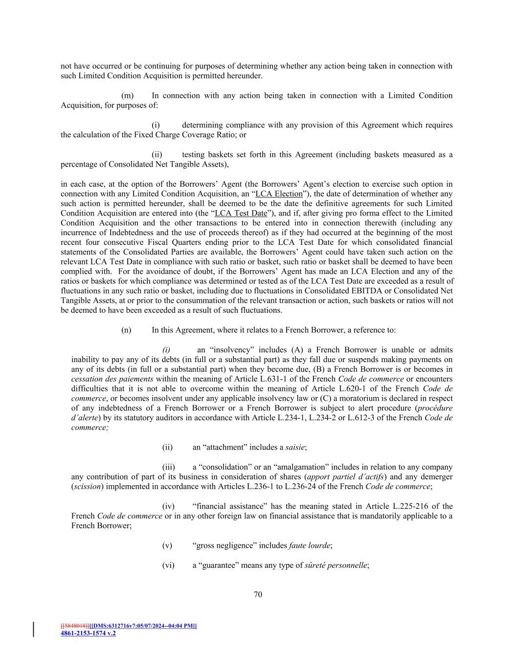 not have occurred or be continuing for purposes of determining whether any action being taken in connection with such Limited Condition Acquisition is permitted hereunder. (m) In connection with any action being taken in connection with a Limited Condition Acquisition, for purposes of: (i) determining compliance with any provision of this Agreement which requires the calculation of the Fixed Charge Coverage Ratio; or (ii) testing baskets set forth in this Agreement (including baskets measured as a percentage of Consolidated Net Tangible Assets), in each case, at the option of the Borrowers’ Agent (the Borrowers’ Agent’s election to exercise such option in connection with any Limited Condition Acquisition, an “LCA Election”), the date of determination of whether any such action is permitted hereunder, shall be deemed to be the date the definitive agreements for such Limited Condition Acquisition are entered into (the “LCA Test Date”), and if, after giving pro forma effect to the Limited Condition Acquisition and the other transactions to be entered into in connection therewith (including any incurrence of Indebtedness and the use of proceeds thereof) as if they had occurred at the beginning of the most recent four consecutive Fiscal Quarters ending prior to the LCA Test Date for which consolidated financial statements of the Consolidated Parties are available, the Borrowers’ Agent could have taken such action on the relevant LCA Test Date in compliance with such ratio or basket, such ratio or basket shall be deemed to have been complied with. For the avoidance of doubt, if the Borrowers’ Agent has made an LCA Election and any of the ratios or baskets for which compliance was determined or tested as of the LCA Test Date are exceeded as a result of fluctuations in any such ratio or basket, including due to fluctuations in Consolidated EBITDA or Consolidated Net Tangible Assets, at or prior to the consummation of the relevant transaction or action, such baskets or ratios will not be deemed to have been exceeded as a result of such fluctuations. (n) In this Agreement, where it relates to a French Borrower, a reference to: (i) an “insolvency” includes (A) a French Borrower is unable or admits inability to pay any of its debts (in full or a substantial part) as they fall due or suspends making payments on any of its debts (in full or a substantial part) when they become due, (B) a French Borrower is or becomes in cessation des paiements within the meaning of Article L.631-1 of the French Code de commerce or encounters difficulties that it is not able to overcome within the meaning of Article L.620-1 of the French Code de commerce, or becomes insolvent under any applicable insolvency law or (C) a moratorium is declared in respect of any indebtedness of a French Borrower or a French Borrower is subject to alert procedure (procédure d’alerte) by its statutory auditors in accordance with Article L.234-1, L.234-2 or L.612-3 of the French Code de commerce; (ii) an “attachment” includes a saisie; (iii) a “consolidation” or an “amalgamation” includes in relation to any company any contribution of part of its business in consideration of shares (apport partiel d’actifs) and any demerger (scission) implemented in accordance with Articles L.236-1 to L.236-24 of the French Code de commerce; (iv) “financial assistance” has the meaning stated in Article L.225-216 of the French Code de commerce or in any other foreign law on financial assistance that is mandatorily applicable to a French Borrower; (v) “gross negligence” includes faute lourde; (vi) a “guarantee” means any type of sûreté personnelle; 70 [[5848018]][[DMS:6312716v7:05/07/2024--04:04 PM]] 4861-2153-1574 v.2