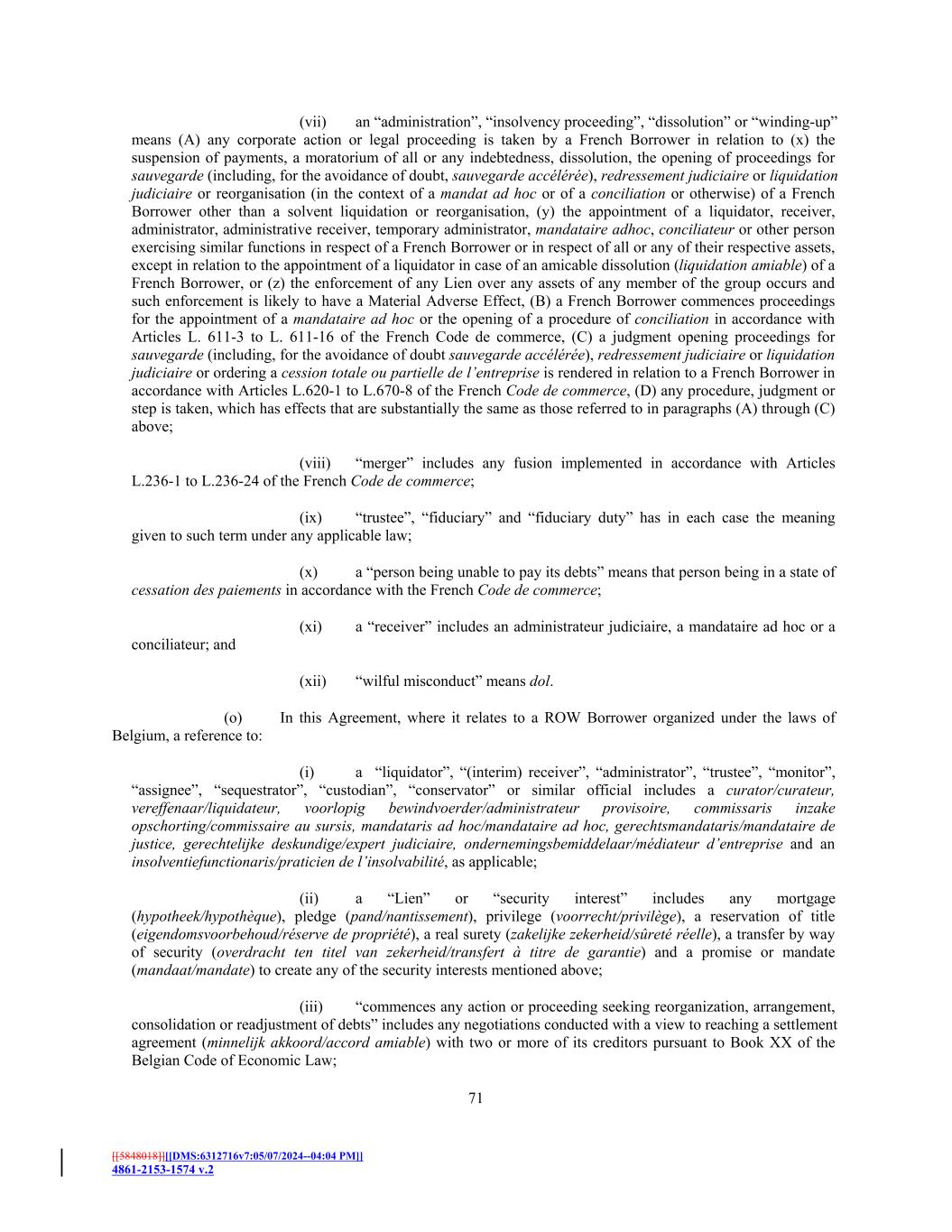(vii) an “administration”, “insolvency proceeding”, “dissolution” or “winding-up” means (A) any corporate action or legal proceeding is taken by a French Borrower in relation to (x) the suspension of payments, a moratorium of all or any indebtedness, dissolution, the opening of proceedings for sauvegarde (including, for the avoidance of doubt, sauvegarde accélérée), redressement judiciaire or liquidation judiciaire or reorganisation (in the context of a mandat ad hoc or of a conciliation or otherwise) of a French Borrower other than a solvent liquidation or reorganisation, (y) the appointment of a liquidator, receiver, administrator, administrative receiver, temporary administrator, mandataire adhoc, conciliateur or other person exercising similar functions in respect of a French Borrower or in respect of all or any of their respective assets, except in relation to the appointment of a liquidator in case of an amicable dissolution (liquidation amiable) of a French Borrower, or (z) the enforcement of any Lien over any assets of any member of the group occurs and such enforcement is likely to have a Material Adverse Effect, (B) a French Borrower commences proceedings for the appointment of a mandataire ad hoc or the opening of a procedure of conciliation in accordance with Articles L. 611-3 to L. 611-16 of the French Code de commerce, (C) a judgment opening proceedings for sauvegarde (including, for the avoidance of doubt sauvegarde accélérée), redressement judiciaire or liquidation judiciaire or ordering a cession totale ou partielle de l’entreprise is rendered in relation to a French Borrower in accordance with Articles L.620-1 to L.670-8 of the French Code de commerce, (D) any procedure, judgment or step is taken, which has effects that are substantially the same as those referred to in paragraphs (A) through (C) above; (viii) “merger” includes any fusion implemented in accordance with Articles L.236-1 to L.236-24 of the French Code de commerce; (ix) “trustee”, “fiduciary” and “fiduciary duty” has in each case the meaning given to such term under any applicable law; (x) a “person being unable to pay its debts” means that person being in a state of cessation des paiements in accordance with the French Code de commerce; (xi) a “receiver” includes an administrateur judiciaire, a mandataire ad hoc or a conciliateur; and (xii) “wilful misconduct” means dol. (o) In this Agreement, where it relates to a ROW Borrower organized under the laws of Belgium, a reference to: (i) a “liquidator”, “(interim) receiver”, “administrator”, “trustee”, “monitor”, “assignee”, “sequestrator”, “custodian”, “conservator” or similar official includes a curator/curateur, vereffenaar/liquidateur, voorlopig bewindvoerder/administrateur provisoire, commissaris inzake opschorting/commissaire au sursis, mandataris ad hoc/mandataire ad hoc, gerechtsmandataris/mandataire de justice, gerechtelijke deskundige/expert judiciaire, ondernemingsbemiddelaar/médiateur d’entreprise and an insolventiefunctionaris/praticien de l’insolvabilité, as applicable; (ii) a “Lien” or “security interest” includes any mortgage (hypotheek/hypothèque), pledge (pand/nantissement), privilege (voorrecht/privilège), a reservation of title (eigendomsvoorbehoud/réserve de propriété), a real surety (zakelijke zekerheid/sûreté réelle), a transfer by way of security (overdracht ten titel van zekerheid/transfert à titre de garantie) and a promise or mandate (mandaat/mandate) to create any of the security interests mentioned above; (iii) “commences any action or proceeding seeking reorganization, arrangement, consolidation or readjustment of debts” includes any negotiations conducted with a view to reaching a settlement agreement (minnelijk akkoord/accord amiable) with two or more of its creditors pursuant to Book XX of the Belgian Code of Economic Law; 71 [[5848018]][[DMS:6312716v7:05/07/2024--04:04 PM]] 4861-2153-1574 v.2