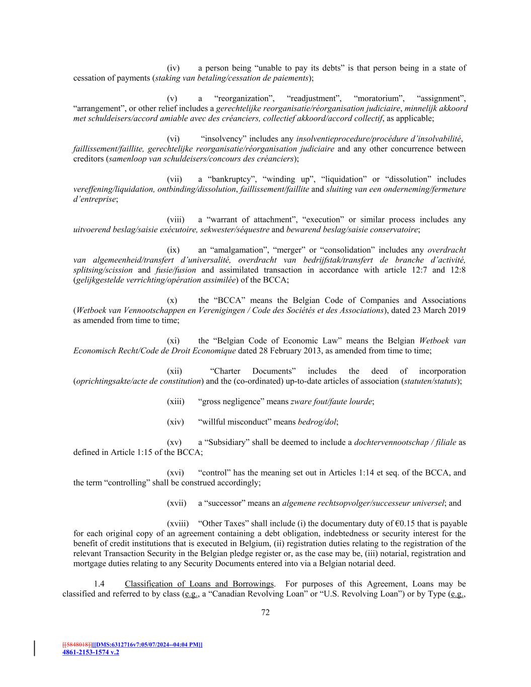 (iv) a person being “unable to pay its debts” is that person being in a state of cessation of payments (staking van betaling/cessation de paiements); (v) a “reorganization”, “readjustment”, “moratorium”, “assignment”, “arrangement”, or other relief includes a gerechtelijke reorganisatie/réorganisation judiciaire, minnelijk akkoord met schuldeisers/accord amiable avec des créanciers, collectief akkoord/accord collectif, as applicable; (vi) “insolvency” includes any insolventieprocedure/procédure d’insolvabilité, faillissement/faillite, gerechtelijke reorganisatie/réorganisation judiciaire and any other concurrence between creditors (samenloop van schuldeisers/concours des créanciers); (vii) a “bankruptcy”, “winding up”, “liquidation” or “dissolution” includes vereffening/liquidation, ontbinding/dissolution, faillissement/faillite and sluiting van een onderneming/fermeture d’entreprise; (viii) a “warrant of attachment”, “execution” or similar process includes any uitvoerend beslag/saisie exécutoire, sekwester/séquestre and bewarend beslag/saisie conservatoire; (ix) an “amalgamation”, “merger” or “consolidation” includes any overdracht van algemeenheid/transfert d’universalité, overdracht van bedrijfstak/transfert de branche d’activité, splitsing/scission and fusie/fusion and assimilated transaction in accordance with article 12:7 and 12:8 (gelijkgestelde verrichting/opération assimilée) of the BCCA; (x) the “BCCA” means the Belgian Code of Companies and Associations (Wetboek van Vennootschappen en Verenigingen / Code des Sociétés et des Associations), dated 23 March 2019 as amended from time to time; (xi) the “Belgian Code of Economic Law” means the Belgian Wetboek van Economisch Recht/Code de Droit Economique dated 28 February 2013, as amended from time to time; (xii) “Charter Documents” includes the deed of incorporation (oprichtingsakte/acte de constitution) and the (co-ordinated) up-to-date articles of association (statuten/statuts); (xiii) “gross negligence” means zware fout/faute lourde; (xiv) “willful misconduct” means bedrog/dol; (xv) a “Subsidiary” shall be deemed to include a dochtervennootschap / filiale as defined in Article 1:15 of the BCCA; (xvi) “control” has the meaning set out in Articles 1:14 et seq. of the BCCA, and the term “controlling” shall be construed accordingly; (xvii) a “successor” means an algemene rechtsopvolger/successeur universel; and (xviii) “Other Taxes” shall include (i) the documentary duty of €0.15 that is payable for each original copy of an agreement containing a debt obligation, indebtedness or security interest for the benefit of credit institutions that is executed in Belgium, (ii) registration duties relating to the registration of the relevant Transaction Security in the Belgian pledge register or, as the case may be, (iii) notarial, registration and mortgage duties relating to any Security Documents entered into via a Belgian notarial deed. 1.4 Classification of Loans and Borrowings. For purposes of this Agreement, Loans may be classified and referred to by class (e.g., a “Canadian Revolving Loan” or “U.S. Revolving Loan”) or by Type (e.g., 72 [[5848018]][[DMS:6312716v7:05/07/2024--04:04 PM]] 4861-2153-1574 v.2