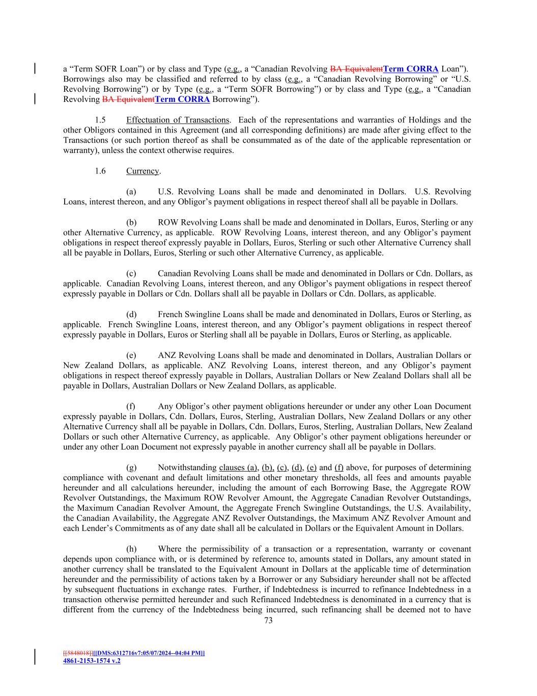 a “Term SOFR Loan”) or by class and Type (e.g., a “Canadian Revolving BA EquivalentTerm CORRA Loan”). Borrowings also may be classified and referred to by class (e.g., a “Canadian Revolving Borrowing” or “U.S. Revolving Borrowing”) or by Type (e.g., a “Term SOFR Borrowing”) or by class and Type (e.g., a “Canadian Revolving BA EquivalentTerm CORRA Borrowing”). 1.5 Effectuation of Transactions. Each of the representations and warranties of Holdings and the other Obligors contained in this Agreement (and all corresponding definitions) are made after giving effect to the Transactions (or such portion thereof as shall be consummated as of the date of the applicable representation or warranty), unless the context otherwise requires. 1.6 Currency. (a) U.S. Revolving Loans shall be made and denominated in Dollars. U.S. Revolving Loans, interest thereon, and any Obligor’s payment obligations in respect thereof shall all be payable in Dollars. (b) ROW Revolving Loans shall be made and denominated in Dollars, Euros, Sterling or any other Alternative Currency, as applicable. ROW Revolving Loans, interest thereon, and any Obligor’s payment obligations in respect thereof expressly payable in Dollars, Euros, Sterling or such other Alternative Currency shall all be payable in Dollars, Euros, Sterling or such other Alternative Currency, as applicable. (c) Canadian Revolving Loans shall be made and denominated in Dollars or Cdn. Dollars, as applicable. Canadian Revolving Loans, interest thereon, and any Obligor’s payment obligations in respect thereof expressly payable in Dollars or Cdn. Dollars shall all be payable in Dollars or Cdn. Dollars, as applicable. (d) French Swingline Loans shall be made and denominated in Dollars, Euros or Sterling, as applicable. French Swingline Loans, interest thereon, and any Obligor’s payment obligations in respect thereof expressly payable in Dollars, Euros or Sterling shall all be payable in Dollars, Euros or Sterling, as applicable. (e) ANZ Revolving Loans shall be made and denominated in Dollars, Australian Dollars or New Zealand Dollars, as applicable. ANZ Revolving Loans, interest thereon, and any Obligor’s payment obligations in respect thereof expressly payable in Dollars, Australian Dollars or New Zealand Dollars shall all be payable in Dollars, Australian Dollars or New Zealand Dollars, as applicable. (f) Any Obligor’s other payment obligations hereunder or under any other Loan Document expressly payable in Dollars, Cdn. Dollars, Euros, Sterling, Australian Dollars, New Zealand Dollars or any other Alternative Currency shall all be payable in Dollars, Cdn. Dollars, Euros, Sterling, Australian Dollars, New Zealand Dollars or such other Alternative Currency, as applicable. Any Obligor’s other payment obligations hereunder or under any other Loan Document not expressly payable in another currency shall all be payable in Dollars. (g) Notwithstanding clauses (a), (b), (c), (d), (e) and (f) above, for purposes of determining compliance with covenant and default limitations and other monetary thresholds, all fees and amounts payable hereunder and all calculations hereunder, including the amount of each Borrowing Base, the Aggregate ROW Revolver Outstandings, the Maximum ROW Revolver Amount, the Aggregate Canadian Revolver Outstandings, the Maximum Canadian Revolver Amount, the Aggregate French Swingline Outstandings, the U.S. Availability, the Canadian Availability, the Aggregate ANZ Revolver Outstandings, the Maximum ANZ Revolver Amount and each Lender’s Commitments as of any date shall all be calculated in Dollars or the Equivalent Amount in Dollars. (h) Where the permissibility of a transaction or a representation, warranty or covenant depends upon compliance with, or is determined by reference to, amounts stated in Dollars, any amount stated in another currency shall be translated to the Equivalent Amount in Dollars at the applicable time of determination hereunder and the permissibility of actions taken by a Borrower or any Subsidiary hereunder shall not be affected by subsequent fluctuations in exchange rates. Further, if Indebtedness is incurred to refinance Indebtedness in a transaction otherwise permitted hereunder and such Refinanced Indebtedness is denominated in a currency that is different from the currency of the Indebtedness being incurred, such refinancing shall be deemed not to have 73 [[5848018]][[DMS:6312716v7:05/07/2024--04:04 PM]] 4861-2153-1574 v.2