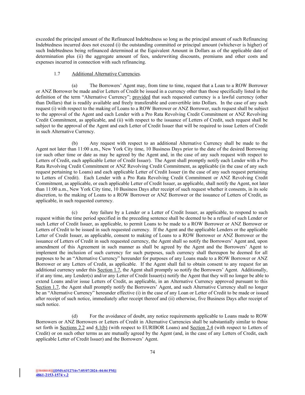 exceeded the principal amount of the Refinanced Indebtedness so long as the principal amount of such Refinancing Indebtedness incurred does not exceed (i) the outstanding committed or principal amount (whichever is higher) of such Indebtedness being refinanced determined at the Equivalent Amount in Dollars as of the applicable date of determination plus (ii) the aggregate amount of fees, underwriting discounts, premiums and other costs and expenses incurred in connection with such refinancing. 1.7 Additional Alternative Currencies. (a) The Borrowers’ Agent may, from time to time, request that a Loan to a ROW Borrower or ANZ Borrower be made and/or Letters of Credit be issued in a currency other than those specifically listed in the definition of the term “Alternative Currency”; provided that such requested currency is a lawful currency (other than Dollars) that is readily available and freely transferable and convertible into Dollars. In the case of any such request (i) with respect to the making of Loans to a ROW Borrower or ANZ Borrower, such request shall be subject to the approval of the Agent and each Lender with a Pro Rata Revolving Credit Commitment or ANZ Revolving Credit Commitment, as applicable, and (ii) with respect to the issuance of Letters of Credit, such request shall be subject to the approval of the Agent and each Letter of Credit Issuer that will be required to issue Letters of Credit in such Alternative Currency. (b) Any request with respect to an additional Alternative Currency shall be made to the Agent not later than 11:00 a.m., New York City time, 10 Business Days prior to the date of the desired Borrowing (or such other time or date as may be agreed by the Agent and, in the case of any such request with respect to Letters of Credit, each applicable Letter of Credit Issuer). The Agent shall promptly notify each Lender with a Pro Rata Revolving Credit Commitment or ANZ Revolving Credit Commitment, as applicable (in the case of any such request pertaining to Loans) and each applicable Letter of Credit Issuer (in the case of any such request pertaining to Letters of Credit). Each Lender with a Pro Rata Revolving Credit Commitment or ANZ Revolving Credit Commitment, as applicable, or each applicable Letter of Credit Issuer, as applicable, shall notify the Agent, not later than 11:00 a.m., New York City time, 10 Business Days after receipt of such request whether it consents, in its sole discretion, to the making of Loans to a ROW Borrower or ANZ Borrower or the issuance of Letters of Credit, as applicable, in such requested currency. (c) Any failure by a Lender or a Letter of Credit Issuer, as applicable, to respond to such request within the time period specified in the preceding sentence shall be deemed to be a refusal of such Lender or such Letter of Credit Issuer, as applicable, to permit Loans to be made to a ROW Borrower or ANZ Borrower or Letters of Credit to be issued in such requested currency. If the Agent and the applicable Lenders or the applicable Letter of Credit Issuer, as applicable, consent to making of Loans to a ROW Borrower or ANZ Borrower or the issuance of Letters of Credit in such requested currency, the Agent shall so notify the Borrowers’ Agent and, upon amendment of this Agreement in such manner as shall be agreed by the Agent and the Borrowers’ Agent to implement the inclusion of such currency for such purposes, such currency shall thereupon be deemed for all purposes to be an “Alternative Currency” hereunder for purposes of any Loans made to a ROW Borrower or ANZ Borrower or any Letters of Credit, as applicable. If the Agent shall fail to obtain consent to any request for an additional currency under this Section 1.7, the Agent shall promptly so notify the Borrowers’ Agent. Additionally, if at any time, any Lender(s) and/or any Letter of Credit Issuer(s) notify the Agent that they will no longer be able to extend Loans and/or issue Letters of Credit, as applicable, in an Alternative Currency approved pursuant to this Section 1.7, the Agent shall promptly notify the Borrowers’ Agent, and such Alternative Currency shall no longer be an “Alternative Currency” hereunder effective (i) in the case of any Loan or Letter of Credit to be made or issued after receipt of such notice, immediately after receipt thereof and (ii) otherwise, five Business Days after receipt of such notice. (d) For the avoidance of doubt, any notice requirements applicable to Loans made to ROW Borrowers or ANZ Borrowers or Letters of Credit in Alternative Currencies shall be substantially similar to those set forth in Sections 2.2 and 4.1(b) (with respect to EURIBOR Loans) and Section 2.4 (with respect to Letters of Credit) or on such other terms as are mutually agreed by the Agent (and, in the case of any Letters of Credit, each applicable Letter of Credit Issuer) and the Borrowers’ Agent. 74 [[5848018]][[DMS:6312716v7:05/07/2024--04:04 PM]] 4861-2153-1574 v.2
