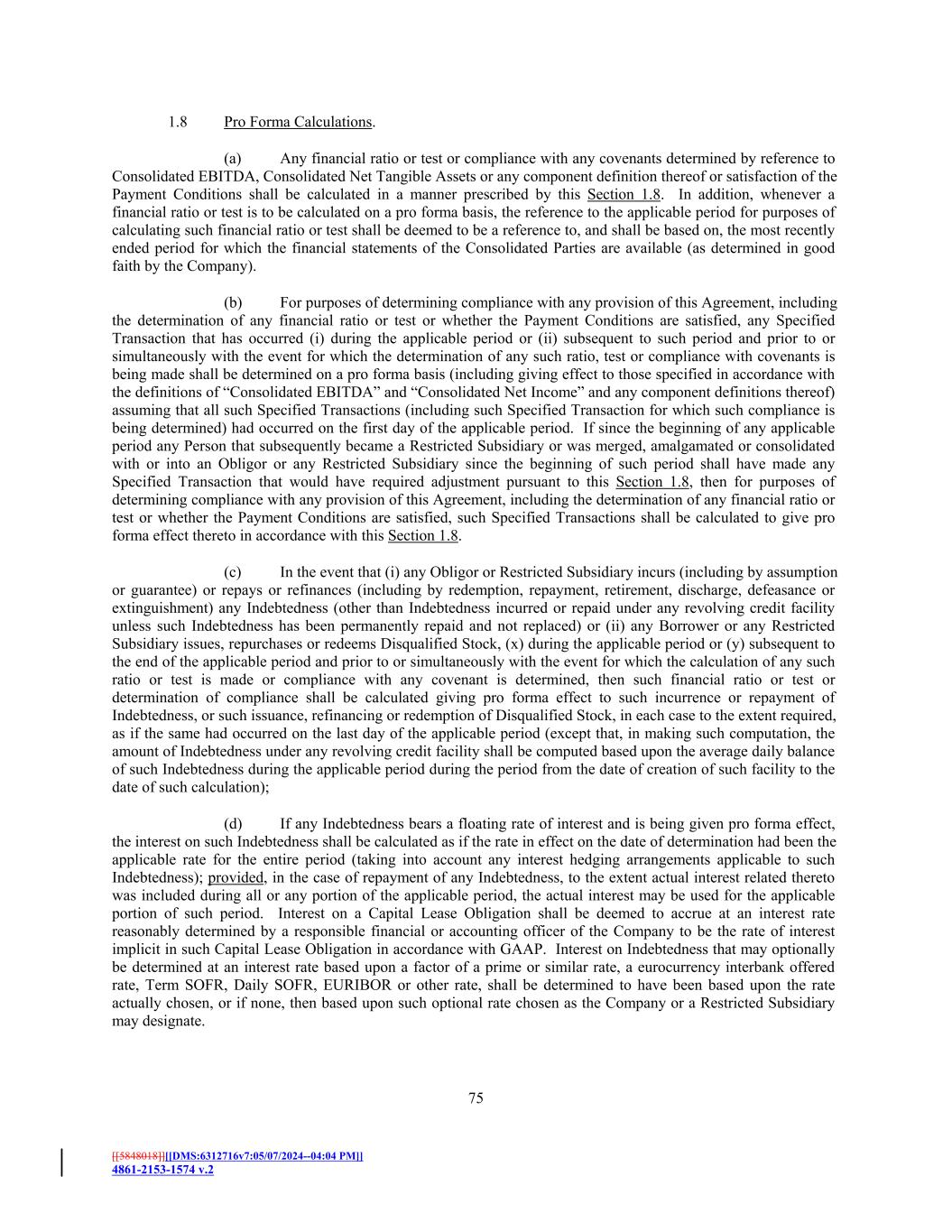 1.8 Pro Forma Calculations. (a) Any financial ratio or test or compliance with any covenants determined by reference to Consolidated EBITDA, Consolidated Net Tangible Assets or any component definition thereof or satisfaction of the Payment Conditions shall be calculated in a manner prescribed by this Section 1.8. In addition, whenever a financial ratio or test is to be calculated on a pro forma basis, the reference to the applicable period for purposes of calculating such financial ratio or test shall be deemed to be a reference to, and shall be based on, the most recently ended period for which the financial statements of the Consolidated Parties are available (as determined in good faith by the Company). (b) For purposes of determining compliance with any provision of this Agreement, including the determination of any financial ratio or test or whether the Payment Conditions are satisfied, any Specified Transaction that has occurred (i) during the applicable period or (ii) subsequent to such period and prior to or simultaneously with the event for which the determination of any such ratio, test or compliance with covenants is being made shall be determined on a pro forma basis (including giving effect to those specified in accordance with the definitions of “Consolidated EBITDA” and “Consolidated Net Income” and any component definitions thereof) assuming that all such Specified Transactions (including such Specified Transaction for which such compliance is being determined) had occurred on the first day of the applicable period. If since the beginning of any applicable period any Person that subsequently became a Restricted Subsidiary or was merged, amalgamated or consolidated with or into an Obligor or any Restricted Subsidiary since the beginning of such period shall have made any Specified Transaction that would have required adjustment pursuant to this Section 1.8, then for purposes of determining compliance with any provision of this Agreement, including the determination of any financial ratio or test or whether the Payment Conditions are satisfied, such Specified Transactions shall be calculated to give pro forma effect thereto in accordance with this Section 1.8. (c) In the event that (i) any Obligor or Restricted Subsidiary incurs (including by assumption or guarantee) or repays or refinances (including by redemption, repayment, retirement, discharge, defeasance or extinguishment) any Indebtedness (other than Indebtedness incurred or repaid under any revolving credit facility unless such Indebtedness has been permanently repaid and not replaced) or (ii) any Borrower or any Restricted Subsidiary issues, repurchases or redeems Disqualified Stock, (x) during the applicable period or (y) subsequent to the end of the applicable period and prior to or simultaneously with the event for which the calculation of any such ratio or test is made or compliance with any covenant is determined, then such financial ratio or test or determination of compliance shall be calculated giving pro forma effect to such incurrence or repayment of Indebtedness, or such issuance, refinancing or redemption of Disqualified Stock, in each case to the extent required, as if the same had occurred on the last day of the applicable period (except that, in making such computation, the amount of Indebtedness under any revolving credit facility shall be computed based upon the average daily balance of such Indebtedness during the applicable period during the period from the date of creation of such facility to the date of such calculation); (d) If any Indebtedness bears a floating rate of interest and is being given pro forma effect, the interest on such Indebtedness shall be calculated as if the rate in effect on the date of determination had been the applicable rate for the entire period (taking into account any interest hedging arrangements applicable to such Indebtedness); provided, in the case of repayment of any Indebtedness, to the extent actual interest related thereto was included during all or any portion of the applicable period, the actual interest may be used for the applicable portion of such period. Interest on a Capital Lease Obligation shall be deemed to accrue at an interest rate reasonably determined by a responsible financial or accounting officer of the Company to be the rate of interest implicit in such Capital Lease Obligation in accordance with GAAP. Interest on Indebtedness that may optionally be determined at an interest rate based upon a factor of a prime or similar rate, a eurocurrency interbank offered rate, Term SOFR, Daily SOFR, EURIBOR or other rate, shall be determined to have been based upon the rate actually chosen, or if none, then based upon such optional rate chosen as the Company or a Restricted Subsidiary may designate. 75 [[5848018]][[DMS:6312716v7:05/07/2024--04:04 PM]] 4861-2153-1574 v.2