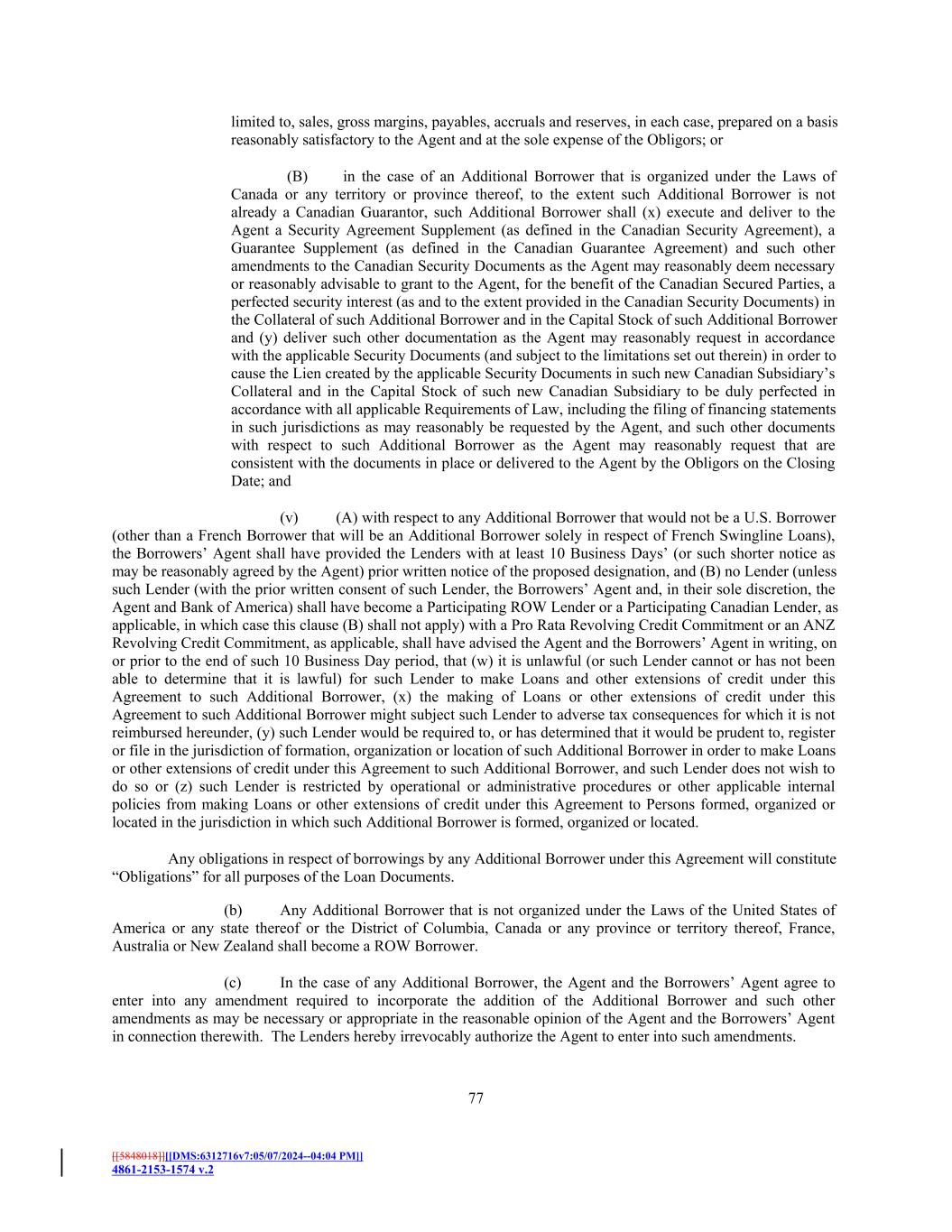 limited to, sales, gross margins, payables, accruals and reserves, in each case, prepared on a basis reasonably satisfactory to the Agent and at the sole expense of the Obligors; or (B) in the case of an Additional Borrower that is organized under the Laws of Canada or any territory or province thereof, to the extent such Additional Borrower is not already a Canadian Guarantor, such Additional Borrower shall (x) execute and deliver to the Agent a Security Agreement Supplement (as defined in the Canadian Security Agreement), a Guarantee Supplement (as defined in the Canadian Guarantee Agreement) and such other amendments to the Canadian Security Documents as the Agent may reasonably deem necessary or reasonably advisable to grant to the Agent, for the benefit of the Canadian Secured Parties, a perfected security interest (as and to the extent provided in the Canadian Security Documents) in the Collateral of such Additional Borrower and in the Capital Stock of such Additional Borrower and (y) deliver such other documentation as the Agent may reasonably request in accordance with the applicable Security Documents (and subject to the limitations set out therein) in order to cause the Lien created by the applicable Security Documents in such new Canadian Subsidiary’s Collateral and in the Capital Stock of such new Canadian Subsidiary to be duly perfected in accordance with all applicable Requirements of Law, including the filing of financing statements in such jurisdictions as may reasonably be requested by the Agent, and such other documents with respect to such Additional Borrower as the Agent may reasonably request that are consistent with the documents in place or delivered to the Agent by the Obligors on the Closing Date; and (v) (A) with respect to any Additional Borrower that would not be a U.S. Borrower (other than a French Borrower that will be an Additional Borrower solely in respect of French Swingline Loans), the Borrowers’ Agent shall have provided the Lenders with at least 10 Business Days’ (or such shorter notice as may be reasonably agreed by the Agent) prior written notice of the proposed designation, and (B) no Lender (unless such Lender (with the prior written consent of such Lender, the Borrowers’ Agent and, in their sole discretion, the Agent and Bank of America) shall have become a Participating ROW Lender or a Participating Canadian Lender, as applicable, in which case this clause (B) shall not apply) with a Pro Rata Revolving Credit Commitment or an ANZ Revolving Credit Commitment, as applicable, shall have advised the Agent and the Borrowers’ Agent in writing, on or prior to the end of such 10 Business Day period, that (w) it is unlawful (or such Lender cannot or has not been able to determine that it is lawful) for such Lender to make Loans and other extensions of credit under this Agreement to such Additional Borrower, (x) the making of Loans or other extensions of credit under this Agreement to such Additional Borrower might subject such Lender to adverse tax consequences for which it is not reimbursed hereunder, (y) such Lender would be required to, or has determined that it would be prudent to, register or file in the jurisdiction of formation, organization or location of such Additional Borrower in order to make Loans or other extensions of credit under this Agreement to such Additional Borrower, and such Lender does not wish to do so or (z) such Lender is restricted by operational or administrative procedures or other applicable internal policies from making Loans or other extensions of credit under this Agreement to Persons formed, organized or located in the jurisdiction in which such Additional Borrower is formed, organized or located. Any obligations in respect of borrowings by any Additional Borrower under this Agreement will constitute “Obligations” for all purposes of the Loan Documents. (b) Any Additional Borrower that is not organized under the Laws of the United States of America or any state thereof or the District of Columbia, Canada or any province or territory thereof, France, Australia or New Zealand shall become a ROW Borrower. (c) In the case of any Additional Borrower, the Agent and the Borrowers’ Agent agree to enter into any amendment required to incorporate the addition of the Additional Borrower and such other amendments as may be necessary or appropriate in the reasonable opinion of the Agent and the Borrowers’ Agent in connection therewith. The Lenders hereby irrevocably authorize the Agent to enter into such amendments. 77 [[5848018]][[DMS:6312716v7:05/07/2024--04:04 PM]] 4861-2153-1574 v.2