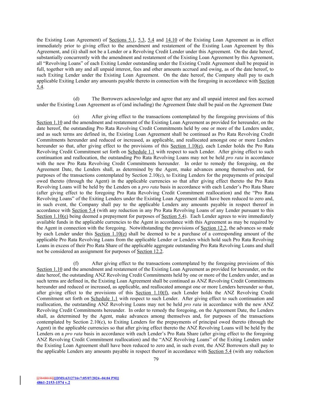 the Existing Loan Agreement) of Sections 5.1, 5.3, 5.4 and 14.10 of the Existing Loan Agreement as in effect immediately prior to giving effect to the amendment and restatement of the Existing Loan Agreement by this Agreement, and (ii) shall not be a Lender or a Revolving Credit Lender under this Agreement. On the date hereof, substantially concurrently with the amendment and restatement of the Existing Loan Agreement by this Agreement, all “Revolving Loans” of each Exiting Lender outstanding under the Existing Credit Agreement shall be prepaid in full, together with any and all unpaid interest, fees and other amounts accrued and owing, as of the date hereof, to such Exiting Lender under the Existing Loan Agreement. On the date hereof, the Company shall pay to each applicable Exiting Lender any amounts payable thereto in connection with the foregoing in accordance with Section 5.4. (d) The Borrowers acknowledge and agree that any and all unpaid interest and fees accrued under the Existing Loan Agreement as of (and including) the Agreement Date shall be paid on the Agreement Date (e) After giving effect to the transactions contemplated by the foregoing provisions of this Section 1.10 and the amendment and restatement of the Existing Loan Agreement as provided for hereunder, on the date hereof, the outstanding Pro Rata Revolving Credit Commitments held by one or more of the Lenders under, and as such terms are defined in, the Existing Loan Agreement shall be continued as Pro Rata Revolving Credit Commitments hereunder and reduced or increased, as applicable, and reallocated amongst one or more Lenders hereunder so that, after giving effect to the provisions of this Section 1.10(e), each Lender holds the Pro Rata Revolving Credit Commitment set forth on Schedule 1.1 with respect to such Lender. After giving effect to such continuation and reallocation, the outstanding Pro Rata Revolving Loans may not be held pro rata in accordance with the new Pro Rata Revolving Credit Commitments hereunder. In order to remedy the foregoing, on the Agreement Date, the Lenders shall, as determined by the Agent, make advances among themselves and, for purposes of the transactions contemplated by Section 2.10(c), to Exiting Lenders for the prepayments of principal owed thereto (through the Agent) in the applicable currencies so that after giving effect thereto the Pro Rata Revolving Loans will be held by the Lenders on a pro rata basis in accordance with each Lender’s Pro Rata Share (after giving effect to the foregoing Pro Rata Revolving Credit Commitment reallocation) and the “Pro Rata Revolving Loans” of the Exiting Lenders under the Existing Loan Agreement shall have been reduced to zero and, in such event, the Company shall pay to the applicable Lenders any amounts payable in respect thereof in accordance with Section 5.4 (with any reduction in any Pro Rata Revolving Loans of any Lender pursuant to this Section 1.10(e) being deemed a prepayment for purposes of Section 5.4). Each Lender agrees to wire immediately available funds in the applicable currencies to the Agent in accordance with this Agreement as may be required by the Agent in connection with the foregoing. Notwithstanding the provisions of Section 12.2, the advances so made by each Lender under this Section 1.10(e) shall be deemed to be a purchase of a corresponding amount of the applicable Pro Rata Revolving Loans from the applicable Lender or Lenders which hold such Pro Rata Revolving Loans in excess of their Pro Rata Share of the applicable aggregate outstanding Pro Rata Revolving Loans and shall not be considered an assignment for purposes of Section 12.2. (f) After giving effect to the transactions contemplated by the foregoing provisions of this Section 1.10 and the amendment and restatement of the Existing Loan Agreement as provided for hereunder, on the date hereof, the outstanding ANZ Revolving Credit Commitments held by one or more of the Lenders under, and as such terms are defined in, the Existing Loan Agreement shall be continued as ANZ Revolving Credit Commitments hereunder and reduced or increased, as applicable, and reallocated amongst one or more Lenders hereunder so that, after giving effect to the provisions of this Section 1.10(f), each Lender holds the ANZ Revolving Credit Commitment set forth on Schedule 1.1 with respect to such Lender. After giving effect to such continuation and reallocation, the outstanding ANZ Revolving Loans may not be held pro rata in accordance with the new ANZ Revolving Credit Commitments hereunder. In order to remedy the foregoing, on the Agreement Date, the Lenders shall, as determined by the Agent, make advances among themselves and, for purposes of the transactions contemplated by Section 2.10(c), to Exiting Lenders for the prepayments of principal owed thereto (through the Agent) in the applicable currencies so that after giving effect thereto the ANZ Revolving Loans will be held by the Lenders on a pro rata basis in accordance with each Lender’s Pro Rata Share (after giving effect to the foregoing ANZ Revolving Credit Commitment reallocation) and the “ANZ Revolving Loans” of the Exiting Lenders under the Existing Loan Agreement shall have been reduced to zero and, in such event, the ANZ Borrowers shall pay to the applicable Lenders any amounts payable in respect thereof in accordance with Section 5.4 (with any reduction 79 [[5848018]][[DMS:6312716v7:05/07/2024--04:04 PM]] 4861-2153-1574 v.2