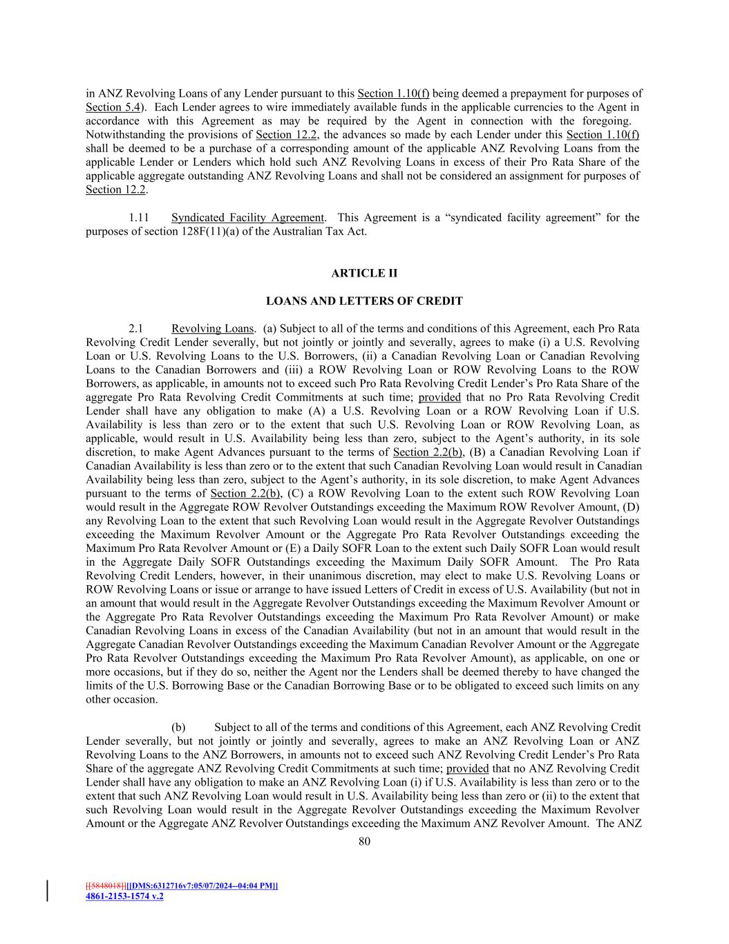 in ANZ Revolving Loans of any Lender pursuant to this Section 1.10(f) being deemed a prepayment for purposes of Section 5.4). Each Lender agrees to wire immediately available funds in the applicable currencies to the Agent in accordance with this Agreement as may be required by the Agent in connection with the foregoing. Notwithstanding the provisions of Section 12.2, the advances so made by each Lender under this Section 1.10(f) shall be deemed to be a purchase of a corresponding amount of the applicable ANZ Revolving Loans from the applicable Lender or Lenders which hold such ANZ Revolving Loans in excess of their Pro Rata Share of the applicable aggregate outstanding ANZ Revolving Loans and shall not be considered an assignment for purposes of Section 12.2. 1.11 Syndicated Facility Agreement. This Agreement is a “syndicated facility agreement” for the purposes of section 128F(11)(a) of the Australian Tax Act. ARTICLE II LOANS AND LETTERS OF CREDIT 2.1 Revolving Loans. (a) Subject to all of the terms and conditions of this Agreement, each Pro Rata Revolving Credit Lender severally, but not jointly or jointly and severally, agrees to make (i) a U.S. Revolving Loan or U.S. Revolving Loans to the U.S. Borrowers, (ii) a Canadian Revolving Loan or Canadian Revolving Loans to the Canadian Borrowers and (iii) a ROW Revolving Loan or ROW Revolving Loans to the ROW Borrowers, as applicable, in amounts not to exceed such Pro Rata Revolving Credit Lender’s Pro Rata Share of the aggregate Pro Rata Revolving Credit Commitments at such time; provided that no Pro Rata Revolving Credit Lender shall have any obligation to make (A) a U.S. Revolving Loan or a ROW Revolving Loan if U.S. Availability is less than zero or to the extent that such U.S. Revolving Loan or ROW Revolving Loan, as applicable, would result in U.S. Availability being less than zero, subject to the Agent’s authority, in its sole discretion, to make Agent Advances pursuant to the terms of Section 2.2(b), (B) a Canadian Revolving Loan if Canadian Availability is less than zero or to the extent that such Canadian Revolving Loan would result in Canadian Availability being less than zero, subject to the Agent’s authority, in its sole discretion, to make Agent Advances pursuant to the terms of Section 2.2(b), (C) a ROW Revolving Loan to the extent such ROW Revolving Loan would result in the Aggregate ROW Revolver Outstandings exceeding the Maximum ROW Revolver Amount, (D) any Revolving Loan to the extent that such Revolving Loan would result in the Aggregate Revolver Outstandings exceeding the Maximum Revolver Amount or the Aggregate Pro Rata Revolver Outstandings exceeding the Maximum Pro Rata Revolver Amount or (E) a Daily SOFR Loan to the extent such Daily SOFR Loan would result in the Aggregate Daily SOFR Outstandings exceeding the Maximum Daily SOFR Amount. The Pro Rata Revolving Credit Lenders, however, in their unanimous discretion, may elect to make U.S. Revolving Loans or ROW Revolving Loans or issue or arrange to have issued Letters of Credit in excess of U.S. Availability (but not in an amount that would result in the Aggregate Revolver Outstandings exceeding the Maximum Revolver Amount or the Aggregate Pro Rata Revolver Outstandings exceeding the Maximum Pro Rata Revolver Amount) or make Canadian Revolving Loans in excess of the Canadian Availability (but not in an amount that would result in the Aggregate Canadian Revolver Outstandings exceeding the Maximum Canadian Revolver Amount or the Aggregate Pro Rata Revolver Outstandings exceeding the Maximum Pro Rata Revolver Amount), as applicable, on one or more occasions, but if they do so, neither the Agent nor the Lenders shall be deemed thereby to have changed the limits of the U.S. Borrowing Base or the Canadian Borrowing Base or to be obligated to exceed such limits on any other occasion. (b) Subject to all of the terms and conditions of this Agreement, each ANZ Revolving Credit Lender severally, but not jointly or jointly and severally, agrees to make an ANZ Revolving Loan or ANZ Revolving Loans to the ANZ Borrowers, in amounts not to exceed such ANZ Revolving Credit Lender’s Pro Rata Share of the aggregate ANZ Revolving Credit Commitments at such time; provided that no ANZ Revolving Credit Lender shall have any obligation to make an ANZ Revolving Loan (i) if U.S. Availability is less than zero or to the extent that such ANZ Revolving Loan would result in U.S. Availability being less than zero or (ii) to the extent that such Revolving Loan would result in the Aggregate Revolver Outstandings exceeding the Maximum Revolver Amount or the Aggregate ANZ Revolver Outstandings exceeding the Maximum ANZ Revolver Amount. The ANZ 80 [[5848018]][[DMS:6312716v7:05/07/2024--04:04 PM]] 4861-2153-1574 v.2