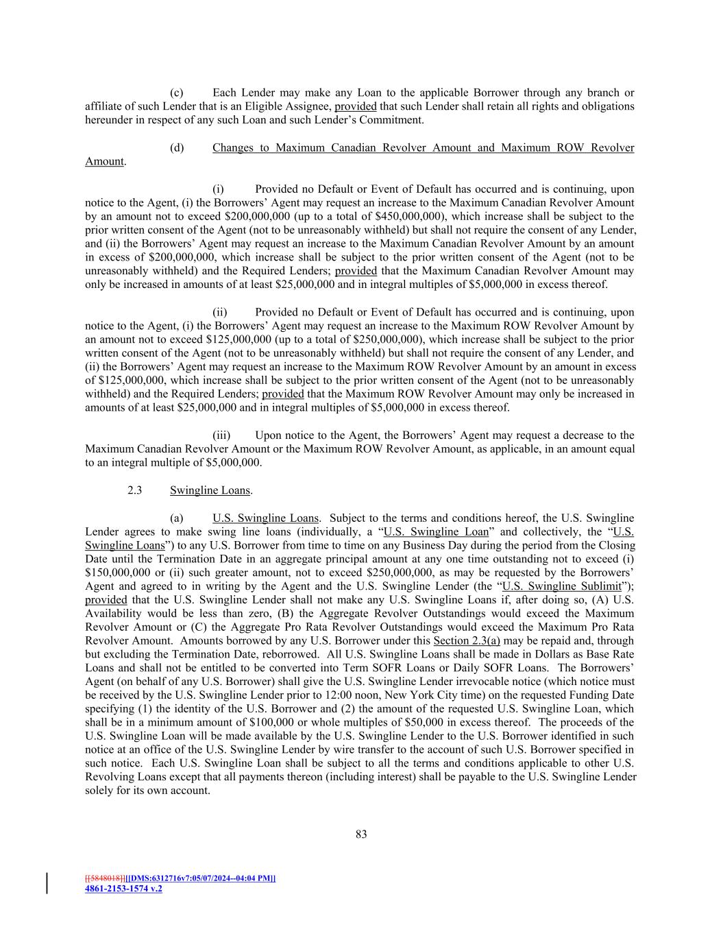 (c) Each Lender may make any Loan to the applicable Borrower through any branch or affiliate of such Lender that is an Eligible Assignee, provided that such Lender shall retain all rights and obligations hereunder in respect of any such Loan and such Lender’s Commitment. (d) Changes to Maximum Canadian Revolver Amount and Maximum ROW Revolver Amount. (i) Provided no Default or Event of Default has occurred and is continuing, upon notice to the Agent, (i) the Borrowers’ Agent may request an increase to the Maximum Canadian Revolver Amount by an amount not to exceed $200,000,000 (up to a total of $450,000,000), which increase shall be subject to the prior written consent of the Agent (not to be unreasonably withheld) but shall not require the consent of any Lender, and (ii) the Borrowers’ Agent may request an increase to the Maximum Canadian Revolver Amount by an amount in excess of $200,000,000, which increase shall be subject to the prior written consent of the Agent (not to be unreasonably withheld) and the Required Lenders; provided that the Maximum Canadian Revolver Amount may only be increased in amounts of at least $25,000,000 and in integral multiples of $5,000,000 in excess thereof. (ii) Provided no Default or Event of Default has occurred and is continuing, upon notice to the Agent, (i) the Borrowers’ Agent may request an increase to the Maximum ROW Revolver Amount by an amount not to exceed $125,000,000 (up to a total of $250,000,000), which increase shall be subject to the prior written consent of the Agent (not to be unreasonably withheld) but shall not require the consent of any Lender, and (ii) the Borrowers’ Agent may request an increase to the Maximum ROW Revolver Amount by an amount in excess of $125,000,000, which increase shall be subject to the prior written consent of the Agent (not to be unreasonably withheld) and the Required Lenders; provided that the Maximum ROW Revolver Amount may only be increased in amounts of at least $25,000,000 and in integral multiples of $5,000,000 in excess thereof. (iii) Upon notice to the Agent, the Borrowers’ Agent may request a decrease to the Maximum Canadian Revolver Amount or the Maximum ROW Revolver Amount, as applicable, in an amount equal to an integral multiple of $5,000,000. 2.3 Swingline Loans. (a) U.S. Swingline Loans. Subject to the terms and conditions hereof, the U.S. Swingline Lender agrees to make swing line loans (individually, a “U.S. Swingline Loan” and collectively, the “U.S. Swingline Loans”) to any U.S. Borrower from time to time on any Business Day during the period from the Closing Date until the Termination Date in an aggregate principal amount at any one time outstanding not to exceed (i) $150,000,000 or (ii) such greater amount, not to exceed $250,000,000, as may be requested by the Borrowers’ Agent and agreed to in writing by the Agent and the U.S. Swingline Lender (the “U.S. Swingline Sublimit”); provided that the U.S. Swingline Lender shall not make any U.S. Swingline Loans if, after doing so, (A) U.S. Availability would be less than zero, (B) the Aggregate Revolver Outstandings would exceed the Maximum Revolver Amount or (C) the Aggregate Pro Rata Revolver Outstandings would exceed the Maximum Pro Rata Revolver Amount. Amounts borrowed by any U.S. Borrower under this Section 2.3(a) may be repaid and, through but excluding the Termination Date, reborrowed. All U.S. Swingline Loans shall be made in Dollars as Base Rate Loans and shall not be entitled to be converted into Term SOFR Loans or Daily SOFR Loans. The Borrowers’ Agent (on behalf of any U.S. Borrower) shall give the U.S. Swingline Lender irrevocable notice (which notice must be received by the U.S. Swingline Lender prior to 12:00 noon, New York City time) on the requested Funding Date specifying (1) the identity of the U.S. Borrower and (2) the amount of the requested U.S. Swingline Loan, which shall be in a minimum amount of $100,000 or whole multiples of $50,000 in excess thereof. The proceeds of the U.S. Swingline Loan will be made available by the U.S. Swingline Lender to the U.S. Borrower identified in such notice at an office of the U.S. Swingline Lender by wire transfer to the account of such U.S. Borrower specified in such notice. Each U.S. Swingline Loan shall be subject to all the terms and conditions applicable to other U.S. Revolving Loans except that all payments thereon (including interest) shall be payable to the U.S. Swingline Lender solely for its own account. 83 [[5848018]][[DMS:6312716v7:05/07/2024--04:04 PM]] 4861-2153-1574 v.2