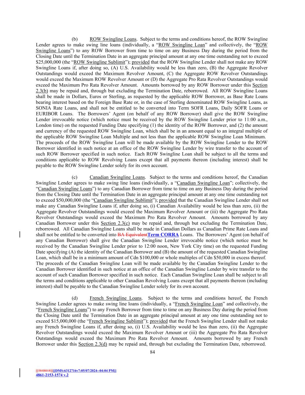 (b) ROW Swingline Loans. Subject to the terms and conditions hereof, the ROW Swingline Lender agrees to make swing line loans (individually, a “ROW Swingline Loan” and collectively, the “ROW Swingline Loans”) to any ROW Borrower from time to time on any Business Day during the period from the Closing Date until the Termination Date in an aggregate principal amount at any one time outstanding not to exceed $25,000,000 (the “ROW Swingline Sublimit”); provided that the ROW Swingline Lender shall not make any ROW Swingline Loans if, after doing so, (A) U.S. Availability would be less than zero, (B) the Aggregate Revolver Outstandings would exceed the Maximum Revolver Amount, (C) the Aggregate ROW Revolver Outstandings would exceed the Maximum ROW Revolver Amount or (D) the Aggregate Pro Rata Revolver Outstandings would exceed the Maximum Pro Rata Revolver Amount. Amounts borrowed by any ROW Borrower under this Section 2.3(b) may be repaid and, through but excluding the Termination Date, reborrowed. All ROW Swingline Loans shall be made in Dollars, Euros or Sterling, as requested by the applicable ROW Borrower, as Base Rate Loans bearing interest based on the Foreign Base Rate or, in the case of Sterling denominated ROW Swingline Loans, as SONIA Rate Loans, and shall not be entitled to be converted into Term SOFR Loans, Daily SOFR Loans or EURIBOR Loans. The Borrowers’ Agent (on behalf of any ROW Borrower) shall give the ROW Swingline Lender irrevocable notice (which notice must be received by the ROW Swingline Lender prior to 11:00 a.m., London time) on the requested Funding Date specifying (1) the identity of the ROW Borrower, and (2) the amount and currency of the requested ROW Swingline Loan, which shall be in an amount equal to an integral multiple of the applicable ROW Swingline Loan Multiple and not less than the applicable ROW Swingline Loan Minimum. The proceeds of the ROW Swingline Loan will be made available by the ROW Swingline Lender to the ROW Borrower identified in such notice at an office of the ROW Swingline Lender by wire transfer to the account of such ROW Borrower specified in such notice. Each ROW Swingline Loan shall be subject to all the terms and conditions applicable to ROW Revolving Loans except that all payments thereon (including interest) shall be payable to the ROW Swingline Lender solely for its own account. (c) Canadian Swingline Loans. Subject to the terms and conditions hereof, the Canadian Swingline Lender agrees to make swing line loans (individually, a “Canadian Swingline Loan”; collectively, the “Canadian Swingline Loans”) to any Canadian Borrower from time to time on any Business Day during the period from the Closing Date until the Termination Date in an aggregate principal amount at any one time outstanding not to exceed $50,000,000 (the “Canadian Swingline Sublimit”); provided that the Canadian Swingline Lender shall not make any Canadian Swingline Loans if, after doing so, (i) Canadian Availability would be less than zero, (ii) the Aggregate Revolver Outstandings would exceed the Maximum Revolver Amount or (iii) the Aggregate Pro Rata Revolver Outstandings would exceed the Maximum Pro Rata Revolver Amount. Amounts borrowed by any Canadian Borrower under this Section 2.3(c) may be repaid and, through but excluding the Termination Date, reborrowed. All Canadian Swingline Loans shall be made in Canadian Dollars as Canadian Prime Rate Loans and shall not be entitled to be converted into BA EquivalentTerm CORRA Loans. The Borrowers’ Agent (on behalf of any Canadian Borrower) shall give the Canadian Swingline Lender irrevocable notice (which notice must be received by the Canadian Swingline Lender prior to 12:00 noon, New York City time) on the requested Funding Date specifying (A) the identity of the Canadian Borrower and (B) the amount of the requested Canadian Swingline Loan, which shall be in a minimum amount of Cdn $100,000 or whole multiples of Cdn $50,000 in excess thereof. The proceeds of the Canadian Swingline Loan will be made available by the Canadian Swingline Lender to the Canadian Borrower identified in such notice at an office of the Canadian Swingline Lender by wire transfer to the account of such Canadian Borrower specified in such notice. Each Canadian Swingline Loan shall be subject to all the terms and conditions applicable to other Canadian Revolving Loans except that all payments thereon (including interest) shall be payable to the Canadian Swingline Lender solely for its own account. (d) French Swingline Loans. Subject to the terms and conditions hereof, the French Swingline Lender agrees to make swing line loans (individually, a “French Swingline Loan” and collectively, the “French Swingline Loans”) to any French Borrower from time to time on any Business Day during the period from the Closing Date until the Termination Date in an aggregate principal amount at any one time outstanding not to exceed $15,000,000 (the “French Swingline Sublimit”); provided that the French Swingline Lender shall not make any French Swingline Loans if, after doing so, (i) U.S. Availability would be less than zero, (ii) the Aggregate Revolver Outstandings would exceed the Maximum Revolver Amount or (iii) the Aggregate Pro Rata Revolver Outstandings would exceed the Maximum Pro Rata Revolver Amount. Amounts borrowed by any French Borrower under this Section 2.3(d) may be repaid and, through but excluding the Termination Date, reborrowed. 84 [[5848018]][[DMS:6312716v7:05/07/2024--04:04 PM]] 4861-2153-1574 v.2