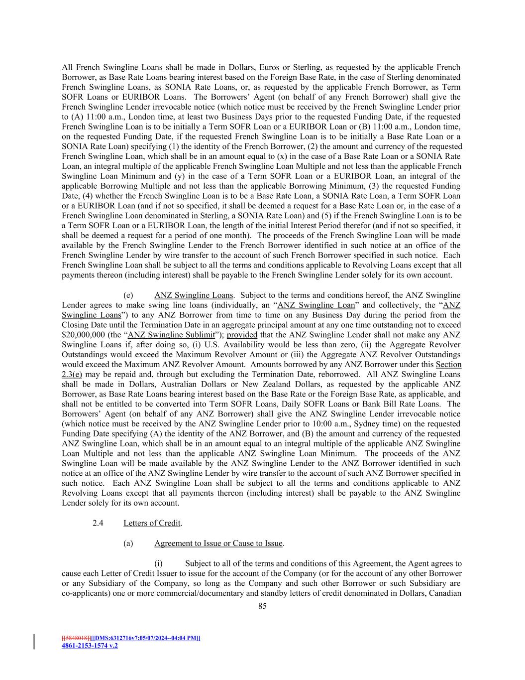 All French Swingline Loans shall be made in Dollars, Euros or Sterling, as requested by the applicable French Borrower, as Base Rate Loans bearing interest based on the Foreign Base Rate, in the case of Sterling denominated French Swingline Loans, as SONIA Rate Loans, or, as requested by the applicable French Borrower, as Term SOFR Loans or EURIBOR Loans. The Borrowers’ Agent (on behalf of any French Borrower) shall give the French Swingline Lender irrevocable notice (which notice must be received by the French Swingline Lender prior to (A) 11:00 a.m., London time, at least two Business Days prior to the requested Funding Date, if the requested French Swingline Loan is to be initially a Term SOFR Loan or a EURIBOR Loan or (B) 11:00 a.m., London time, on the requested Funding Date, if the requested French Swingline Loan is to be initially a Base Rate Loan or a SONIA Rate Loan) specifying (1) the identity of the French Borrower, (2) the amount and currency of the requested French Swingline Loan, which shall be in an amount equal to (x) in the case of a Base Rate Loan or a SONIA Rate Loan, an integral multiple of the applicable French Swingline Loan Multiple and not less than the applicable French Swingline Loan Minimum and (y) in the case of a Term SOFR Loan or a EURIBOR Loan, an integral of the applicable Borrowing Multiple and not less than the applicable Borrowing Minimum, (3) the requested Funding Date, (4) whether the French Swingline Loan is to be a Base Rate Loan, a SONIA Rate Loan, a Term SOFR Loan or a EURIBOR Loan (and if not so specified, it shall be deemed a request for a Base Rate Loan or, in the case of a French Swingline Loan denominated in Sterling, a SONIA Rate Loan) and (5) if the French Swingline Loan is to be a Term SOFR Loan or a EURIBOR Loan, the length of the initial Interest Period therefor (and if not so specified, it shall be deemed a request for a period of one month). The proceeds of the French Swingline Loan will be made available by the French Swingline Lender to the French Borrower identified in such notice at an office of the French Swingline Lender by wire transfer to the account of such French Borrower specified in such notice. Each French Swingline Loan shall be subject to all the terms and conditions applicable to Revolving Loans except that all payments thereon (including interest) shall be payable to the French Swingline Lender solely for its own account. (e) ANZ Swingline Loans. Subject to the terms and conditions hereof, the ANZ Swingline Lender agrees to make swing line loans (individually, an “ANZ Swingline Loan” and collectively, the “ANZ Swingline Loans”) to any ANZ Borrower from time to time on any Business Day during the period from the Closing Date until the Termination Date in an aggregate principal amount at any one time outstanding not to exceed $20,000,000 (the “ANZ Swingline Sublimit”); provided that the ANZ Swingline Lender shall not make any ANZ Swingline Loans if, after doing so, (i) U.S. Availability would be less than zero, (ii) the Aggregate Revolver Outstandings would exceed the Maximum Revolver Amount or (iii) the Aggregate ANZ Revolver Outstandings would exceed the Maximum ANZ Revolver Amount. Amounts borrowed by any ANZ Borrower under this Section 2.3(e) may be repaid and, through but excluding the Termination Date, reborrowed. All ANZ Swingline Loans shall be made in Dollars, Australian Dollars or New Zealand Dollars, as requested by the applicable ANZ Borrower, as Base Rate Loans bearing interest based on the Base Rate or the Foreign Base Rate, as applicable, and shall not be entitled to be converted into Term SOFR Loans, Daily SOFR Loans or Bank Bill Rate Loans. The Borrowers’ Agent (on behalf of any ANZ Borrower) shall give the ANZ Swingline Lender irrevocable notice (which notice must be received by the ANZ Swingline Lender prior to 10:00 a.m., Sydney time) on the requested Funding Date specifying (A) the identity of the ANZ Borrower, and (B) the amount and currency of the requested ANZ Swingline Loan, which shall be in an amount equal to an integral multiple of the applicable ANZ Swingline Loan Multiple and not less than the applicable ANZ Swingline Loan Minimum. The proceeds of the ANZ Swingline Loan will be made available by the ANZ Swingline Lender to the ANZ Borrower identified in such notice at an office of the ANZ Swingline Lender by wire transfer to the account of such ANZ Borrower specified in such notice. Each ANZ Swingline Loan shall be subject to all the terms and conditions applicable to ANZ Revolving Loans except that all payments thereon (including interest) shall be payable to the ANZ Swingline Lender solely for its own account. 2.4 Letters of Credit. (a) Agreement to Issue or Cause to Issue. (i) Subject to all of the terms and conditions of this Agreement, the Agent agrees to cause each Letter of Credit Issuer to issue for the account of the Company (or for the account of any other Borrower or any Subsidiary of the Company, so long as the Company and such other Borrower or such Subsidiary are co-applicants) one or more commercial/documentary and standby letters of credit denominated in Dollars, Canadian 85 [[5848018]][[DMS:6312716v7:05/07/2024--04:04 PM]] 4861-2153-1574 v.2