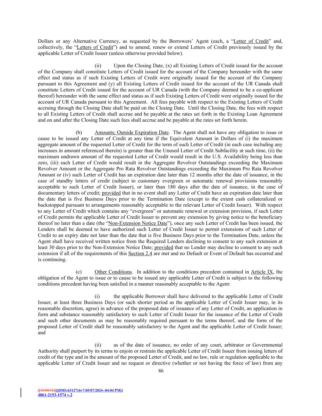 Dollars or any Alternative Currency, as requested by the Borrowers’ Agent (each, a “Letter of Credit” and, collectively, the “Letters of Credit”) and to amend, renew or extend Letters of Credit previously issued by the applicable Letter of Credit Issuer (unless otherwise provided below). (ii) Upon the Closing Date, (x) all Existing Letters of Credit issued for the account of the Company shall constitute Letters of Credit issued for the account of the Company hereunder with the same effect and status as if such Existing Letters of Credit were originally issued for the account of the Company pursuant to this Agreement and (y) all Existing Letters of Credit issued for the account of the UR Canada shall constitute Letters of Credit issued for the account of UR Canada (with the Company deemed to be a co-applicant thereof) hereunder with the same effect and status as if such Existing Letters of Credit were originally issued for the account of UR Canada pursuant to this Agreement. All fees payable with respect to the Existing Letters of Credit accruing through the Closing Date shall be paid on the Closing Date. Until the Closing Date, the fees with respect to all Existing Letters of Credit shall accrue and be payable at the rates set forth in the Existing Loan Agreement and on and after the Closing Date such fees shall accrue and be payable at the rates set forth herein. (b) Amounts; Outside Expiration Date. The Agent shall not have any obligation to issue or cause to be issued any Letter of Credit at any time if the Equivalent Amount in Dollars of (i) the maximum aggregate amount of the requested Letter of Credit for the term of such Letter of Credit (in each case including any increases in amount referenced therein) is greater than the Unused Letter of Credit Subfacility at such time, (ii) the maximum undrawn amount of the requested Letter of Credit would result in the U.S. Availability being less than zero, (iii) such Letter of Credit would result in the Aggregate Revolver Outstandings exceeding the Maximum Revolver Amount or the Aggregate Pro Rata Revolver Outstandings exceeding the Maximum Pro Rata Revolver Amount or (iv) such Letter of Credit has an expiration date later than 12 months after the date of issuance, in the case of standby letters of credit (subject to customary evergreen or automatic renewal provisions reasonably acceptable to such Letter of Credit Issuer), or later than 180 days after the date of issuance, in the case of documentary letters of credit; provided that in no event shall any Letter of Credit have an expiration date later than the date that is five Business Days prior to the Termination Date (except to the extent cash collateralized or backstopped pursuant to arrangements reasonably acceptable to the relevant Letter of Credit Issuer). With respect to any Letter of Credit which contains any “evergreen” or automatic renewal or extension provision, if such Letter of Credit permits the applicable Letter of Credit Issuer to prevent any extension by giving notice to the beneficiary thereof no later than a date (the “Non-Extension Notice Date”), once any such Letter of Credit has been issued, the Lenders shall be deemed to have authorized such Letter of Credit Issuer to permit extensions of such Letter of Credit to an expiry date not later than the date that is five Business Days prior to the Termination Date, unless the Agent shall have received written notice from the Required Lenders declining to consent to any such extension at least 30 days prior to the Non-Extension Notice Date; provided that no Lender may decline to consent to any such extension if all of the requirements of this Section 2.4 are met and no Default or Event of Default has occurred and is continuing. (c) Other Conditions. In addition to the conditions precedent contained in Article IX, the obligation of the Agent to issue or to cause to be issued any applicable Letter of Credit is subject to the following conditions precedent having been satisfied in a manner reasonably acceptable to the Agent: (i) the applicable Borrower shall have delivered to the applicable Letter of Credit Issuer, at least three Business Days (or such shorter period as the applicable Letter of Credit Issuer may, in its reasonable discretion, agree) in advance of the proposed date of issuance of any Letter of Credit, an application in form and substance reasonably satisfactory to such Letter of Credit Issuer for the issuance of the Letter of Credit and such other documents as may be reasonably required pursuant to the terms thereof, and the form of the proposed Letter of Credit shall be reasonably satisfactory to the Agent and the applicable Letter of Credit Issuer; and (ii) as of the date of issuance, no order of any court, arbitrator or Governmental Authority shall purport by its terms to enjoin or restrain the applicable Letter of Credit Issuer from issuing letters of credit of the type and in the amount of the proposed Letter of Credit, and no law, rule or regulation applicable to the applicable Letter of Credit Issuer and no request or directive (whether or not having the force of law) from any 86 [[5848018]][[DMS:6312716v7:05/07/2024--04:04 PM]] 4861-2153-1574 v.2