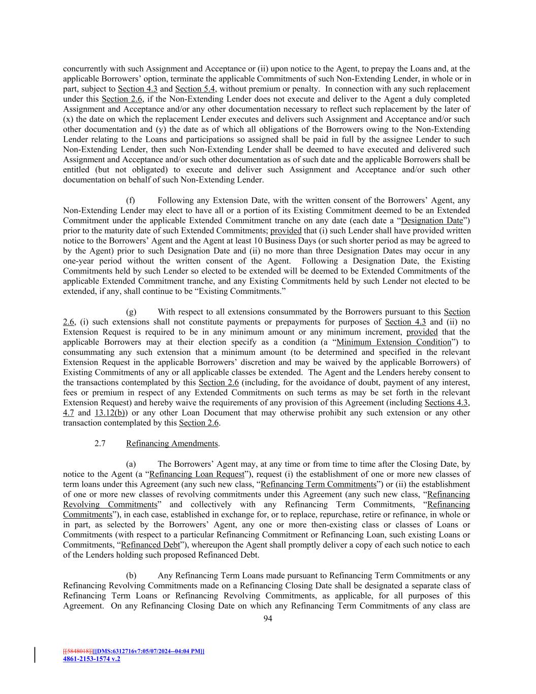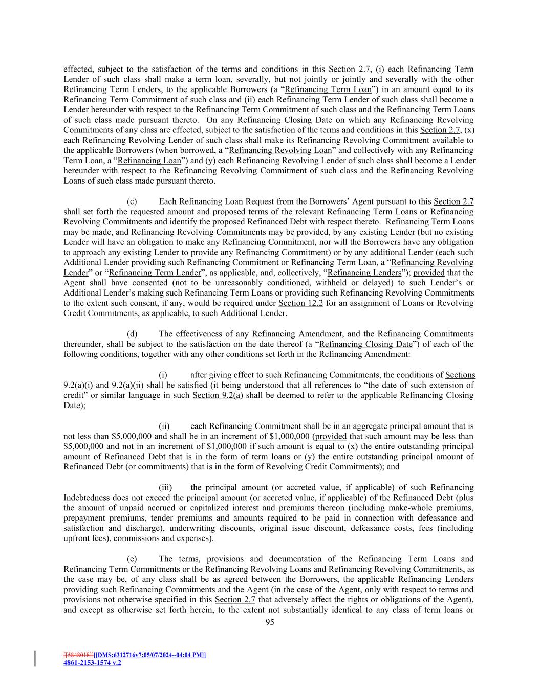 effected, subject to the satisfaction of the terms and conditions in this Section 2.7, (i) each Refinancing Term Lender of such class shall make a term loan, severally, but not jointly or jointly and severally with the other Refinancing Term Lenders, to the applicable Borrowers (a “Refinancing Term Loan”) in an amount equal to its Refinancing Term Commitment of such class and (ii) each Refinancing Term Lender of such class shall become a Lender hereunder with respect to the Refinancing Term Commitment of such class and the Refinancing Term Loans of such class made pursuant thereto. On any Refinancing Closing Date on which any Refinancing Revolving Commitments of any class are effected, subject to the satisfaction of the terms and conditions in this Section 2.7, (x) each Refinancing Revolving Lender of such class shall make its Refinancing Revolving Commitment available to the applicable Borrowers (when borrowed, a “Refinancing Revolving Loan” and collectively with any Refinancing Term Loan, a “Refinancing Loan”) and (y) each Refinancing Revolving Lender of such class shall become a Lender hereunder with respect to the Refinancing Revolving Commitment of such class and the Refinancing Revolving Loans of such class made pursuant thereto. (c) Each Refinancing Loan Request from the Borrowers’ Agent pursuant to this Section 2.7 shall set forth the requested amount and proposed terms of the relevant Refinancing Term Loans or Refinancing Revolving Commitments and identify the proposed Refinanced Debt with respect thereto. Refinancing Term Loans may be made, and Refinancing Revolving Commitments may be provided, by any existing Lender (but no existing Lender will have an obligation to make any Refinancing Commitment, nor will the Borrowers have any obligation to approach any existing Lender to provide any Refinancing Commitment) or by any additional Lender (each such Additional Lender providing such Refinancing Commitment or Refinancing Term Loan, a “Refinancing Revolving Lender” or “Refinancing Term Lender”, as applicable, and, collectively, “Refinancing Lenders”); provided that the Agent shall have consented (not to be unreasonably conditioned, withheld or delayed) to such Lender’s or Additional Lender’s making such Refinancing Term Loans or providing such Refinancing Revolving Commitments to the extent such consent, if any, would be required under Section 12.2 for an assignment of Loans or Revolving Credit Commitments, as applicable, to such Additional Lender. (d) The effectiveness of any Refinancing Amendment, and the Refinancing Commitments thereunder, shall be subject to the satisfaction on the date thereof (a “Refinancing Closing Date”) of each of the following conditions, together with any other conditions set forth in the Refinancing Amendment: (i) after giving effect to such Refinancing Commitments, the conditions of Sections 9.2(a)(i) and 9.2(a)(ii) shall be satisfied (it being understood that all references to “the date of such extension of credit” or similar language in such Section 9.2(a) shall be deemed to refer to the applicable Refinancing Closing Date); (ii) each Refinancing Commitment shall be in an aggregate principal amount that is not less than $5,000,000 and shall be in an increment of $1,000,000 (provided that such amount may be less than $5,000,000 and not in an increment of $1,000,000 if such amount is equal to (x) the entire outstanding principal amount of Refinanced Debt that is in the form of term loans or (y) the entire outstanding principal amount of Refinanced Debt (or commitments) that is in the form of Revolving Credit Commitments); and (iii) the principal amount (or accreted value, if applicable) of such Refinancing Indebtedness does not exceed the principal amount (or accreted value, if applicable) of the Refinanced Debt (plus the amount of unpaid accrued or capitalized interest and premiums thereon (including make-whole premiums, prepayment premiums, tender premiums and amounts required to be paid in connection with defeasance and satisfaction and discharge), underwriting discounts, original issue discount, defeasance costs, fees (including upfront fees), commissions and expenses). (e) The terms, provisions and documentation of the Refinancing Term Loans and Refinancing Term Commitments or the Refinancing Revolving Loans and Refinancing Revolving Commitments, as the case may be, of any class shall be as agreed between the Borrowers, the applicable Refinancing Lenders providing such Refinancing Commitments and the Agent (in the case of the Agent, only with respect to terms and provisions not otherwise specified in this Section 2.7 that adversely affect the rights or obligations of the Agent), and except as otherwise set forth herein, to the extent not substantially identical to any class of term loans or 95 [[5848018]][[DMS:6312716v7:05/07/2024--04:04 PM]] 4861-2153-1574 v.2