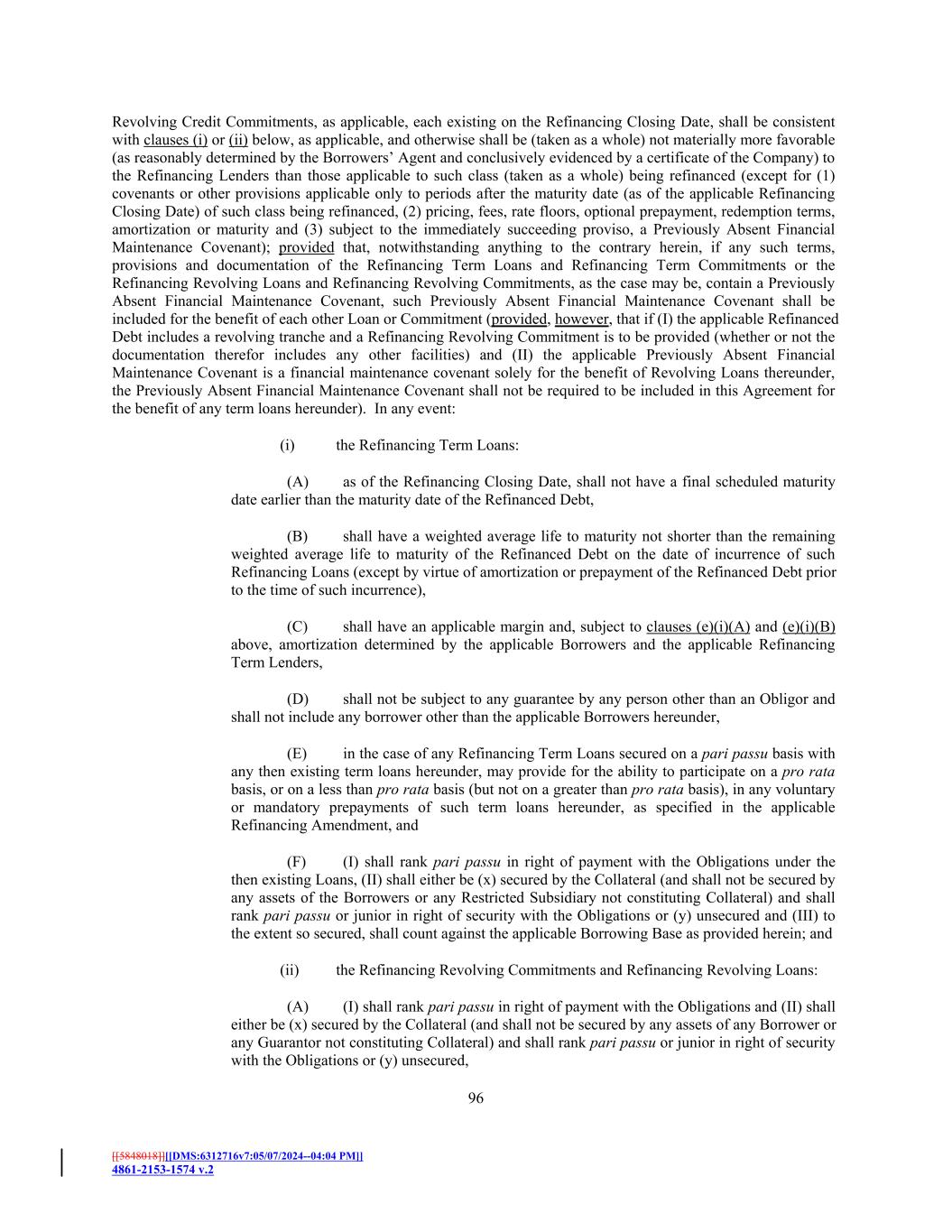 Revolving Credit Commitments, as applicable, each existing on the Refinancing Closing Date, shall be consistent with clauses (i) or (ii) below, as applicable, and otherwise shall be (taken as a whole) not materially more favorable (as reasonably determined by the Borrowers’ Agent and conclusively evidenced by a certificate of the Company) to the Refinancing Lenders than those applicable to such class (taken as a whole) being refinanced (except for (1) covenants or other provisions applicable only to periods after the maturity date (as of the applicable Refinancing Closing Date) of such class being refinanced, (2) pricing, fees, rate floors, optional prepayment, redemption terms, amortization or maturity and (3) subject to the immediately succeeding proviso, a Previously Absent Financial Maintenance Covenant); provided that, notwithstanding anything to the contrary herein, if any such terms, provisions and documentation of the Refinancing Term Loans and Refinancing Term Commitments or the Refinancing Revolving Loans and Refinancing Revolving Commitments, as the case may be, contain a Previously Absent Financial Maintenance Covenant, such Previously Absent Financial Maintenance Covenant shall be included for the benefit of each other Loan or Commitment (provided, however, that if (I) the applicable Refinanced Debt includes a revolving tranche and a Refinancing Revolving Commitment is to be provided (whether or not the documentation therefor includes any other facilities) and (II) the applicable Previously Absent Financial Maintenance Covenant is a financial maintenance covenant solely for the benefit of Revolving Loans thereunder, the Previously Absent Financial Maintenance Covenant shall not be required to be included in this Agreement for the benefit of any term loans hereunder). In any event: (i) the Refinancing Term Loans: (A) as of the Refinancing Closing Date, shall not have a final scheduled maturity date earlier than the maturity date of the Refinanced Debt, (B) shall have a weighted average life to maturity not shorter than the remaining weighted average life to maturity of the Refinanced Debt on the date of incurrence of such Refinancing Loans (except by virtue of amortization or prepayment of the Refinanced Debt prior to the time of such incurrence), (C) shall have an applicable margin and, subject to clauses (e)(i)(A) and (e)(i)(B) above, amortization determined by the applicable Borrowers and the applicable Refinancing Term Lenders, (D) shall not be subject to any guarantee by any person other than an Obligor and shall not include any borrower other than the applicable Borrowers hereunder, (E) in the case of any Refinancing Term Loans secured on a pari passu basis with any then existing term loans hereunder, may provide for the ability to participate on a pro rata basis, or on a less than pro rata basis (but not on a greater than pro rata basis), in any voluntary or mandatory prepayments of such term loans hereunder, as specified in the applicable Refinancing Amendment, and (F) (I) shall rank pari passu in right of payment with the Obligations under the then existing Loans, (II) shall either be (x) secured by the Collateral (and shall not be secured by any assets of the Borrowers or any Restricted Subsidiary not constituting Collateral) and shall rank pari passu or junior in right of security with the Obligations or (y) unsecured and (III) to the extent so secured, shall count against the applicable Borrowing Base as provided herein; and (ii) the Refinancing Revolving Commitments and Refinancing Revolving Loans: (A) (I) shall rank pari passu in right of payment with the Obligations and (II) shall either be (x) secured by the Collateral (and shall not be secured by any assets of any Borrower or any Guarantor not constituting Collateral) and shall rank pari passu or junior in right of security with the Obligations or (y) unsecured, 96 [[5848018]][[DMS:6312716v7:05/07/2024--04:04 PM]] 4861-2153-1574 v.2