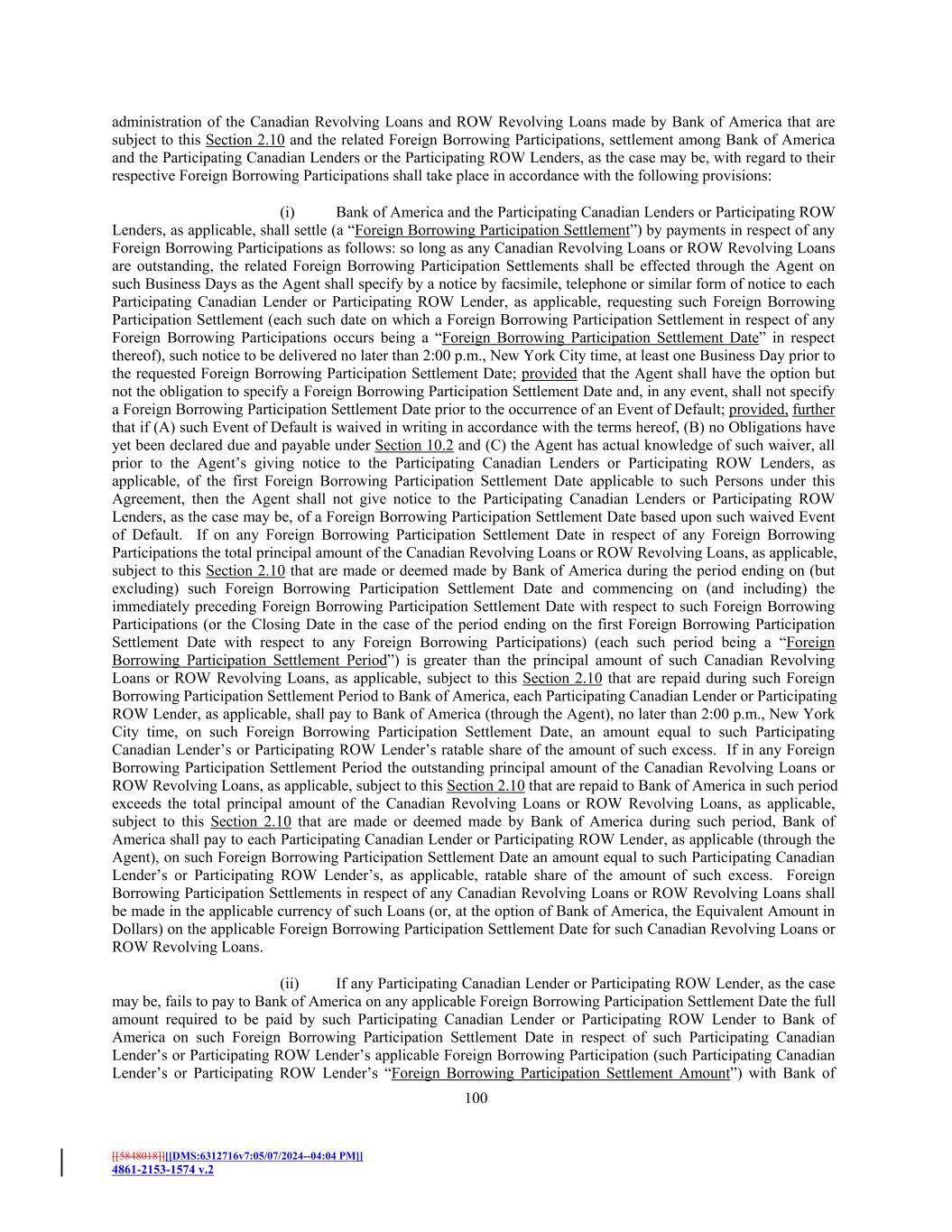 administration of the Canadian Revolving Loans and ROW Revolving Loans made by Bank of America that are subject to this Section 2.10 and the related Foreign Borrowing Participations, settlement among Bank of America and the Participating Canadian Lenders or the Participating ROW Lenders, as the case may be, with regard to their respective Foreign Borrowing Participations shall take place in accordance with the following provisions: (i) Bank of America and the Participating Canadian Lenders or Participating ROW Lenders, as applicable, shall settle (a “Foreign Borrowing Participation Settlement”) by payments in respect of any Foreign Borrowing Participations as follows: so long as any Canadian Revolving Loans or ROW Revolving Loans are outstanding, the related Foreign Borrowing Participation Settlements shall be effected through the Agent on such Business Days as the Agent shall specify by a notice by facsimile, telephone or similar form of notice to each Participating Canadian Lender or Participating ROW Lender, as applicable, requesting such Foreign Borrowing Participation Settlement (each such date on which a Foreign Borrowing Participation Settlement in respect of any Foreign Borrowing Participations occurs being a “Foreign Borrowing Participation Settlement Date” in respect thereof), such notice to be delivered no later than 2:00 p.m., New York City time, at least one Business Day prior to the requested Foreign Borrowing Participation Settlement Date; provided that the Agent shall have the option but not the obligation to specify a Foreign Borrowing Participation Settlement Date and, in any event, shall not specify a Foreign Borrowing Participation Settlement Date prior to the occurrence of an Event of Default; provided, further that if (A) such Event of Default is waived in writing in accordance with the terms hereof, (B) no Obligations have yet been declared due and payable under Section 10.2 and (C) the Agent has actual knowledge of such waiver, all prior to the Agent’s giving notice to the Participating Canadian Lenders or Participating ROW Lenders, as applicable, of the first Foreign Borrowing Participation Settlement Date applicable to such Persons under this Agreement, then the Agent shall not give notice to the Participating Canadian Lenders or Participating ROW Lenders, as the case may be, of a Foreign Borrowing Participation Settlement Date based upon such waived Event of Default. If on any Foreign Borrowing Participation Settlement Date in respect of any Foreign Borrowing Participations the total principal amount of the Canadian Revolving Loans or ROW Revolving Loans, as applicable, subject to this Section 2.10 that are made or deemed made by Bank of America during the period ending on (but excluding) such Foreign Borrowing Participation Settlement Date and commencing on (and including) the immediately preceding Foreign Borrowing Participation Settlement Date with respect to such Foreign Borrowing Participations (or the Closing Date in the case of the period ending on the first Foreign Borrowing Participation Settlement Date with respect to any Foreign Borrowing Participations) (each such period being a “Foreign Borrowing Participation Settlement Period”) is greater than the principal amount of such Canadian Revolving Loans or ROW Revolving Loans, as applicable, subject to this Section 2.10 that are repaid during such Foreign Borrowing Participation Settlement Period to Bank of America, each Participating Canadian Lender or Participating ROW Lender, as applicable, shall pay to Bank of America (through the Agent), no later than 2:00 p.m., New York City time, on such Foreign Borrowing Participation Settlement Date, an amount equal to such Participating Canadian Lender’s or Participating ROW Lender’s ratable share of the amount of such excess. If in any Foreign Borrowing Participation Settlement Period the outstanding principal amount of the Canadian Revolving Loans or ROW Revolving Loans, as applicable, subject to this Section 2.10 that are repaid to Bank of America in such period exceeds the total principal amount of the Canadian Revolving Loans or ROW Revolving Loans, as applicable, subject to this Section 2.10 that are made or deemed made by Bank of America during such period, Bank of America shall pay to each Participating Canadian Lender or Participating ROW Lender, as applicable (through the Agent), on such Foreign Borrowing Participation Settlement Date an amount equal to such Participating Canadian Lender’s or Participating ROW Lender’s, as applicable, ratable share of the amount of such excess. Foreign Borrowing Participation Settlements in respect of any Canadian Revolving Loans or ROW Revolving Loans shall be made in the applicable currency of such Loans (or, at the option of Bank of America, the Equivalent Amount in Dollars) on the applicable Foreign Borrowing Participation Settlement Date for such Canadian Revolving Loans or ROW Revolving Loans. (ii) If any Participating Canadian Lender or Participating ROW Lender, as the case may be, fails to pay to Bank of America on any applicable Foreign Borrowing Participation Settlement Date the full amount required to be paid by such Participating Canadian Lender or Participating ROW Lender to Bank of America on such Foreign Borrowing Participation Settlement Date in respect of such Participating Canadian Lender’s or Participating ROW Lender’s applicable Foreign Borrowing Participation (such Participating Canadian Lender’s or Participating ROW Lender’s “Foreign Borrowing Participation Settlement Amount”) with Bank of 100 [[5848018]][[DMS:6312716v7:05/07/2024--04:04 PM]] 4861-2153-1574 v.2