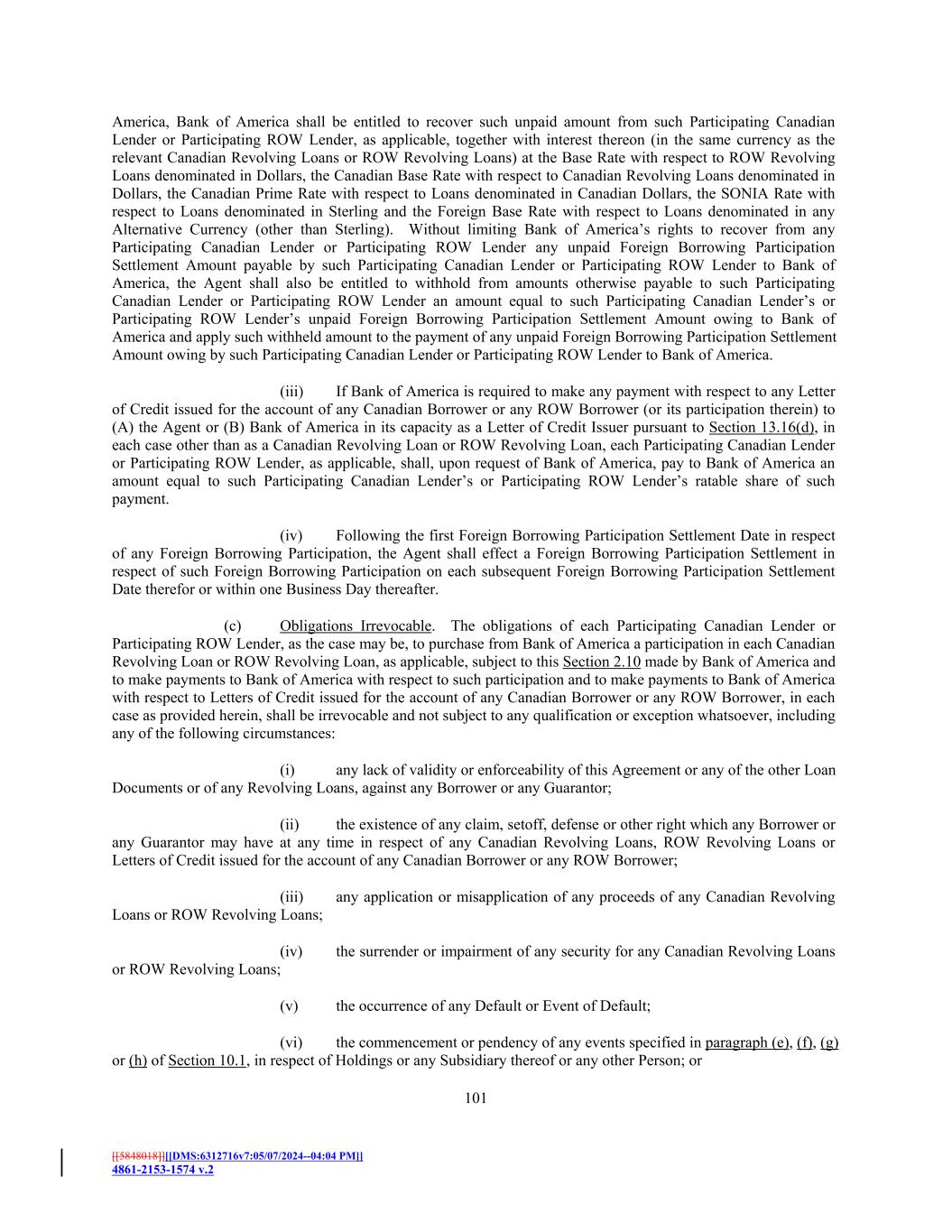 America, Bank of America shall be entitled to recover such unpaid amount from such Participating Canadian Lender or Participating ROW Lender, as applicable, together with interest thereon (in the same currency as the relevant Canadian Revolving Loans or ROW Revolving Loans) at the Base Rate with respect to ROW Revolving Loans denominated in Dollars, the Canadian Base Rate with respect to Canadian Revolving Loans denominated in Dollars, the Canadian Prime Rate with respect to Loans denominated in Canadian Dollars, the SONIA Rate with respect to Loans denominated in Sterling and the Foreign Base Rate with respect to Loans denominated in any Alternative Currency (other than Sterling). Without limiting Bank of America’s rights to recover from any Participating Canadian Lender or Participating ROW Lender any unpaid Foreign Borrowing Participation Settlement Amount payable by such Participating Canadian Lender or Participating ROW Lender to Bank of America, the Agent shall also be entitled to withhold from amounts otherwise payable to such Participating Canadian Lender or Participating ROW Lender an amount equal to such Participating Canadian Lender’s or Participating ROW Lender’s unpaid Foreign Borrowing Participation Settlement Amount owing to Bank of America and apply such withheld amount to the payment of any unpaid Foreign Borrowing Participation Settlement Amount owing by such Participating Canadian Lender or Participating ROW Lender to Bank of America. (iii) If Bank of America is required to make any payment with respect to any Letter of Credit issued for the account of any Canadian Borrower or any ROW Borrower (or its participation therein) to (A) the Agent or (B) Bank of America in its capacity as a Letter of Credit Issuer pursuant to Section 13.16(d), in each case other than as a Canadian Revolving Loan or ROW Revolving Loan, each Participating Canadian Lender or Participating ROW Lender, as applicable, shall, upon request of Bank of America, pay to Bank of America an amount equal to such Participating Canadian Lender’s or Participating ROW Lender’s ratable share of such payment. (iv) Following the first Foreign Borrowing Participation Settlement Date in respect of any Foreign Borrowing Participation, the Agent shall effect a Foreign Borrowing Participation Settlement in respect of such Foreign Borrowing Participation on each subsequent Foreign Borrowing Participation Settlement Date therefor or within one Business Day thereafter. (c) Obligations Irrevocable. The obligations of each Participating Canadian Lender or Participating ROW Lender, as the case may be, to purchase from Bank of America a participation in each Canadian Revolving Loan or ROW Revolving Loan, as applicable, subject to this Section 2.10 made by Bank of America and to make payments to Bank of America with respect to such participation and to make payments to Bank of America with respect to Letters of Credit issued for the account of any Canadian Borrower or any ROW Borrower, in each case as provided herein, shall be irrevocable and not subject to any qualification or exception whatsoever, including any of the following circumstances: (i) any lack of validity or enforceability of this Agreement or any of the other Loan Documents or of any Revolving Loans, against any Borrower or any Guarantor; (ii) the existence of any claim, setoff, defense or other right which any Borrower or any Guarantor may have at any time in respect of any Canadian Revolving Loans, ROW Revolving Loans or Letters of Credit issued for the account of any Canadian Borrower or any ROW Borrower; (iii) any application or misapplication of any proceeds of any Canadian Revolving Loans or ROW Revolving Loans; (iv) the surrender or impairment of any security for any Canadian Revolving Loans or ROW Revolving Loans; (v) the occurrence of any Default or Event of Default; (vi) the commencement or pendency of any events specified in paragraph (e), (f), (g) or (h) of Section 10.1, in respect of Holdings or any Subsidiary thereof or any other Person; or 101 [[5848018]][[DMS:6312716v7:05/07/2024--04:04 PM]] 4861-2153-1574 v.2