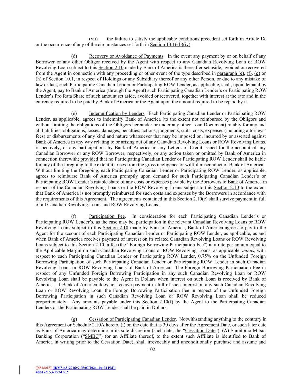 (vii) the failure to satisfy the applicable conditions precedent set forth in Article IX or the occurrence of any of the circumstances set forth in Section 13.16(b)(iv). (d) Recovery or Avoidance of Payments. In the event any payment by or on behalf of any Borrower or any other Obligor received by the Agent with respect to any Canadian Revolving Loan or ROW Revolving Loan subject to this Section 2.10 made by Bank of America is thereafter set aside, avoided or recovered from the Agent in connection with any proceeding or other event of the type described in paragraph (e), (f), (g) or (h) of Section 10.1, in respect of Holdings or any Subsidiary thereof or any other Person, or due to any mistake of law or fact, each Participating Canadian Lender or Participating ROW Lender, as applicable, shall, upon demand by the Agent, pay to Bank of America (through the Agent) such Participating Canadian Lender’s or Participating ROW Lender’s Pro Rata Share of such amount set aside, avoided or recovered, together with interest at the rate and in the currency required to be paid by Bank of America or the Agent upon the amount required to be repaid by it. (e) Indemnification by Lenders. Each Participating Canadian Lender or Participating ROW Lender, as applicable, agrees to indemnify Bank of America (to the extent not reimbursed by the Obligors and without limiting the obligations of the Obligors hereunder or under any other Loan Document) ratably for any and all liabilities, obligations, losses, damages, penalties, actions, judgments, suits, costs, expenses (including attorneys’ fees) or disbursements of any kind and nature whatsoever that may be imposed on, incurred by or asserted against Bank of America in any way relating to or arising out of any Canadian Revolving Loans or ROW Revolving Loans, respectively, or any participations by Bank of America in any Letters of Credit issued for the account of any Canadian Borrower or any ROW Borrower, respectively, or any action taken or omitted by Bank of America in connection therewith; provided that no Participating Canadian Lender or Participating ROW Lender shall be liable for any of the foregoing to the extent it arises from the gross negligence or willful misconduct of Bank of America. Without limiting the foregoing, each Participating Canadian Lender or Participating ROW Lender, as applicable, agrees to reimburse Bank of America promptly upon demand for such Participating Canadian Lender’s or Participating ROW Lender’s ratable share of any costs or expenses payable by the Borrowers to Bank of America in respect of the Canadian Revolving Loans or the ROW Revolving Loans subject to this Section 2.10 to the extent that Bank of America is not promptly reimbursed for such costs and expenses by the Borrowers in accordance with the requirements of this Agreement. The agreements contained in this Section 2.10(e) shall survive payment in full of all Canadian Revolving Loans and ROW Revolving Loans. (f) Participation Fee. In consideration for each Participating Canadian Lender’s or Participating ROW Lender’s, as the case may be, participation in the relevant Canadian Revolving Loans or ROW Revolving Loans subject to this Section 2.10 made by Bank of America, Bank of America agrees to pay to the Agent for the account of each Participating Canadian Lender or Participating ROW Lender, as applicable, as and when Bank of America receives payment of interest on its related Canadian Revolving Loans or ROW Revolving Loans subject to this Section 2.10, a fee (the “Foreign Borrowing Participation Fee”) at a rate per annum equal to the Applicable Margin on such Canadian Revolving Loans or ROW Revolving Loans, as applicable, minus, with respect to each Participating Canadian Lender or Participating ROW Lender, 0.75% on the Unfunded Foreign Borrowing Participation of such Participating Canadian Lender or Participating ROW Lender in such Canadian Revolving Loans or ROW Revolving Loans of Bank of America. The Foreign Borrowing Participation Fee in respect of any Unfunded Foreign Borrowing Participation in any such Canadian Revolving Loan or ROW Revolving Loan shall be payable to the Agent in Dollars when interest on such Loan is received by Bank of America. If Bank of America does not receive payment in full of such interest on any such Canadian Revolving Loan or ROW Revolving Loan, the Foreign Borrowing Participation Fee in respect of the Unfunded Foreign Borrowing Participation in such Canadian Revolving Loan or ROW Revolving Loan shall be reduced proportionately. Any amounts payable under this Section 2.10(f) by the Agent to the Participating Canadian Lenders or the Participating ROW Lender shall be paid in Dollars. (g) Cessation of Participating Canadian Lender. Notwithstanding anything to the contrary in this Agreement or Schedule 2.10A hereto, (i) on the date that is 30 days after the Agreement Date, or such later date as Bank of America may determine in its sole discretion (such date, the “Cessation Date”), (A) Sumitomo Mitsui Banking Corporation (“SMBC”) (or an Affiliate thereof, to the extent such Affiliate is identified to Bank of America in writing prior to the Cessation Date), shall irrevocably and unconditionally purchase and assume and 102 [[5848018]][[DMS:6312716v7:05/07/2024--04:04 PM]] 4861-2153-1574 v.2