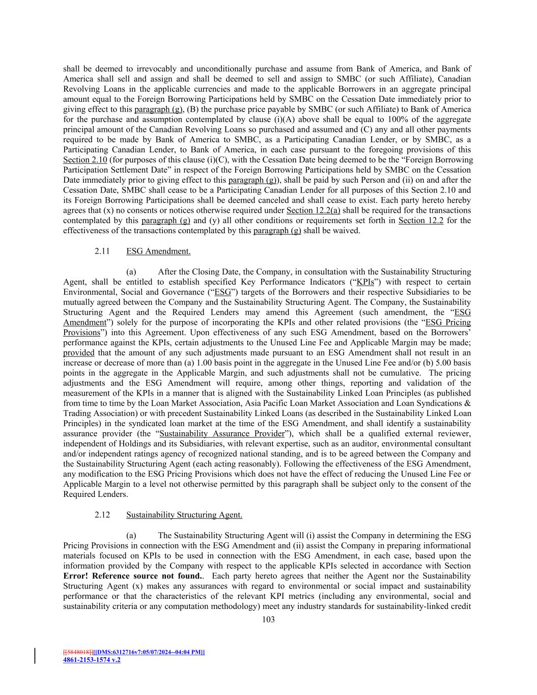 shall be deemed to irrevocably and unconditionally purchase and assume from Bank of America, and Bank of America shall sell and assign and shall be deemed to sell and assign to SMBC (or such Affiliate), Canadian Revolving Loans in the applicable currencies and made to the applicable Borrowers in an aggregate principal amount equal to the Foreign Borrowing Participations held by SMBC on the Cessation Date immediately prior to giving effect to this paragraph (g), (B) the purchase price payable by SMBC (or such Affiliate) to Bank of America for the purchase and assumption contemplated by clause (i)(A) above shall be equal to 100% of the aggregate principal amount of the Canadian Revolving Loans so purchased and assumed and (C) any and all other payments required to be made by Bank of America to SMBC, as a Participating Canadian Lender, or by SMBC, as a Participating Canadian Lender, to Bank of America, in each case pursuant to the foregoing provisions of this Section 2.10 (for purposes of this clause (i)(C), with the Cessation Date being deemed to be the “Foreign Borrowing Participation Settlement Date” in respect of the Foreign Borrowing Participations held by SMBC on the Cessation Date immediately prior to giving effect to this paragraph (g)), shall be paid by such Person and (ii) on and after the Cessation Date, SMBC shall cease to be a Participating Canadian Lender for all purposes of this Section 2.10 and its Foreign Borrowing Participations shall be deemed canceled and shall cease to exist. Each party hereto hereby agrees that (x) no consents or notices otherwise required under Section 12.2(a) shall be required for the transactions contemplated by this paragraph (g) and (y) all other conditions or requirements set forth in Section 12.2 for the effectiveness of the transactions contemplated by this paragraph (g) shall be waived. 2.11 ESG Amendment. (a) After the Closing Date, the Company, in consultation with the Sustainability Structuring Agent, shall be entitled to establish specified Key Performance Indicators (“KPIs”) with respect to certain Environmental, Social and Governance (“ESG”) targets of the Borrowers and their respective Subsidiaries to be mutually agreed between the Company and the Sustainability Structuring Agent. The Company, the Sustainability Structuring Agent and the Required Lenders may amend this Agreement (such amendment, the “ESG Amendment”) solely for the purpose of incorporating the KPIs and other related provisions (the “ESG Pricing Provisions”) into this Agreement. Upon effectiveness of any such ESG Amendment, based on the Borrowers’ performance against the KPIs, certain adjustments to the Unused Line Fee and Applicable Margin may be made; provided that the amount of any such adjustments made pursuant to an ESG Amendment shall not result in an increase or decrease of more than (a) 1.00 basis point in the aggregate in the Unused Line Fee and/or (b) 5.00 basis points in the aggregate in the Applicable Margin, and such adjustments shall not be cumulative. The pricing adjustments and the ESG Amendment will require, among other things, reporting and validation of the measurement of the KPIs in a manner that is aligned with the Sustainability Linked Loan Principles (as published from time to time by the Loan Market Association, Asia Pacific Loan Market Association and Loan Syndications & Trading Association) or with precedent Sustainability Linked Loans (as described in the Sustainability Linked Loan Principles) in the syndicated loan market at the time of the ESG Amendment, and shall identify a sustainability assurance provider (the “Sustainability Assurance Provider”), which shall be a qualified external reviewer, independent of Holdings and its Subsidiaries, with relevant expertise, such as an auditor, environmental consultant and/or independent ratings agency of recognized national standing, and is to be agreed between the Company and the Sustainability Structuring Agent (each acting reasonably). Following the effectiveness of the ESG Amendment, any modification to the ESG Pricing Provisions which does not have the effect of reducing the Unused Line Fee or Applicable Margin to a level not otherwise permitted by this paragraph shall be subject only to the consent of the Required Lenders. 2.12 Sustainability Structuring Agent. (a) The Sustainability Structuring Agent will (i) assist the Company in determining the ESG Pricing Provisions in connection with the ESG Amendment and (ii) assist the Company in preparing informational materials focused on KPIs to be used in connection with the ESG Amendment, in each case, based upon the information provided by the Company with respect to the applicable KPIs selected in accordance with Section Error! Reference source not found.. Each party hereto agrees that neither the Agent nor the Sustainability Structuring Agent (x) makes any assurances with regard to environmental or social impact and sustainability performance or that the characteristics of the relevant KPI metrics (including any environmental, social and sustainability criteria or any computation methodology) meet any industry standards for sustainability-linked credit 103 [[5848018]][[DMS:6312716v7:05/07/2024--04:04 PM]] 4861-2153-1574 v.2
