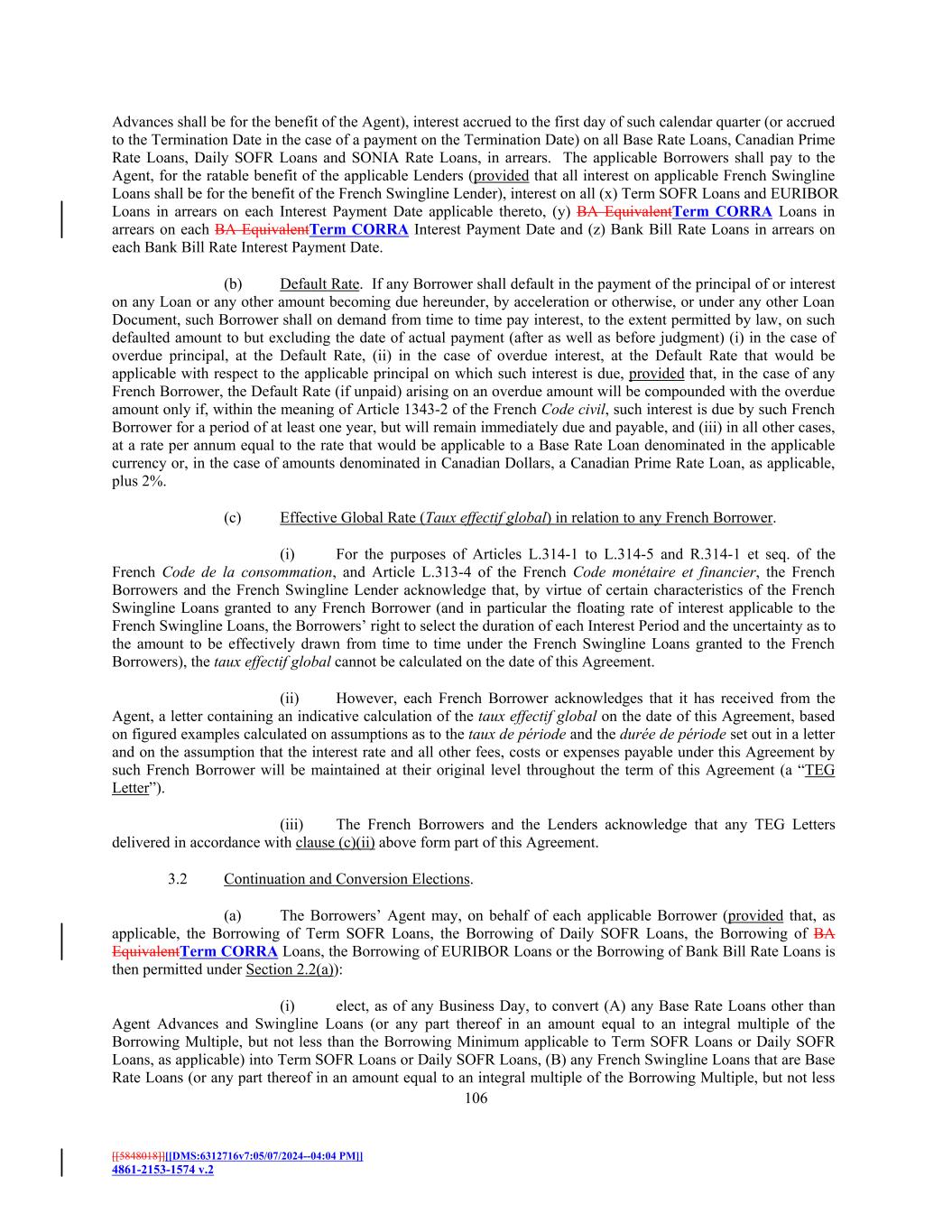 Advances shall be for the benefit of the Agent), interest accrued to the first day of such calendar quarter (or accrued to the Termination Date in the case of a payment on the Termination Date) on all Base Rate Loans, Canadian Prime Rate Loans, Daily SOFR Loans and SONIA Rate Loans, in arrears. The applicable Borrowers shall pay to the Agent, for the ratable benefit of the applicable Lenders (provided that all interest on applicable French Swingline Loans shall be for the benefit of the French Swingline Lender), interest on all (x) Term SOFR Loans and EURIBOR Loans in arrears on each Interest Payment Date applicable thereto, (y) BA EquivalentTerm CORRA Loans in arrears on each BA EquivalentTerm CORRA Interest Payment Date and (z) Bank Bill Rate Loans in arrears on each Bank Bill Rate Interest Payment Date. (b) Default Rate. If any Borrower shall default in the payment of the principal of or interest on any Loan or any other amount becoming due hereunder, by acceleration or otherwise, or under any other Loan Document, such Borrower shall on demand from time to time pay interest, to the extent permitted by law, on such defaulted amount to but excluding the date of actual payment (after as well as before judgment) (i) in the case of overdue principal, at the Default Rate, (ii) in the case of overdue interest, at the Default Rate that would be applicable with respect to the applicable principal on which such interest is due, provided that, in the case of any French Borrower, the Default Rate (if unpaid) arising on an overdue amount will be compounded with the overdue amount only if, within the meaning of Article 1343-2 of the French Code civil, such interest is due by such French Borrower for a period of at least one year, but will remain immediately due and payable, and (iii) in all other cases, at a rate per annum equal to the rate that would be applicable to a Base Rate Loan denominated in the applicable currency or, in the case of amounts denominated in Canadian Dollars, a Canadian Prime Rate Loan, as applicable, plus 2%. (c) Effective Global Rate (Taux effectif global) in relation to any French Borrower. (i) For the purposes of Articles L.314-1 to L.314-5 and R.314-1 et seq. of the French Code de la consommation, and Article L.313-4 of the French Code monétaire et financier, the French Borrowers and the French Swingline Lender acknowledge that, by virtue of certain characteristics of the French Swingline Loans granted to any French Borrower (and in particular the floating rate of interest applicable to the French Swingline Loans, the Borrowers’ right to select the duration of each Interest Period and the uncertainty as to the amount to be effectively drawn from time to time under the French Swingline Loans granted to the French Borrowers), the taux effectif global cannot be calculated on the date of this Agreement. (ii) However, each French Borrower acknowledges that it has received from the Agent, a letter containing an indicative calculation of the taux effectif global on the date of this Agreement, based on figured examples calculated on assumptions as to the taux de période and the durée de période set out in a letter and on the assumption that the interest rate and all other fees, costs or expenses payable under this Agreement by such French Borrower will be maintained at their original level throughout the term of this Agreement (a “TEG Letter”). (iii) The French Borrowers and the Lenders acknowledge that any TEG Letters delivered in accordance with clause (c)(ii) above form part of this Agreement. 3.2 Continuation and Conversion Elections. (a) The Borrowers’ Agent may, on behalf of each applicable Borrower (provided that, as applicable, the Borrowing of Term SOFR Loans, the Borrowing of Daily SOFR Loans, the Borrowing of BA EquivalentTerm CORRA Loans, the Borrowing of EURIBOR Loans or the Borrowing of Bank Bill Rate Loans is then permitted under Section 2.2(a)): (i) elect, as of any Business Day, to convert (A) any Base Rate Loans other than Agent Advances and Swingline Loans (or any part thereof in an amount equal to an integral multiple of the Borrowing Multiple, but not less than the Borrowing Minimum applicable to Term SOFR Loans or Daily SOFR Loans, as applicable) into Term SOFR Loans or Daily SOFR Loans, (B) any French Swingline Loans that are Base Rate Loans (or any part thereof in an amount equal to an integral multiple of the Borrowing Multiple, but not less 106 [[5848018]][[DMS:6312716v7:05/07/2024--04:04 PM]] 4861-2153-1574 v.2