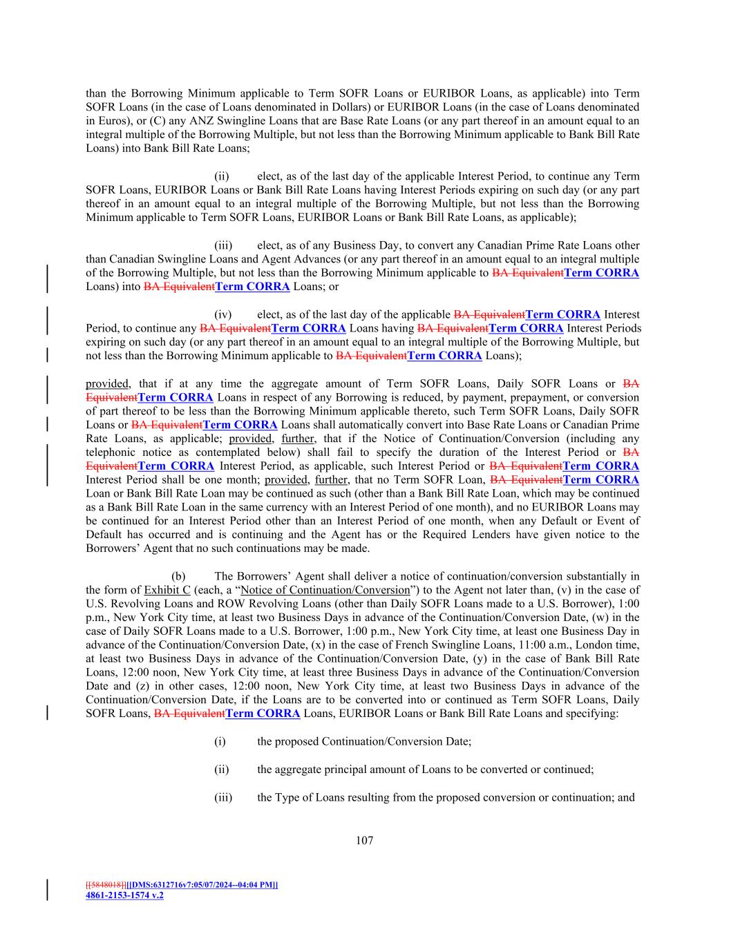 than the Borrowing Minimum applicable to Term SOFR Loans or EURIBOR Loans, as applicable) into Term SOFR Loans (in the case of Loans denominated in Dollars) or EURIBOR Loans (in the case of Loans denominated in Euros), or (C) any ANZ Swingline Loans that are Base Rate Loans (or any part thereof in an amount equal to an integral multiple of the Borrowing Multiple, but not less than the Borrowing Minimum applicable to Bank Bill Rate Loans) into Bank Bill Rate Loans; (ii) elect, as of the last day of the applicable Interest Period, to continue any Term SOFR Loans, EURIBOR Loans or Bank Bill Rate Loans having Interest Periods expiring on such day (or any part thereof in an amount equal to an integral multiple of the Borrowing Multiple, but not less than the Borrowing Minimum applicable to Term SOFR Loans, EURIBOR Loans or Bank Bill Rate Loans, as applicable); (iii) elect, as of any Business Day, to convert any Canadian Prime Rate Loans other than Canadian Swingline Loans and Agent Advances (or any part thereof in an amount equal to an integral multiple of the Borrowing Multiple, but not less than the Borrowing Minimum applicable to BA EquivalentTerm CORRA Loans) into BA EquivalentTerm CORRA Loans; or (iv) elect, as of the last day of the applicable BA EquivalentTerm CORRA Interest Period, to continue any BA EquivalentTerm CORRA Loans having BA EquivalentTerm CORRA Interest Periods expiring on such day (or any part thereof in an amount equal to an integral multiple of the Borrowing Multiple, but not less than the Borrowing Minimum applicable to BA EquivalentTerm CORRA Loans); provided, that if at any time the aggregate amount of Term SOFR Loans, Daily SOFR Loans or BA EquivalentTerm CORRA Loans in respect of any Borrowing is reduced, by payment, prepayment, or conversion of part thereof to be less than the Borrowing Minimum applicable thereto, such Term SOFR Loans, Daily SOFR Loans or BA EquivalentTerm CORRA Loans shall automatically convert into Base Rate Loans or Canadian Prime Rate Loans, as applicable; provided, further, that if the Notice of Continuation/Conversion (including any telephonic notice as contemplated below) shall fail to specify the duration of the Interest Period or BA EquivalentTerm CORRA Interest Period, as applicable, such Interest Period or BA EquivalentTerm CORRA Interest Period shall be one month; provided, further, that no Term SOFR Loan, BA EquivalentTerm CORRA Loan or Bank Bill Rate Loan may be continued as such (other than a Bank Bill Rate Loan, which may be continued as a Bank Bill Rate Loan in the same currency with an Interest Period of one month), and no EURIBOR Loans may be continued for an Interest Period other than an Interest Period of one month, when any Default or Event of Default has occurred and is continuing and the Agent has or the Required Lenders have given notice to the Borrowers’ Agent that no such continuations may be made. (b) The Borrowers’ Agent shall deliver a notice of continuation/conversion substantially in the form of Exhibit C (each, a “Notice of Continuation/Conversion”) to the Agent not later than, (v) in the case of U.S. Revolving Loans and ROW Revolving Loans (other than Daily SOFR Loans made to a U.S. Borrower), 1:00 p.m., New York City time, at least two Business Days in advance of the Continuation/Conversion Date, (w) in the case of Daily SOFR Loans made to a U.S. Borrower, 1:00 p.m., New York City time, at least one Business Day in advance of the Continuation/Conversion Date, (x) in the case of French Swingline Loans, 11:00 a.m., London time, at least two Business Days in advance of the Continuation/Conversion Date, (y) in the case of Bank Bill Rate Loans, 12:00 noon, New York City time, at least three Business Days in advance of the Continuation/Conversion Date and (z) in other cases, 12:00 noon, New York City time, at least two Business Days in advance of the Continuation/Conversion Date, if the Loans are to be converted into or continued as Term SOFR Loans, Daily SOFR Loans, BA EquivalentTerm CORRA Loans, EURIBOR Loans or Bank Bill Rate Loans and specifying: (i) the proposed Continuation/Conversion Date; (ii) the aggregate principal amount of Loans to be converted or continued; (iii) the Type of Loans resulting from the proposed conversion or continuation; and 107 [[5848018]][[DMS:6312716v7:05/07/2024--04:04 PM]] 4861-2153-1574 v.2