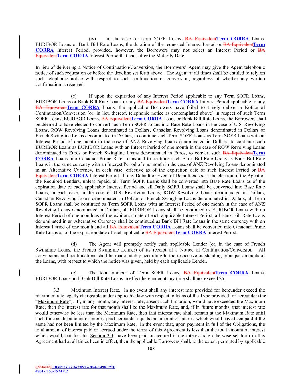 (iv) in the case of Term SOFR Loans, BA EquivalentTerm CORRA Loans, EURIBOR Loans or Bank Bill Rate Loans, the duration of the requested Interest Period or BA EquivalentTerm CORRA Interest Period, provided, however, the Borrowers may not select an Interest Period or BA EquivalentTerm CORRA Interest Period that ends after the Maturity Date. In lieu of delivering a Notice of Continuation/Conversion, the Borrowers’ Agent may give the Agent telephonic notice of such request on or before the deadline set forth above. The Agent at all times shall be entitled to rely on such telephonic notice with respect to such continuation or conversion, regardless of whether any written confirmation is received. (c) If upon the expiration of any Interest Period applicable to any Term SOFR Loans, EURIBOR Loans or Bank Bill Rate Loans or any BA EquivalentTerm CORRA Interest Period applicable to any BA EquivalentTerm CORRA Loans, the applicable Borrowers have failed to timely deliver a Notice of Continuation/Conversion (or, in lieu thereof, telephonic notice as contemplated above) in respect of such Term SOFR Loans, EURIBOR Loans, BA EquivalentTerm CORRA Loans or Bank Bill Rate Loans, the Borrowers shall be deemed to have elected to convert such Term SOFR Loans into Base Rate Loans in the case of U.S. Revolving Loans, ROW Revolving Loans denominated in Dollars, Canadian Revolving Loans denominated in Dollars or French Swingline Loans denominated in Dollars, to continue such Term SOFR Loans as Term SOFR Loans with an Interest Period of one month in the case of ANZ Revolving Loans denominated in Dollars, to continue such EURIBOR Loans as EURIBOR Loans with an Interest Period of one month in the case of ROW Revolving Loans denominated in Euros or French Swingline Loans denominated in Euros, to convert such BA EquivalentTerm CORRA Loans into Canadian Prime Rate Loans and to continue such Bank Bill Rate Loans as Bank Bill Rate Loans in the same currency with an Interest Period of one month in the case of ANZ Revolving Loans denominated in an Alternative Currency, in each case, effective as of the expiration date of such Interest Period or BA EquivalentTerm CORRA Interest Period. If any Default or Event of Default exists, at the election of the Agent or the Required Lenders, unless repaid, all Term SOFR Loans shall be converted into Base Rate Loans as of the expiration date of each applicable Interest Period and all Daily SOFR Loans shall be converted into Base Rate Loans, in each case, in the case of U.S. Revolving Loans, ROW Revolving Loans denominated in Dollars, Canadian Revolving Loans denominated in Dollars or French Swingline Loans denominated in Dollars, all Term SOFR Loans shall be continued as Term SOFR Loans with an Interest Period of one month in the case of ANZ Revolving Loans denominated in Dollars, all EURIBOR Loans shall be continued as EURIBOR Loans with an Interest Period of one month as of the expiration date of each applicable Interest Period, all Bank Bill Rate Loans denominated in an Alternative Currency shall be continued as Bank Bill Rate Loans in the same currency with an Interest Period of one month and all BA EquivalentTerm CORRA Loans shall be converted into Canadian Prime Rate Loans as of the expiration date of each applicable BA EquivalentTerm CORRA Interest Period. (d) The Agent will promptly notify each applicable Lender (or, in the case of French Swingline Loans, the French Swingline Lender) of its receipt of a Notice of Continuation/Conversion. All conversions and continuations shall be made ratably according to the respective outstanding principal amounts of the Loans, with respect to which the notice was given, held by each applicable Lender. (e) The total number of Term SOFR Loans, BA EquivalentTerm CORRA Loans, EURIBOR Loans and Bank Bill Rate Loans in effect hereunder at any time shall not exceed 25. 3.3 Maximum Interest Rate. In no event shall any interest rate provided for hereunder exceed the maximum rate legally chargeable under applicable law with respect to loans of the Type provided for hereunder (the “Maximum Rate”). If, in any month, any interest rate, absent such limitation, would have exceeded the Maximum Rate, then the interest rate for that month shall be the Maximum Rate, and, if in future months, that interest rate would otherwise be less than the Maximum Rate, then that interest rate shall remain at the Maximum Rate until such time as the amount of interest paid hereunder equals the amount of interest which would have been paid if the same had not been limited by the Maximum Rate. In the event that, upon payment in full of the Obligations, the total amount of interest paid or accrued under the terms of this Agreement is less than the total amount of interest which would, but for this Section 3.3, have been paid or accrued if the interest rate otherwise set forth in this Agreement had at all times been in effect, then the applicable Borrowers shall, to the extent permitted by applicable 108 [[5848018]][[DMS:6312716v7:05/07/2024--04:04 PM]] 4861-2153-1574 v.2