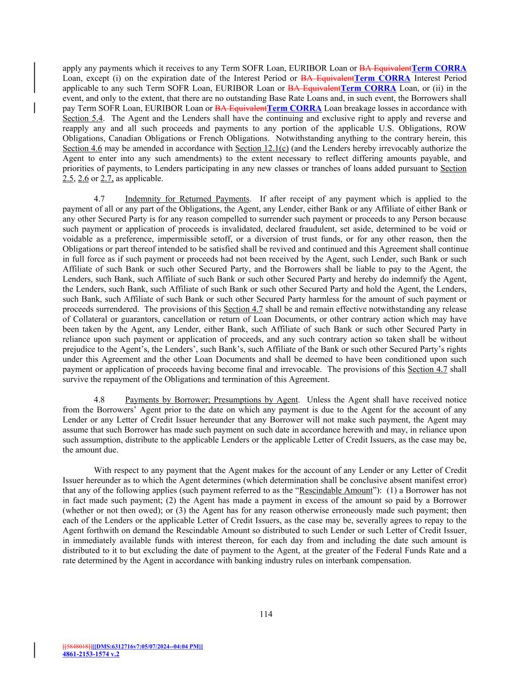 apply any payments which it receives to any Term SOFR Loan, EURIBOR Loan or BA EquivalentTerm CORRA Loan, except (i) on the expiration date of the Interest Period or BA EquivalentTerm CORRA Interest Period applicable to any such Term SOFR Loan, EURIBOR Loan or BA EquivalentTerm CORRA Loan, or (ii) in the event, and only to the extent, that there are no outstanding Base Rate Loans and, in such event, the Borrowers shall pay Term SOFR Loan, EURIBOR Loan or BA EquivalentTerm CORRA Loan breakage losses in accordance with Section 5.4. The Agent and the Lenders shall have the continuing and exclusive right to apply and reverse and reapply any and all such proceeds and payments to any portion of the applicable U.S. Obligations, ROW Obligations, Canadian Obligations or French Obligations. Notwithstanding anything to the contrary herein, this Section 4.6 may be amended in accordance with Section 12.1(c) (and the Lenders hereby irrevocably authorize the Agent to enter into any such amendments) to the extent necessary to reflect differing amounts payable, and priorities of payments, to Lenders participating in any new classes or tranches of loans added pursuant to Section 2.5, 2.6 or 2.7, as applicable. 4.7 Indemnity for Returned Payments. If after receipt of any payment which is applied to the payment of all or any part of the Obligations, the Agent, any Lender, either Bank or any Affiliate of either Bank or any other Secured Party is for any reason compelled to surrender such payment or proceeds to any Person because such payment or application of proceeds is invalidated, declared fraudulent, set aside, determined to be void or voidable as a preference, impermissible setoff, or a diversion of trust funds, or for any other reason, then the Obligations or part thereof intended to be satisfied shall be revived and continued and this Agreement shall continue in full force as if such payment or proceeds had not been received by the Agent, such Lender, such Bank or such Affiliate of such Bank or such other Secured Party, and the Borrowers shall be liable to pay to the Agent, the Lenders, such Bank, such Affiliate of such Bank or such other Secured Party and hereby do indemnify the Agent, the Lenders, such Bank, such Affiliate of such Bank or such other Secured Party and hold the Agent, the Lenders, such Bank, such Affiliate of such Bank or such other Secured Party harmless for the amount of such payment or proceeds surrendered. The provisions of this Section 4.7 shall be and remain effective notwithstanding any release of Collateral or guarantors, cancellation or return of Loan Documents, or other contrary action which may have been taken by the Agent, any Lender, either Bank, such Affiliate of such Bank or such other Secured Party in reliance upon such payment or application of proceeds, and any such contrary action so taken shall be without prejudice to the Agent’s, the Lenders’, such Bank’s, such Affiliate of the Bank or such other Secured Party’s rights under this Agreement and the other Loan Documents and shall be deemed to have been conditioned upon such payment or application of proceeds having become final and irrevocable. The provisions of this Section 4.7 shall survive the repayment of the Obligations and termination of this Agreement. 4.8 Payments by Borrower; Presumptions by Agent. Unless the Agent shall have received notice from the Borrowers’ Agent prior to the date on which any payment is due to the Agent for the account of any Lender or any Letter of Credit Issuer hereunder that any Borrower will not make such payment, the Agent may assume that such Borrower has made such payment on such date in accordance herewith and may, in reliance upon such assumption, distribute to the applicable Lenders or the applicable Letter of Credit Issuers, as the case may be, the amount due. With respect to any payment that the Agent makes for the account of any Lender or any Letter of Credit Issuer hereunder as to which the Agent determines (which determination shall be conclusive absent manifest error) that any of the following applies (such payment referred to as the “Rescindable Amount”): (1) a Borrower has not in fact made such payment; (2) the Agent has made a payment in excess of the amount so paid by a Borrower (whether or not then owed); or (3) the Agent has for any reason otherwise erroneously made such payment; then each of the Lenders or the applicable Letter of Credit Issuers, as the case may be, severally agrees to repay to the Agent forthwith on demand the Rescindable Amount so distributed to such Lender or such Letter of Credit Issuer, in immediately available funds with interest thereon, for each day from and including the date such amount is distributed to it to but excluding the date of payment to the Agent, at the greater of the Federal Funds Rate and a rate determined by the Agent in accordance with banking industry rules on interbank compensation. 114 [[5848018]][[DMS:6312716v7:05/07/2024--04:04 PM]] 4861-2153-1574 v.2