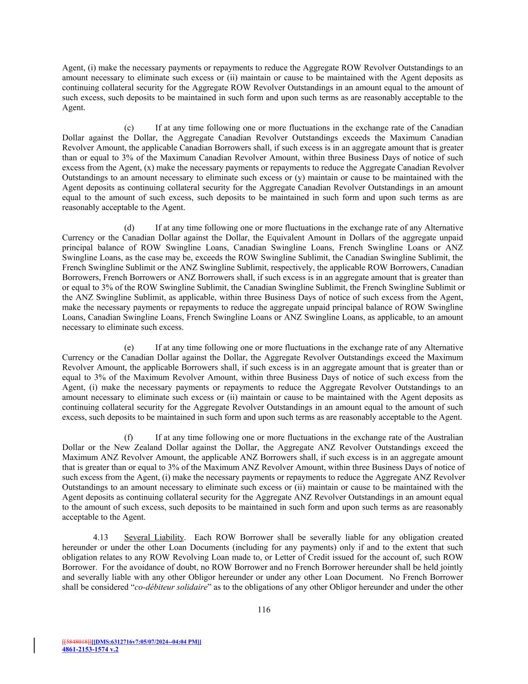 Agent, (i) make the necessary payments or repayments to reduce the Aggregate ROW Revolver Outstandings to an amount necessary to eliminate such excess or (ii) maintain or cause to be maintained with the Agent deposits as continuing collateral security for the Aggregate ROW Revolver Outstandings in an amount equal to the amount of such excess, such deposits to be maintained in such form and upon such terms as are reasonably acceptable to the Agent. (c) If at any time following one or more fluctuations in the exchange rate of the Canadian Dollar against the Dollar, the Aggregate Canadian Revolver Outstandings exceeds the Maximum Canadian Revolver Amount, the applicable Canadian Borrowers shall, if such excess is in an aggregate amount that is greater than or equal to 3% of the Maximum Canadian Revolver Amount, within three Business Days of notice of such excess from the Agent, (x) make the necessary payments or repayments to reduce the Aggregate Canadian Revolver Outstandings to an amount necessary to eliminate such excess or (y) maintain or cause to be maintained with the Agent deposits as continuing collateral security for the Aggregate Canadian Revolver Outstandings in an amount equal to the amount of such excess, such deposits to be maintained in such form and upon such terms as are reasonably acceptable to the Agent. (d) If at any time following one or more fluctuations in the exchange rate of any Alternative Currency or the Canadian Dollar against the Dollar, the Equivalent Amount in Dollars of the aggregate unpaid principal balance of ROW Swingline Loans, Canadian Swingline Loans, French Swingline Loans or ANZ Swingline Loans, as the case may be, exceeds the ROW Swingline Sublimit, the Canadian Swingline Sublimit, the French Swingline Sublimit or the ANZ Swingline Sublimit, respectively, the applicable ROW Borrowers, Canadian Borrowers, French Borrowers or ANZ Borrowers shall, if such excess is in an aggregate amount that is greater than or equal to 3% of the ROW Swingline Sublimit, the Canadian Swingline Sublimit, the French Swingline Sublimit or the ANZ Swingline Sublimit, as applicable, within three Business Days of notice of such excess from the Agent, make the necessary payments or repayments to reduce the aggregate unpaid principal balance of ROW Swingline Loans, Canadian Swingline Loans, French Swingline Loans or ANZ Swingline Loans, as applicable, to an amount necessary to eliminate such excess. (e) If at any time following one or more fluctuations in the exchange rate of any Alternative Currency or the Canadian Dollar against the Dollar, the Aggregate Revolver Outstandings exceed the Maximum Revolver Amount, the applicable Borrowers shall, if such excess is in an aggregate amount that is greater than or equal to 3% of the Maximum Revolver Amount, within three Business Days of notice of such excess from the Agent, (i) make the necessary payments or repayments to reduce the Aggregate Revolver Outstandings to an amount necessary to eliminate such excess or (ii) maintain or cause to be maintained with the Agent deposits as continuing collateral security for the Aggregate Revolver Outstandings in an amount equal to the amount of such excess, such deposits to be maintained in such form and upon such terms as are reasonably acceptable to the Agent. (f) If at any time following one or more fluctuations in the exchange rate of the Australian Dollar or the New Zealand Dollar against the Dollar, the Aggregate ANZ Revolver Outstandings exceed the Maximum ANZ Revolver Amount, the applicable ANZ Borrowers shall, if such excess is in an aggregate amount that is greater than or equal to 3% of the Maximum ANZ Revolver Amount, within three Business Days of notice of such excess from the Agent, (i) make the necessary payments or repayments to reduce the Aggregate ANZ Revolver Outstandings to an amount necessary to eliminate such excess or (ii) maintain or cause to be maintained with the Agent deposits as continuing collateral security for the Aggregate ANZ Revolver Outstandings in an amount equal to the amount of such excess, such deposits to be maintained in such form and upon such terms as are reasonably acceptable to the Agent. 4.13 Several Liability. Each ROW Borrower shall be severally liable for any obligation created hereunder or under the other Loan Documents (including for any payments) only if and to the extent that such obligation relates to any ROW Revolving Loan made to, or Letter of Credit issued for the account of, such ROW Borrower. For the avoidance of doubt, no ROW Borrower and no French Borrower hereunder shall be held jointly and severally liable with any other Obligor hereunder or under any other Loan Document. No French Borrower shall be considered “co-débiteur solidaire” as to the obligations of any other Obligor hereunder and under the other 116 [[5848018]][[DMS:6312716v7:05/07/2024--04:04 PM]] 4861-2153-1574 v.2