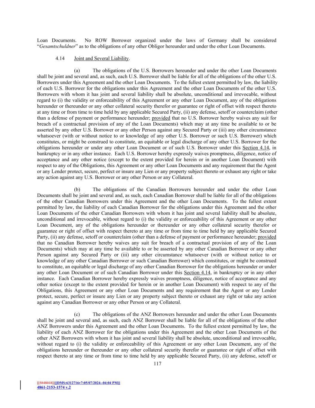 Loan Documents. No ROW Borrower organized under the laws of Germany shall be considered “Gesamtschuldner” as to the obligations of any other Obligor hereunder and under the other Loan Documents. 4.14 Joint and Several Liability. (a) The obligations of the U.S. Borrowers hereunder and under the other Loan Documents shall be joint and several and, as such, each U.S. Borrower shall be liable for all of the obligations of the other U.S. Borrowers under this Agreement and the other Loan Documents. To the fullest extent permitted by law, the liability of each U.S. Borrower for the obligations under this Agreement and the other Loan Documents of the other U.S. Borrowers with whom it has joint and several liability shall be absolute, unconditional and irrevocable, without regard to (i) the validity or enforceability of this Agreement or any other Loan Document, any of the obligations hereunder or thereunder or any other collateral security therefor or guarantee or right of offset with respect thereto at any time or from time to time held by any applicable Secured Party, (ii) any defense, setoff or counterclaim (other than a defense of payment or performance hereunder; provided that no U.S. Borrower hereby waives any suit for breach of a contractual provision of any of the Loan Documents) which may at any time be available to or be asserted by any other U.S. Borrower or any other Person against any Secured Party or (iii) any other circumstance whatsoever (with or without notice to or knowledge of any other U.S. Borrower or such U.S. Borrower) which constitutes, or might be construed to constitute, an equitable or legal discharge of any other U.S. Borrower for the obligations hereunder or under any other Loan Document or of such U.S. Borrower under this Section 4.14, in bankruptcy or in any other instance. Each U.S. Borrower hereby expressly waives promptness, diligence, notice of acceptance and any other notice (except to the extent provided for herein or in another Loan Document) with respect to any of the Obligations, this Agreement or any other Loan Documents and any requirement that the Agent or any Lender protect, secure, perfect or insure any Lien or any property subject thereto or exhaust any right or take any action against any U.S. Borrower or any other Person or any Collateral. (b) The obligations of the Canadian Borrowers hereunder and under the other Loan Documents shall be joint and several and, as such, each Canadian Borrower shall be liable for all of the obligations of the other Canadian Borrowers under this Agreement and the other Loan Documents. To the fullest extent permitted by law, the liability of each Canadian Borrower for the obligations under this Agreement and the other Loan Documents of the other Canadian Borrowers with whom it has joint and several liability shall be absolute, unconditional and irrevocable, without regard to (i) the validity or enforceability of this Agreement or any other Loan Document, any of the obligations hereunder or thereunder or any other collateral security therefor or guarantee or right of offset with respect thereto at any time or from time to time held by any applicable Secured Party, (ii) any defense, setoff or counterclaim (other than a defense of payment or performance hereunder; provided that no Canadian Borrower hereby waives any suit for breach of a contractual provision of any of the Loan Documents) which may at any time be available to or be asserted by any other Canadian Borrower or any other Person against any Secured Party or (iii) any other circumstance whatsoever (with or without notice to or knowledge of any other Canadian Borrower or such Canadian Borrower) which constitutes, or might be construed to constitute, an equitable or legal discharge of any other Canadian Borrower for the obligations hereunder or under any other Loan Document or of such Canadian Borrower under this Section 4.14, in bankruptcy or in any other instance. Each Canadian Borrower hereby expressly waives promptness, diligence, notice of acceptance and any other notice (except to the extent provided for herein or in another Loan Document) with respect to any of the Obligations, this Agreement or any other Loan Documents and any requirement that the Agent or any Lender protect, secure, perfect or insure any Lien or any property subject thereto or exhaust any right or take any action against any Canadian Borrower or any other Person or any Collateral. (c) The obligations of the ANZ Borrowers hereunder and under the other Loan Documents shall be joint and several and, as such, each ANZ Borrower shall be liable for all of the obligations of the other ANZ Borrowers under this Agreement and the other Loan Documents. To the fullest extent permitted by law, the liability of each ANZ Borrower for the obligations under this Agreement and the other Loan Documents of the other ANZ Borrowers with whom it has joint and several liability shall be absolute, unconditional and irrevocable, without regard to (i) the validity or enforceability of this Agreement or any other Loan Document, any of the obligations hereunder or thereunder or any other collateral security therefor or guarantee or right of offset with respect thereto at any time or from time to time held by any applicable Secured Party, (ii) any defense, setoff or 117 [[5848018]][[DMS:6312716v7:05/07/2024--04:04 PM]] 4861-2153-1574 v.2