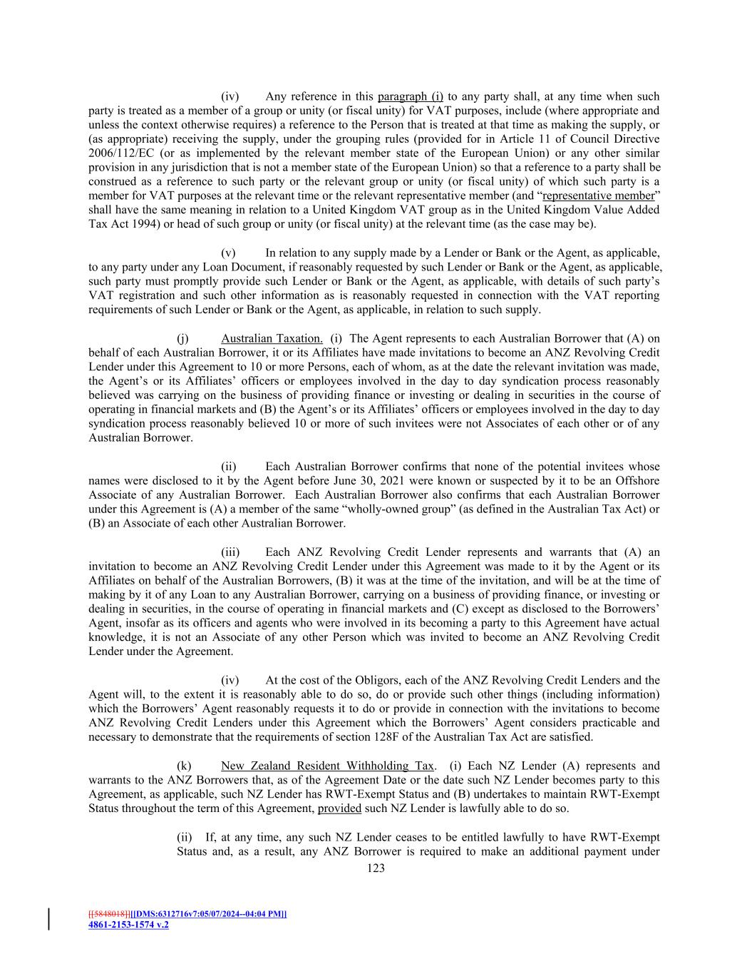 (iv) Any reference in this paragraph (i) to any party shall, at any time when such party is treated as a member of a group or unity (or fiscal unity) for VAT purposes, include (where appropriate and unless the context otherwise requires) a reference to the Person that is treated at that time as making the supply, or (as appropriate) receiving the supply, under the grouping rules (provided for in Article 11 of Council Directive 2006/112/EC (or as implemented by the relevant member state of the European Union) or any other similar provision in any jurisdiction that is not a member state of the European Union) so that a reference to a party shall be construed as a reference to such party or the relevant group or unity (or fiscal unity) of which such party is a member for VAT purposes at the relevant time or the relevant representative member (and “representative member” shall have the same meaning in relation to a United Kingdom VAT group as in the United Kingdom Value Added Tax Act 1994) or head of such group or unity (or fiscal unity) at the relevant time (as the case may be). (v) In relation to any supply made by a Lender or Bank or the Agent, as applicable, to any party under any Loan Document, if reasonably requested by such Lender or Bank or the Agent, as applicable, such party must promptly provide such Lender or Bank or the Agent, as applicable, with details of such party’s VAT registration and such other information as is reasonably requested in connection with the VAT reporting requirements of such Lender or Bank or the Agent, as applicable, in relation to such supply. (j) Australian Taxation. (i) The Agent represents to each Australian Borrower that (A) on behalf of each Australian Borrower, it or its Affiliates have made invitations to become an ANZ Revolving Credit Lender under this Agreement to 10 or more Persons, each of whom, as at the date the relevant invitation was made, the Agent’s or its Affiliates’ officers or employees involved in the day to day syndication process reasonably believed was carrying on the business of providing finance or investing or dealing in securities in the course of operating in financial markets and (B) the Agent’s or its Affiliates’ officers or employees involved in the day to day syndication process reasonably believed 10 or more of such invitees were not Associates of each other or of any Australian Borrower. (ii) Each Australian Borrower confirms that none of the potential invitees whose names were disclosed to it by the Agent before June 30, 2021 were known or suspected by it to be an Offshore Associate of any Australian Borrower. Each Australian Borrower also confirms that each Australian Borrower under this Agreement is (A) a member of the same “wholly-owned group” (as defined in the Australian Tax Act) or (B) an Associate of each other Australian Borrower. (iii) Each ANZ Revolving Credit Lender represents and warrants that (A) an invitation to become an ANZ Revolving Credit Lender under this Agreement was made to it by the Agent or its Affiliates on behalf of the Australian Borrowers, (B) it was at the time of the invitation, and will be at the time of making by it of any Loan to any Australian Borrower, carrying on a business of providing finance, or investing or dealing in securities, in the course of operating in financial markets and (C) except as disclosed to the Borrowers’ Agent, insofar as its officers and agents who were involved in its becoming a party to this Agreement have actual knowledge, it is not an Associate of any other Person which was invited to become an ANZ Revolving Credit Lender under the Agreement. (iv) At the cost of the Obligors, each of the ANZ Revolving Credit Lenders and the Agent will, to the extent it is reasonably able to do so, do or provide such other things (including information) which the Borrowers’ Agent reasonably requests it to do or provide in connection with the invitations to become ANZ Revolving Credit Lenders under this Agreement which the Borrowers’ Agent considers practicable and necessary to demonstrate that the requirements of section 128F of the Australian Tax Act are satisfied. (k) New Zealand Resident Withholding Tax. (i) Each NZ Lender (A) represents and warrants to the ANZ Borrowers that, as of the Agreement Date or the date such NZ Lender becomes party to this Agreement, as applicable, such NZ Lender has RWT-Exempt Status and (B) undertakes to maintain RWT-Exempt Status throughout the term of this Agreement, provided such NZ Lender is lawfully able to do so. (ii) If, at any time, any such NZ Lender ceases to be entitled lawfully to have RWT-Exempt Status and, as a result, any ANZ Borrower is required to make an additional payment under 123 [[5848018]][[DMS:6312716v7:05/07/2024--04:04 PM]] 4861-2153-1574 v.2
