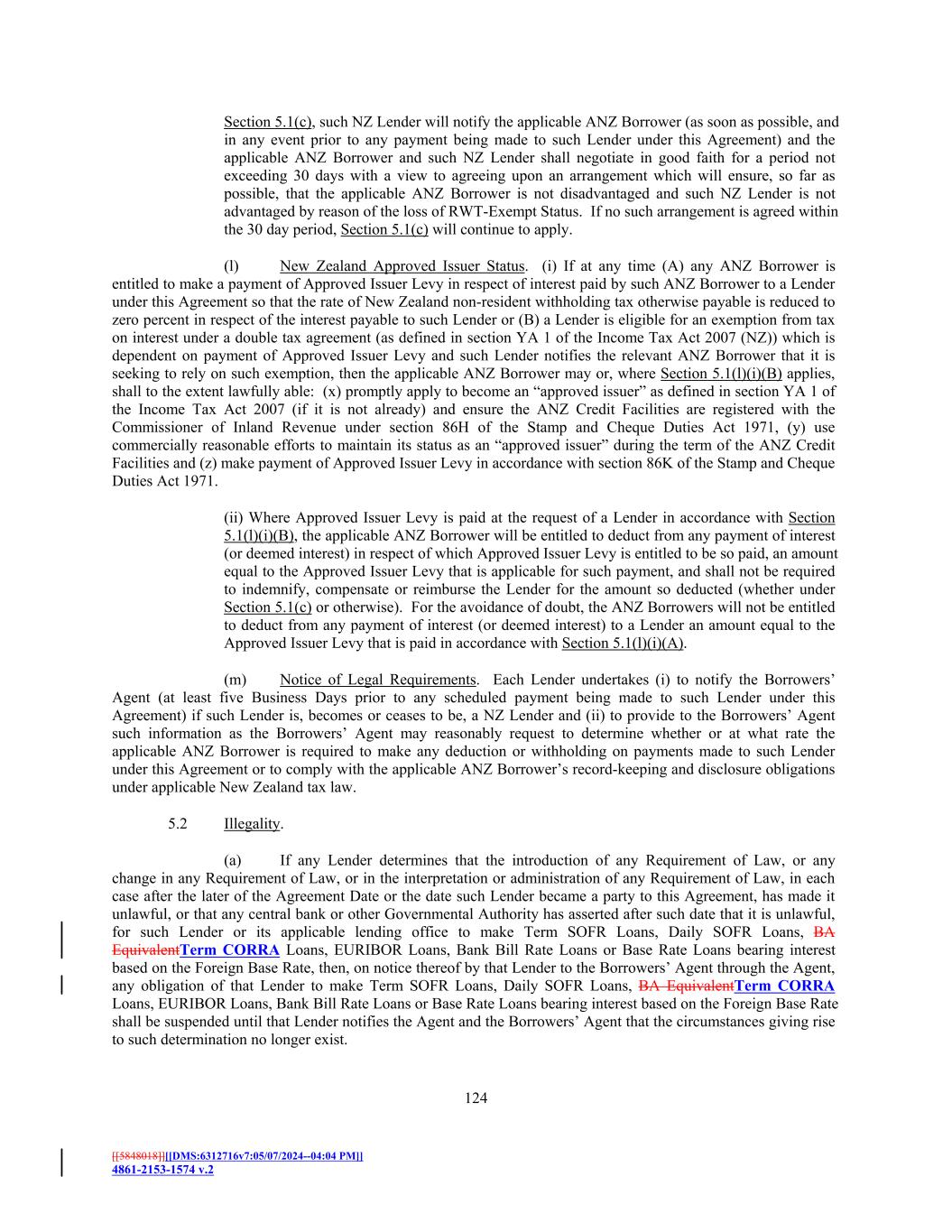 Section 5.1(c), such NZ Lender will notify the applicable ANZ Borrower (as soon as possible, and in any event prior to any payment being made to such Lender under this Agreement) and the applicable ANZ Borrower and such NZ Lender shall negotiate in good faith for a period not exceeding 30 days with a view to agreeing upon an arrangement which will ensure, so far as possible, that the applicable ANZ Borrower is not disadvantaged and such NZ Lender is not advantaged by reason of the loss of RWT-Exempt Status. If no such arrangement is agreed within the 30 day period, Section 5.1(c) will continue to apply. (l) New Zealand Approved Issuer Status. (i) If at any time (A) any ANZ Borrower is entitled to make a payment of Approved Issuer Levy in respect of interest paid by such ANZ Borrower to a Lender under this Agreement so that the rate of New Zealand non-resident withholding tax otherwise payable is reduced to zero percent in respect of the interest payable to such Lender or (B) a Lender is eligible for an exemption from tax on interest under a double tax agreement (as defined in section YA 1 of the Income Tax Act 2007 (NZ)) which is dependent on payment of Approved Issuer Levy and such Lender notifies the relevant ANZ Borrower that it is seeking to rely on such exemption, then the applicable ANZ Borrower may or, where Section 5.1(l)(i)(B) applies, shall to the extent lawfully able: (x) promptly apply to become an “approved issuer” as defined in section YA 1 of the Income Tax Act 2007 (if it is not already) and ensure the ANZ Credit Facilities are registered with the Commissioner of Inland Revenue under section 86H of the Stamp and Cheque Duties Act 1971, (y) use commercially reasonable efforts to maintain its status as an “approved issuer” during the term of the ANZ Credit Facilities and (z) make payment of Approved Issuer Levy in accordance with section 86K of the Stamp and Cheque Duties Act 1971. (ii) Where Approved Issuer Levy is paid at the request of a Lender in accordance with Section 5.1(l)(i)(B), the applicable ANZ Borrower will be entitled to deduct from any payment of interest (or deemed interest) in respect of which Approved Issuer Levy is entitled to be so paid, an amount equal to the Approved Issuer Levy that is applicable for such payment, and shall not be required to indemnify, compensate or reimburse the Lender for the amount so deducted (whether under Section 5.1(c) or otherwise). For the avoidance of doubt, the ANZ Borrowers will not be entitled to deduct from any payment of interest (or deemed interest) to a Lender an amount equal to the Approved Issuer Levy that is paid in accordance with Section 5.1(l)(i)(A). (m) Notice of Legal Requirements. Each Lender undertakes (i) to notify the Borrowers’ Agent (at least five Business Days prior to any scheduled payment being made to such Lender under this Agreement) if such Lender is, becomes or ceases to be, a NZ Lender and (ii) to provide to the Borrowers’ Agent such information as the Borrowers’ Agent may reasonably request to determine whether or at what rate the applicable ANZ Borrower is required to make any deduction or withholding on payments made to such Lender under this Agreement or to comply with the applicable ANZ Borrower’s record-keeping and disclosure obligations under applicable New Zealand tax law. 5.2 Illegality. (a) If any Lender determines that the introduction of any Requirement of Law, or any change in any Requirement of Law, or in the interpretation or administration of any Requirement of Law, in each case after the later of the Agreement Date or the date such Lender became a party to this Agreement, has made it unlawful, or that any central bank or other Governmental Authority has asserted after such date that it is unlawful, for such Lender or its applicable lending office to make Term SOFR Loans, Daily SOFR Loans, BA EquivalentTerm CORRA Loans, EURIBOR Loans, Bank Bill Rate Loans or Base Rate Loans bearing interest based on the Foreign Base Rate, then, on notice thereof by that Lender to the Borrowers’ Agent through the Agent, any obligation of that Lender to make Term SOFR Loans, Daily SOFR Loans, BA EquivalentTerm CORRA Loans, EURIBOR Loans, Bank Bill Rate Loans or Base Rate Loans bearing interest based on the Foreign Base Rate shall be suspended until that Lender notifies the Agent and the Borrowers’ Agent that the circumstances giving rise to such determination no longer exist. 124 [[5848018]][[DMS:6312716v7:05/07/2024--04:04 PM]] 4861-2153-1574 v.2