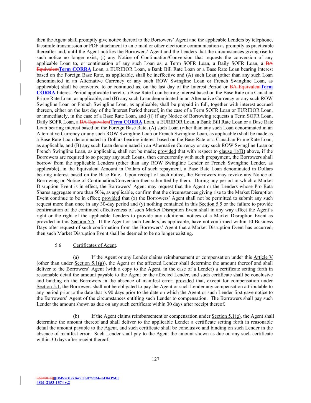 then the Agent shall promptly give notice thereof to the Borrowers’ Agent and the applicable Lenders by telephone, facsimile transmission or PDF attachment to an e-mail or other electronic communication as promptly as practicable thereafter and, until the Agent notifies the Borrowers’ Agent and the Lenders that the circumstances giving rise to such notice no longer exist, (i) any Notice of Continuation/Conversion that requests the conversion of any applicable Loan to, or continuation of any such Loan as, a Term SOFR Loan, a Daily SOFR Loan, a BA EquivalentTerm CORRA Loan, a EURIBOR Loan, a Bank Bill Rate Loan or a Base Rate Loan bearing interest based on the Foreign Base Rate, as applicable, shall be ineffective and (A) such Loan (other than any such Loan denominated in an Alternative Currency or any such ROW Swingline Loan or French Swingline Loan, as applicable) shall be converted to or continued as, on the last day of the Interest Period or BA EquivalentTerm CORRA Interest Period applicable thereto, a Base Rate Loan bearing interest based on the Base Rate or a Canadian Prime Rate Loan, as applicable, and (B) any such Loan denominated in an Alternative Currency or any such ROW Swingline Loan or French Swingline Loan, as applicable, shall be prepaid in full, together with interest accrued thereon, either on the last day of the Interest Period thereof, in the case of a Term SOFR Loan or EURIBOR Loan, or immediately, in the case of a Base Rate Loan, and (ii) if any Notice of Borrowing requests a Term SOFR Loan, Daily SOFR Loan, a BA EquivalentTerm CORRA Loan, a EURIBOR Loan, a Bank Bill Rate Loan or a Base Rate Loan bearing interest based on the Foreign Base Rate, (A) such Loan (other than any such Loan denominated in an Alternative Currency or any such ROW Swingline Loan or French Swingline Loan, as applicable) shall be made as a Base Rate Loan denominated in Dollars bearing interest based on the Base Rate or a Canadian Prime Rate Loan, as applicable, and (B) any such Loan denominated in an Alternative Currency or any such ROW Swingline Loan or French Swingline Loan, as applicable, shall not be made; provided that with respect to clause (i)(B) above, if the Borrowers are required to so prepay any such Loans, then concurrently with such prepayment, the Borrowers shall borrow from the applicable Lenders (other than any ROW Swingline Lender or French Swingline Lender, as applicable), in the Equivalent Amount in Dollars of such repayment, a Base Rate Loan denominated in Dollars bearing interest based on the Base Rate. Upon receipt of such notice, the Borrowers may revoke any Notice of Borrowing or Notice of Continuation/Conversion then submitted by them. During any period in which a Market Disruption Event is in effect, the Borrowers’ Agent may request that the Agent or the Lenders whose Pro Rata Shares aggregate more than 50%, as applicable, confirm that the circumstances giving rise to the Market Disruption Event continue to be in effect; provided that (x) the Borrowers’ Agent shall not be permitted to submit any such request more than once in any 30-day period and (y) nothing contained in this Section 5.5 or the failure to provide confirmation of the continued effectiveness of such Market Disruption Event shall in any way affect the Agent’s right or the right of the applicable Lenders to provide any additional notices of a Market Disruption Event as provided in this Section 5.5. If the Agent or such Lenders, as applicable, have not confirmed within 10 Business Days after request of such confirmation from the Borrowers’ Agent that a Market Disruption Event has occurred, then such Market Disruption Event shall be deemed to be no longer existing. 5.6 Certificates of Agent. (a) If the Agent or any Lender claims reimbursement or compensation under this Article V (other than under Section 5.1(g)), the Agent or the affected Lender shall determine the amount thereof and shall deliver to the Borrowers’ Agent (with a copy to the Agent, in the case of a Lender) a certificate setting forth in reasonable detail the amount payable to the Agent or the affected Lender, and such certificate shall be conclusive and binding on the Borrowers in the absence of manifest error; provided that, except for compensation under Section 5.1, the Borrowers shall not be obligated to pay the Agent or such Lender any compensation attributable to any period prior to the date that is 90 days prior to the date on which the Agent or such Lender first gave notice to the Borrowers’ Agent of the circumstances entitling such Lender to compensation. The Borrowers shall pay such Lender the amount shown as due on any such certificate within 30 days after receipt thereof. (b) If the Agent claims reimbursement or compensation under Section 5.1(g), the Agent shall determine the amount thereof and shall deliver to the applicable Lender a certificate setting forth in reasonable detail the amount payable to the Agent, and such certificate shall be conclusive and binding on such Lender in the absence of manifest error. Such Lender shall pay to the Agent the amount shown as due on any such certificate within 30 days after receipt thereof. 127 [[5848018]][[DMS:6312716v7:05/07/2024--04:04 PM]] 4861-2153-1574 v.2