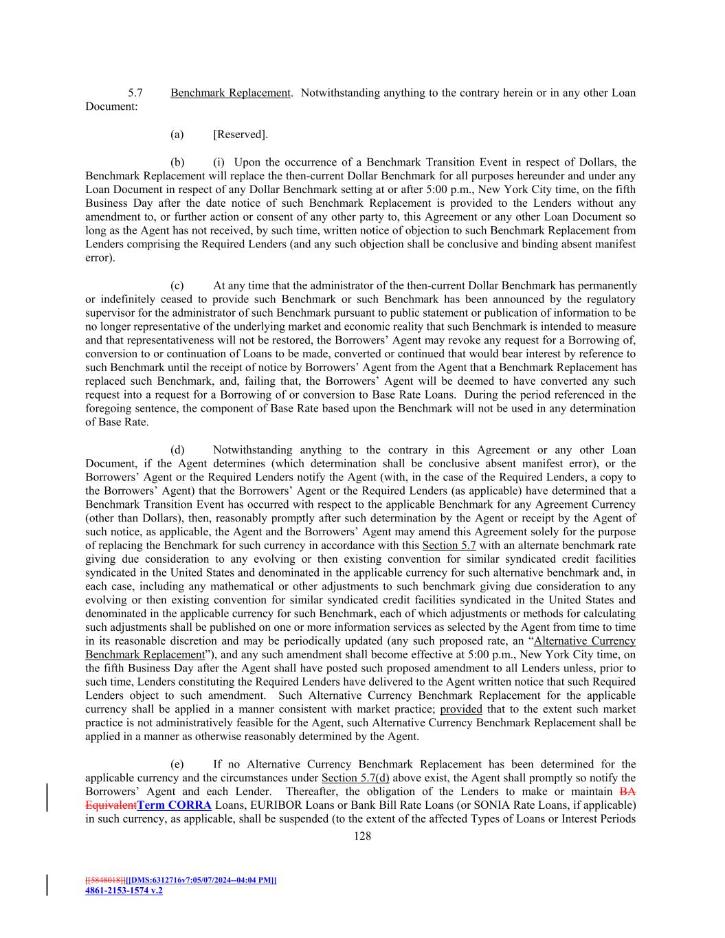 5.7 Benchmark Replacement. Notwithstanding anything to the contrary herein or in any other Loan Document: (a) [Reserved]. (b) (i) Upon the occurrence of a Benchmark Transition Event in respect of Dollars, the Benchmark Replacement will replace the then-current Dollar Benchmark for all purposes hereunder and under any Loan Document in respect of any Dollar Benchmark setting at or after 5:00 p.m., New York City time, on the fifth Business Day after the date notice of such Benchmark Replacement is provided to the Lenders without any amendment to, or further action or consent of any other party to, this Agreement or any other Loan Document so long as the Agent has not received, by such time, written notice of objection to such Benchmark Replacement from Lenders comprising the Required Lenders (and any such objection shall be conclusive and binding absent manifest error). (c) At any time that the administrator of the then-current Dollar Benchmark has permanently or indefinitely ceased to provide such Benchmark or such Benchmark has been announced by the regulatory supervisor for the administrator of such Benchmark pursuant to public statement or publication of information to be no longer representative of the underlying market and economic reality that such Benchmark is intended to measure and that representativeness will not be restored, the Borrowers’ Agent may revoke any request for a Borrowing of, conversion to or continuation of Loans to be made, converted or continued that would bear interest by reference to such Benchmark until the receipt of notice by Borrowers’ Agent from the Agent that a Benchmark Replacement has replaced such Benchmark, and, failing that, the Borrowers’ Agent will be deemed to have converted any such request into a request for a Borrowing of or conversion to Base Rate Loans. During the period referenced in the foregoing sentence, the component of Base Rate based upon the Benchmark will not be used in any determination of Base Rate. (d) Notwithstanding anything to the contrary in this Agreement or any other Loan Document, if the Agent determines (which determination shall be conclusive absent manifest error), or the Borrowers’ Agent or the Required Lenders notify the Agent (with, in the case of the Required Lenders, a copy to the Borrowers’ Agent) that the Borrowers’ Agent or the Required Lenders (as applicable) have determined that a Benchmark Transition Event has occurred with respect to the applicable Benchmark for any Agreement Currency (other than Dollars), then, reasonably promptly after such determination by the Agent or receipt by the Agent of such notice, as applicable, the Agent and the Borrowers’ Agent may amend this Agreement solely for the purpose of replacing the Benchmark for such currency in accordance with this Section 5.7 with an alternate benchmark rate giving due consideration to any evolving or then existing convention for similar syndicated credit facilities syndicated in the United States and denominated in the applicable currency for such alternative benchmark and, in each case, including any mathematical or other adjustments to such benchmark giving due consideration to any evolving or then existing convention for similar syndicated credit facilities syndicated in the United States and denominated in the applicable currency for such Benchmark, each of which adjustments or methods for calculating such adjustments shall be published on one or more information services as selected by the Agent from time to time in its reasonable discretion and may be periodically updated (any such proposed rate, an “Alternative Currency Benchmark Replacement”), and any such amendment shall become effective at 5:00 p.m., New York City time, on the fifth Business Day after the Agent shall have posted such proposed amendment to all Lenders unless, prior to such time, Lenders constituting the Required Lenders have delivered to the Agent written notice that such Required Lenders object to such amendment. Such Alternative Currency Benchmark Replacement for the applicable currency shall be applied in a manner consistent with market practice; provided that to the extent such market practice is not administratively feasible for the Agent, such Alternative Currency Benchmark Replacement shall be applied in a manner as otherwise reasonably determined by the Agent. (e) If no Alternative Currency Benchmark Replacement has been determined for the applicable currency and the circumstances under Section 5.7(d) above exist, the Agent shall promptly so notify the Borrowers’ Agent and each Lender. Thereafter, the obligation of the Lenders to make or maintain BA EquivalentTerm CORRA Loans, EURIBOR Loans or Bank Bill Rate Loans (or SONIA Rate Loans, if applicable) in such currency, as applicable, shall be suspended (to the extent of the affected Types of Loans or Interest Periods 128 [[5848018]][[DMS:6312716v7:05/07/2024--04:04 PM]] 4861-2153-1574 v.2