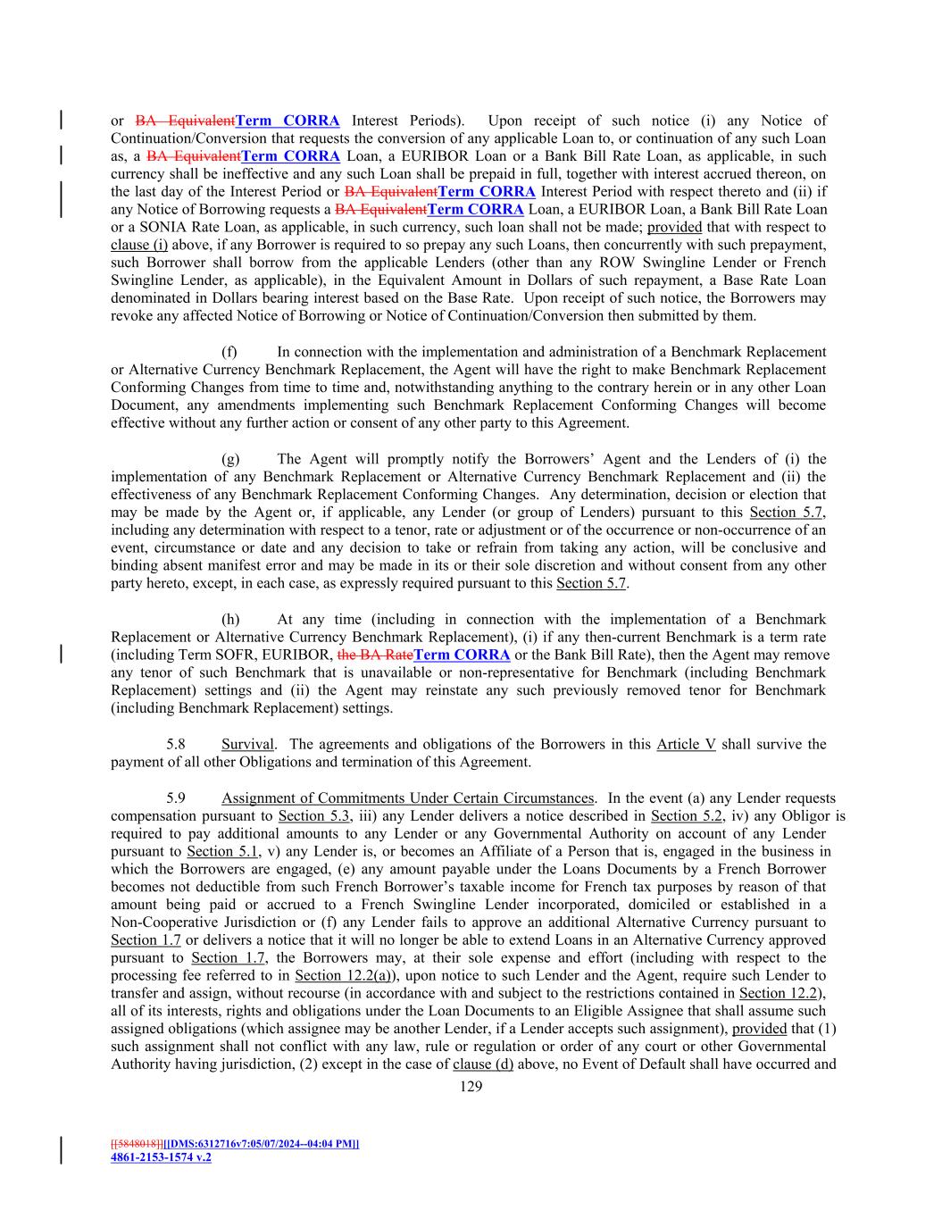 or BA EquivalentTerm CORRA Interest Periods). Upon receipt of such notice (i) any Notice of Continuation/Conversion that requests the conversion of any applicable Loan to, or continuation of any such Loan as, a BA EquivalentTerm CORRA Loan, a EURIBOR Loan or a Bank Bill Rate Loan, as applicable, in such currency shall be ineffective and any such Loan shall be prepaid in full, together with interest accrued thereon, on the last day of the Interest Period or BA EquivalentTerm CORRA Interest Period with respect thereto and (ii) if any Notice of Borrowing requests a BA EquivalentTerm CORRA Loan, a EURIBOR Loan, a Bank Bill Rate Loan or a SONIA Rate Loan, as applicable, in such currency, such loan shall not be made; provided that with respect to clause (i) above, if any Borrower is required to so prepay any such Loans, then concurrently with such prepayment, such Borrower shall borrow from the applicable Lenders (other than any ROW Swingline Lender or French Swingline Lender, as applicable), in the Equivalent Amount in Dollars of such repayment, a Base Rate Loan denominated in Dollars bearing interest based on the Base Rate. Upon receipt of such notice, the Borrowers may revoke any affected Notice of Borrowing or Notice of Continuation/Conversion then submitted by them. (f) In connection with the implementation and administration of a Benchmark Replacement or Alternative Currency Benchmark Replacement, the Agent will have the right to make Benchmark Replacement Conforming Changes from time to time and, notwithstanding anything to the contrary herein or in any other Loan Document, any amendments implementing such Benchmark Replacement Conforming Changes will become effective without any further action or consent of any other party to this Agreement. (g) The Agent will promptly notify the Borrowers’ Agent and the Lenders of (i) the implementation of any Benchmark Replacement or Alternative Currency Benchmark Replacement and (ii) the effectiveness of any Benchmark Replacement Conforming Changes. Any determination, decision or election that may be made by the Agent or, if applicable, any Lender (or group of Lenders) pursuant to this Section 5.7, including any determination with respect to a tenor, rate or adjustment or of the occurrence or non-occurrence of an event, circumstance or date and any decision to take or refrain from taking any action, will be conclusive and binding absent manifest error and may be made in its or their sole discretion and without consent from any other party hereto, except, in each case, as expressly required pursuant to this Section 5.7. (h) At any time (including in connection with the implementation of a Benchmark Replacement or Alternative Currency Benchmark Replacement), (i) if any then-current Benchmark is a term rate (including Term SOFR, EURIBOR, the BA RateTerm CORRA or the Bank Bill Rate), then the Agent may remove any tenor of such Benchmark that is unavailable or non-representative for Benchmark (including Benchmark Replacement) settings and (ii) the Agent may reinstate any such previously removed tenor for Benchmark (including Benchmark Replacement) settings. 5.8 Survival. The agreements and obligations of the Borrowers in this Article V shall survive the payment of all other Obligations and termination of this Agreement. 5.9 Assignment of Commitments Under Certain Circumstances. In the event (a) any Lender requests compensation pursuant to Section 5.3, iii) any Lender delivers a notice described in Section 5.2, iv) any Obligor is required to pay additional amounts to any Lender or any Governmental Authority on account of any Lender pursuant to Section 5.1, v) any Lender is, or becomes an Affiliate of a Person that is, engaged in the business in which the Borrowers are engaged, (e) any amount payable under the Loans Documents by a French Borrower becomes not deductible from such French Borrower’s taxable income for French tax purposes by reason of that amount being paid or accrued to a French Swingline Lender incorporated, domiciled or established in a Non-Cooperative Jurisdiction or (f) any Lender fails to approve an additional Alternative Currency pursuant to Section 1.7 or delivers a notice that it will no longer be able to extend Loans in an Alternative Currency approved pursuant to Section 1.7, the Borrowers may, at their sole expense and effort (including with respect to the processing fee referred to in Section 12.2(a)), upon notice to such Lender and the Agent, require such Lender to transfer and assign, without recourse (in accordance with and subject to the restrictions contained in Section 12.2), all of its interests, rights and obligations under the Loan Documents to an Eligible Assignee that shall assume such assigned obligations (which assignee may be another Lender, if a Lender accepts such assignment), provided that (1) such assignment shall not conflict with any law, rule or regulation or order of any court or other Governmental Authority having jurisdiction, (2) except in the case of clause (d) above, no Event of Default shall have occurred and 129 [[5848018]][[DMS:6312716v7:05/07/2024--04:04 PM]] 4861-2153-1574 v.2