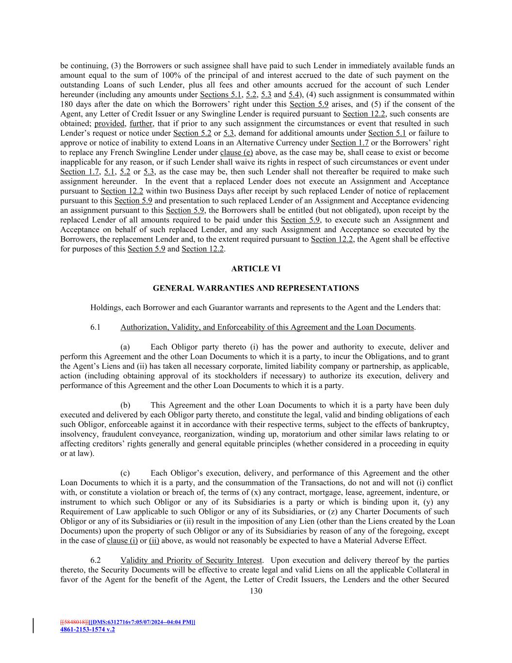 be continuing, (3) the Borrowers or such assignee shall have paid to such Lender in immediately available funds an amount equal to the sum of 100% of the principal of and interest accrued to the date of such payment on the outstanding Loans of such Lender, plus all fees and other amounts accrued for the account of such Lender hereunder (including any amounts under Sections 5.1, 5.2, 5.3 and 5.4), (4) such assignment is consummated within 180 days after the date on which the Borrowers’ right under this Section 5.9 arises, and (5) if the consent of the Agent, any Letter of Credit Issuer or any Swingline Lender is required pursuant to Section 12.2, such consents are obtained; provided, further, that if prior to any such assignment the circumstances or event that resulted in such Lender’s request or notice under Section 5.2 or 5.3, demand for additional amounts under Section 5.1 or failure to approve or notice of inability to extend Loans in an Alternative Currency under Section 1.7 or the Borrowers’ right to replace any French Swingline Lender under clause (e) above, as the case may be, shall cease to exist or become inapplicable for any reason, or if such Lender shall waive its rights in respect of such circumstances or event under Section 1.7, 5.1, 5.2 or 5.3, as the case may be, then such Lender shall not thereafter be required to make such assignment hereunder. In the event that a replaced Lender does not execute an Assignment and Acceptance pursuant to Section 12.2 within two Business Days after receipt by such replaced Lender of notice of replacement pursuant to this Section 5.9 and presentation to such replaced Lender of an Assignment and Acceptance evidencing an assignment pursuant to this Section 5.9, the Borrowers shall be entitled (but not obligated), upon receipt by the replaced Lender of all amounts required to be paid under this Section 5.9, to execute such an Assignment and Acceptance on behalf of such replaced Lender, and any such Assignment and Acceptance so executed by the Borrowers, the replacement Lender and, to the extent required pursuant to Section 12.2, the Agent shall be effective for purposes of this Section 5.9 and Section 12.2. ARTICLE VI GENERAL WARRANTIES AND REPRESENTATIONS Holdings, each Borrower and each Guarantor warrants and represents to the Agent and the Lenders that: 6.1 Authorization, Validity, and Enforceability of this Agreement and the Loan Documents. (a) Each Obligor party thereto (i) has the power and authority to execute, deliver and perform this Agreement and the other Loan Documents to which it is a party, to incur the Obligations, and to grant the Agent’s Liens and (ii) has taken all necessary corporate, limited liability company or partnership, as applicable, action (including obtaining approval of its stockholders if necessary) to authorize its execution, delivery and performance of this Agreement and the other Loan Documents to which it is a party. (b) This Agreement and the other Loan Documents to which it is a party have been duly executed and delivered by each Obligor party thereto, and constitute the legal, valid and binding obligations of each such Obligor, enforceable against it in accordance with their respective terms, subject to the effects of bankruptcy, insolvency, fraudulent conveyance, reorganization, winding up, moratorium and other similar laws relating to or affecting creditors’ rights generally and general equitable principles (whether considered in a proceeding in equity or at law). (c) Each Obligor’s execution, delivery, and performance of this Agreement and the other Loan Documents to which it is a party, and the consummation of the Transactions, do not and will not (i) conflict with, or constitute a violation or breach of, the terms of (x) any contract, mortgage, lease, agreement, indenture, or instrument to which such Obligor or any of its Subsidiaries is a party or which is binding upon it, (y) any Requirement of Law applicable to such Obligor or any of its Subsidiaries, or (z) any Charter Documents of such Obligor or any of its Subsidiaries or (ii) result in the imposition of any Lien (other than the Liens created by the Loan Documents) upon the property of such Obligor or any of its Subsidiaries by reason of any of the foregoing, except in the case of clause (i) or (ii) above, as would not reasonably be expected to have a Material Adverse Effect. 6.2 Validity and Priority of Security Interest. Upon execution and delivery thereof by the parties thereto, the Security Documents will be effective to create legal and valid Liens on all the applicable Collateral in favor of the Agent for the benefit of the Agent, the Letter of Credit Issuers, the Lenders and the other Secured 130 [[5848018]][[DMS:6312716v7:05/07/2024--04:04 PM]] 4861-2153-1574 v.2