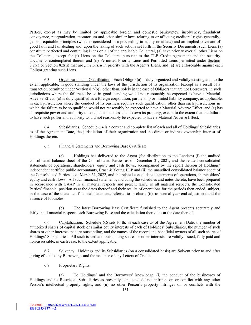 Parties, except as may be limited by applicable foreign and domestic bankruptcy, insolvency, fraudulent conveyance, reorganization, moratorium and other similar laws relating to or affecting creditors’ rights generally, general equitable principles (whether considered in a proceeding in equity or at law) and an implied covenant of good faith and fair dealing and, upon the taking of such actions set forth in the Security Documents, such Liens (a) constitute perfected and continuing Liens on all of the applicable Collateral, (a) have priority over all other Liens on the Collateral, except for (i) Liens on the Collateral pursuant to the TLB Credit Agreement and the security documents contemplated therein and (ii) Permitted Priority Liens and Permitted Liens permitted under Section 8.2(c) or Section 8.2(ii) that are pari passu in priority with the Agent’s Liens, and (a) are enforceable against each Obligor granting such Liens. 6.3 Organization and Qualification. Each Obligor (a) is duly organized and validly existing and, to the extent applicable, in good standing under the laws of the jurisdiction of its organization (except as a result of a transaction permitted under Section 8.5(b)), other than, solely in the case of Obligors that are not Borrowers, in such jurisdictions where the failure to be so in good standing would not reasonably be expected to have a Material Adverse Effect, (a) is duly qualified as a foreign corporation, partnership or limited liability company, as applicable, in each jurisdiction where the conduct of its business requires such qualification, other than such jurisdictions in which the failure to be so qualified would not reasonably be expected to have a Material Adverse Effect, and (a) has all requisite power and authority to conduct its business and to own its property, except to the extent that the failure to have such power and authority would not reasonably be expected to have a Material Adverse Effect. 6.4 Subsidiaries. Schedule 6.4 is a correct and complete list of each and all of Holdings’ Subsidiaries as of the Agreement Date, the jurisdiction of their organization and the direct or indirect ownership interest of Holdings therein. 6.5 Financial Statements and Borrowing Base Certificate. (a) Holdings has delivered to the Agent (for distribution to the Lenders) (i) the audited consolidated balance sheet of the Consolidated Parties as of December 31, 2021, and the related consolidated statements of operations, shareholders’ equity and cash flows, accompanied by the report thereon of Holdings’ independent certified public accountants, Ernst & Young LLP and (ii) the unaudited consolidated balance sheet of the Consolidated Parties as of March 31, 2022, and the related consolidated statements of operations, shareholders’ equity and cash flows. All such financial statements, including the schedules and notes thereto, have been prepared in accordance with GAAP in all material respects and present fairly, in all material respects, the Consolidated Parties’ financial position as at the dates thereof and their results of operations for the periods then ended, subject, in the case of the unaudited financial statements referred to in clause (ii), to normal year-end adjustment and the absence of footnotes. (b) The latest Borrowing Base Certificate furnished to the Agent presents accurately and fairly in all material respects each Borrowing Base and the calculation thereof as at the date thereof. 6.6 Capitalization. Schedule 6.6 sets forth, in each case as of the Agreement Date, the number of authorized shares of capital stock or similar equity interests of each of Holdings’ Subsidiaries, the number of such shares or other interests that are outstanding, and the names of the record and beneficial owners of all such shares of Holdings’ Subsidiaries. All such issued and outstanding shares or other interests are validly issued, fully paid and non-assessable, in each case, to the extent applicable. 6.7 Solvency. Holdings and its Subsidiaries (on a consolidated basis) are Solvent prior to and after giving effect to any Borrowings and the issuance of any Letters of Credit. 6.8 Proprietary Rights. (a) To Holdings’ and the Borrowers’ knowledge, (i) the conduct of the businesses of Holdings and its Restricted Subsidiaries as presently conducted do not infringe on or conflict with any other Person’s intellectual property rights, and (ii) no other Person’s property infringes on or conflicts with the 131 [[5848018]][[DMS:6312716v7:05/07/2024--04:04 PM]] 4861-2153-1574 v.2