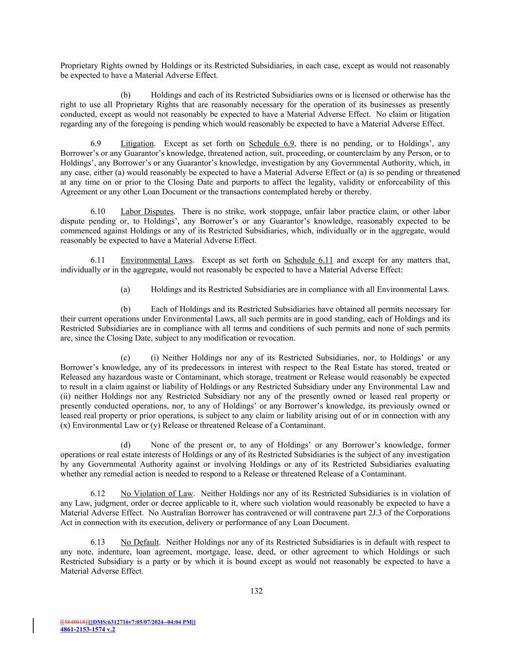 Proprietary Rights owned by Holdings or its Restricted Subsidiaries, in each case, except as would not reasonably be expected to have a Material Adverse Effect. (b) Holdings and each of its Restricted Subsidiaries owns or is licensed or otherwise has the right to use all Proprietary Rights that are reasonably necessary for the operation of its businesses as presently conducted, except as would not reasonably be expected to have a Material Adverse Effect. No claim or litigation regarding any of the foregoing is pending which would reasonably be expected to have a Material Adverse Effect. 6.9 Litigation. Except as set forth on Schedule 6.9, there is no pending, or to Holdings’, any Borrower’s or any Guarantor’s knowledge, threatened action, suit, proceeding, or counterclaim by any Person, or to Holdings’, any Borrower’s or any Guarantor’s knowledge, investigation by any Governmental Authority, which, in any case, either (a) would reasonably be expected to have a Material Adverse Effect or (a) is so pending or threatened at any time on or prior to the Closing Date and purports to affect the legality, validity or enforceability of this Agreement or any other Loan Document or the transactions contemplated hereby or thereby. 6.10 Labor Disputes. There is no strike, work stoppage, unfair labor practice claim, or other labor dispute pending or, to Holdings’, any Borrower’s or any Guarantor’s knowledge, reasonably expected to be commenced against Holdings or any of its Restricted Subsidiaries, which, individually or in the aggregate, would reasonably be expected to have a Material Adverse Effect. 6.11 Environmental Laws. Except as set forth on Schedule 6.11 and except for any matters that, individually or in the aggregate, would not reasonably be expected to have a Material Adverse Effect: (a) Holdings and its Restricted Subsidiaries are in compliance with all Environmental Laws. (b) Each of Holdings and its Restricted Subsidiaries have obtained all permits necessary for their current operations under Environmental Laws, all such permits are in good standing, each of Holdings and its Restricted Subsidiaries are in compliance with all terms and conditions of such permits and none of such permits are, since the Closing Date, subject to any modification or revocation. (c) (i) Neither Holdings nor any of its Restricted Subsidiaries, nor, to Holdings’ or any Borrower’s knowledge, any of its predecessors in interest with respect to the Real Estate has stored, treated or Released any hazardous waste or Contaminant, which storage, treatment or Release would reasonably be expected to result in a claim against or liability of Holdings or any Restricted Subsidiary under any Environmental Law and (ii) neither Holdings nor any Restricted Subsidiary nor any of the presently owned or leased real property or presently conducted operations, nor, to any of Holdings’ or any Borrower’s knowledge, its previously owned or leased real property or prior operations, is subject to any claim or liability arising out of or in connection with any (x) Environmental Law or (y) Release or threatened Release of a Contaminant. (d) None of the present or, to any of Holdings’ or any Borrower’s knowledge, former operations or real estate interests of Holdings or any of its Restricted Subsidiaries is the subject of any investigation by any Governmental Authority against or involving Holdings or any of its Restricted Subsidiaries evaluating whether any remedial action is needed to respond to a Release or threatened Release of a Contaminant. 6.12 No Violation of Law. Neither Holdings nor any of its Restricted Subsidiaries is in violation of any Law, judgment, order or decree applicable to it, where such violation would reasonably be expected to have a Material Adverse Effect. No Australian Borrower has contravened or will contravene part 2J.3 of the Corporations Act in connection with its execution, delivery or performance of any Loan Document. 6.13 No Default. Neither Holdings nor any of its Restricted Subsidiaries is in default with respect to any note, indenture, loan agreement, mortgage, lease, deed, or other agreement to which Holdings or such Restricted Subsidiary is a party or by which it is bound except as would not reasonably be expected to have a Material Adverse Effect. 132 [[5848018]][[DMS:6312716v7:05/07/2024--04:04 PM]] 4861-2153-1574 v.2