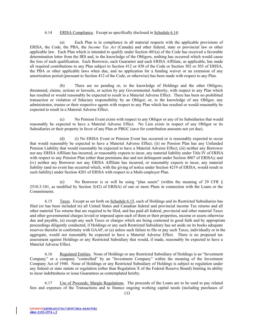 6.14 ERISA Compliance. Except as specifically disclosed in Schedule 6.14: (a) Each Plan is in compliance in all material respects with the applicable provisions of ERISA, the Code, the PBA, the Income Tax Act (Canada) and other federal, state or provincial law or other applicable law. Each Plan which is intended to qualify under Section 401(a) of the Code has received a favorable determination letter from the IRS and, to the knowledge of the Obligors, nothing has occurred which would cause the loss of such qualification. Each Borrower, each Guarantor and each ERISA Affiliate, as applicable, has made all required contributions to any Plan subject to Section 412 or 430 of the Code or Section 302 or 303 of ERISA, the PBA or other applicable laws when due, and no application for a funding waiver or an extension of any amortization period (pursuant to Section 412 of the Code, or otherwise) has been made with respect to any Plan. (b) There are no pending or, to the knowledge of Holdings and the other Obligors, threatened, claims, actions or lawsuits, or action by any Governmental Authority, with respect to any Plan which has resulted or would reasonably be expected to result in a Material Adverse Effect. There has been no prohibited transaction or violation of fiduciary responsibility by an Obligor, or, to the knowledge of any Obligor, any administrator, trustee or their respective agents with respect to any Plan which has resulted or would reasonably be expected to result in a Material Adverse Effect. (c) No Pension Event exists with respect to any Obligor or any of its Subsidiaries that would reasonably be expected to have a Material Adverse Effect. No Lien exists in respect of any Obligor or its Subsidiaries or their property in favor of any Plan or PBGC (save for contribution amounts not yet due). (d) (i) No ERISA Event or Pension Event has occurred or is reasonably expected to occur that would reasonably be expected to have a Material Adverse Effect; (ii) no Pension Plan has any Unfunded Pension Liability that would reasonably be expected to have a Material Adverse Effect; (iii) neither any Borrower nor any ERISA Affiliate has incurred, or reasonably expects to incur, any material liability under Title IV of ERISA with respect to any Pension Plan (other than premiums due and not delinquent under Section 4007 of ERISA); and (iv) neither any Borrower nor any ERISA Affiliate has incurred, or reasonably expects to incur, any material liability (and no event has occurred which, with the giving of notice under Section 4219 of ERISA, would result in such liability) under Section 4201 of ERISA with respect to a Multi-employer Plan. (e) No Borrower is or will be using “plan assets” (within the meaning of 29 CFR § 2510.3-101, as modified by Section 3(42) of ERISA) of one or more Plans in connection with the Loans or the Commitments. 6.15 Taxes. Except as set forth on Schedule 6.15, each of Holdings and its Restricted Subsidiaries has filed (or has been included in) all United States and Canadian federal and provincial income Tax returns and all other material Tax returns that are required to be filed, and has paid all federal, provincial and other material Taxes and other governmental charges levied or imposed upon each of them or their properties, income or assets otherwise due and payable, (a) except any such Taxes or charges which are being contested in good faith and by appropriate proceedings diligently conducted, if Holdings or any such Restricted Subsidiary has set aside on its books adequate reserves therefor in conformity with GAAP, or (a) unless such failure to file or pay such Taxes, individually or in the aggregate, would not reasonably be expected to have a Material Adverse Effect. There is no proposed tax assessment against Holdings or any Restricted Subsidiary that would, if made, reasonably be expected to have a Material Adverse Effect. 6.16 Regulated Entities. None of Holdings or any Restricted Subsidiary of Holdings is an “Investment Company” or a company “controlled” by an “Investment Company” within the meaning of the Investment Company Act of 1940. None of Holdings or any Restricted Subsidiary of Holdings is subject to regulation under any federal or state statute or regulation (other than Regulation X of the Federal Reserve Board) limiting its ability to incur indebtedness or issue Guarantees as contemplated hereby. 6.17 Use of Proceeds; Margin Regulations. The proceeds of the Loans are to be used to pay related fees and expenses of the Transactions and to finance ongoing working capital needs (including purchases of 133 [[5848018]][[DMS:6312716v7:05/07/2024--04:04 PM]] 4861-2153-1574 v.2