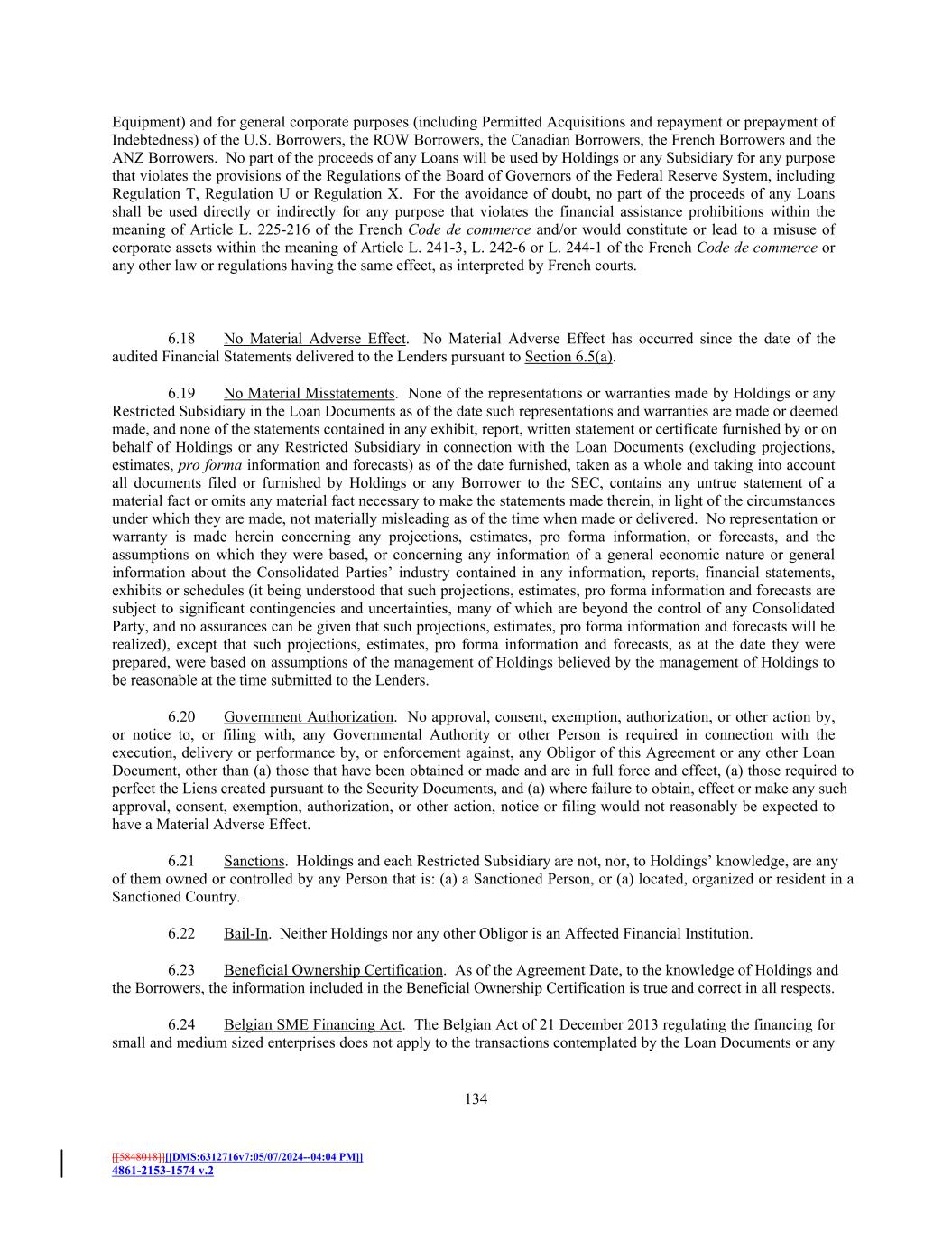 Equipment) and for general corporate purposes (including Permitted Acquisitions and repayment or prepayment of Indebtedness) of the U.S. Borrowers, the ROW Borrowers, the Canadian Borrowers, the French Borrowers and the ANZ Borrowers. No part of the proceeds of any Loans will be used by Holdings or any Subsidiary for any purpose that violates the provisions of the Regulations of the Board of Governors of the Federal Reserve System, including Regulation T, Regulation U or Regulation X. For the avoidance of doubt, no part of the proceeds of any Loans shall be used directly or indirectly for any purpose that violates the financial assistance prohibitions within the meaning of Article L. 225-216 of the French Code de commerce and/or would constitute or lead to a misuse of corporate assets within the meaning of Article L. 241-3, L. 242-6 or L. 244-1 of the French Code de commerce or any other law or regulations having the same effect, as interpreted by French courts. 6.18 No Material Adverse Effect. No Material Adverse Effect has occurred since the date of the audited Financial Statements delivered to the Lenders pursuant to Section 6.5(a). 6.19 No Material Misstatements. None of the representations or warranties made by Holdings or any Restricted Subsidiary in the Loan Documents as of the date such representations and warranties are made or deemed made, and none of the statements contained in any exhibit, report, written statement or certificate furnished by or on behalf of Holdings or any Restricted Subsidiary in connection with the Loan Documents (excluding projections, estimates, pro forma information and forecasts) as of the date furnished, taken as a whole and taking into account all documents filed or furnished by Holdings or any Borrower to the SEC, contains any untrue statement of a material fact or omits any material fact necessary to make the statements made therein, in light of the circumstances under which they are made, not materially misleading as of the time when made or delivered. No representation or warranty is made herein concerning any projections, estimates, pro forma information, or forecasts, and the assumptions on which they were based, or concerning any information of a general economic nature or general information about the Consolidated Parties’ industry contained in any information, reports, financial statements, exhibits or schedules (it being understood that such projections, estimates, pro forma information and forecasts are subject to significant contingencies and uncertainties, many of which are beyond the control of any Consolidated Party, and no assurances can be given that such projections, estimates, pro forma information and forecasts will be realized), except that such projections, estimates, pro forma information and forecasts, as at the date they were prepared, were based on assumptions of the management of Holdings believed by the management of Holdings to be reasonable at the time submitted to the Lenders. 6.20 Government Authorization. No approval, consent, exemption, authorization, or other action by, or notice to, or filing with, any Governmental Authority or other Person is required in connection with the execution, delivery or performance by, or enforcement against, any Obligor of this Agreement or any other Loan Document, other than (a) those that have been obtained or made and are in full force and effect, (a) those required to perfect the Liens created pursuant to the Security Documents, and (a) where failure to obtain, effect or make any such approval, consent, exemption, authorization, or other action, notice or filing would not reasonably be expected to have a Material Adverse Effect. 6.21 Sanctions. Holdings and each Restricted Subsidiary are not, nor, to Holdings’ knowledge, are any of them owned or controlled by any Person that is: (a) a Sanctioned Person, or (a) located, organized or resident in a Sanctioned Country. 6.22 Bail-In. Neither Holdings nor any other Obligor is an Affected Financial Institution. 6.23 Beneficial Ownership Certification. As of the Agreement Date, to the knowledge of Holdings and the Borrowers, the information included in the Beneficial Ownership Certification is true and correct in all respects. 6.24 Belgian SME Financing Act. The Belgian Act of 21 December 2013 regulating the financing for small and medium sized enterprises does not apply to the transactions contemplated by the Loan Documents or any 134 [[5848018]][[DMS:6312716v7:05/07/2024--04:04 PM]] 4861-2153-1574 v.2