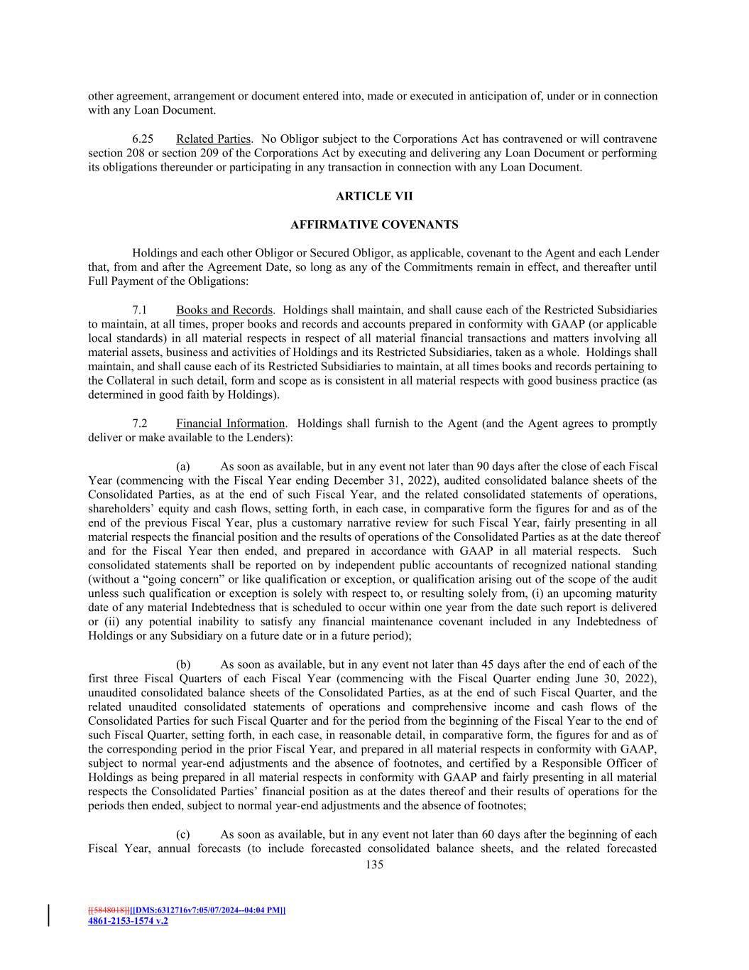 other agreement, arrangement or document entered into, made or executed in anticipation of, under or in connection with any Loan Document. 6.25 Related Parties. No Obligor subject to the Corporations Act has contravened or will contravene section 208 or section 209 of the Corporations Act by executing and delivering any Loan Document or performing its obligations thereunder or participating in any transaction in connection with any Loan Document. ARTICLE VII AFFIRMATIVE COVENANTS Holdings and each other Obligor or Secured Obligor, as applicable, covenant to the Agent and each Lender that, from and after the Agreement Date, so long as any of the Commitments remain in effect, and thereafter until Full Payment of the Obligations: 7.1 Books and Records. Holdings shall maintain, and shall cause each of the Restricted Subsidiaries to maintain, at all times, proper books and records and accounts prepared in conformity with GAAP (or applicable local standards) in all material respects in respect of all material financial transactions and matters involving all material assets, business and activities of Holdings and its Restricted Subsidiaries, taken as a whole. Holdings shall maintain, and shall cause each of its Restricted Subsidiaries to maintain, at all times books and records pertaining to the Collateral in such detail, form and scope as is consistent in all material respects with good business practice (as determined in good faith by Holdings). 7.2 Financial Information. Holdings shall furnish to the Agent (and the Agent agrees to promptly deliver or make available to the Lenders): (a) As soon as available, but in any event not later than 90 days after the close of each Fiscal Year (commencing with the Fiscal Year ending December 31, 2022), audited consolidated balance sheets of the Consolidated Parties, as at the end of such Fiscal Year, and the related consolidated statements of operations, shareholders’ equity and cash flows, setting forth, in each case, in comparative form the figures for and as of the end of the previous Fiscal Year, plus a customary narrative review for such Fiscal Year, fairly presenting in all material respects the financial position and the results of operations of the Consolidated Parties as at the date thereof and for the Fiscal Year then ended, and prepared in accordance with GAAP in all material respects. Such consolidated statements shall be reported on by independent public accountants of recognized national standing (without a “going concern” or like qualification or exception, or qualification arising out of the scope of the audit unless such qualification or exception is solely with respect to, or resulting solely from, (i) an upcoming maturity date of any material Indebtedness that is scheduled to occur within one year from the date such report is delivered or (ii) any potential inability to satisfy any financial maintenance covenant included in any Indebtedness of Holdings or any Subsidiary on a future date or in a future period); (b) As soon as available, but in any event not later than 45 days after the end of each of the first three Fiscal Quarters of each Fiscal Year (commencing with the Fiscal Quarter ending June 30, 2022), unaudited consolidated balance sheets of the Consolidated Parties, as at the end of such Fiscal Quarter, and the related unaudited consolidated statements of operations and comprehensive income and cash flows of the Consolidated Parties for such Fiscal Quarter and for the period from the beginning of the Fiscal Year to the end of such Fiscal Quarter, setting forth, in each case, in reasonable detail, in comparative form, the figures for and as of the corresponding period in the prior Fiscal Year, and prepared in all material respects in conformity with GAAP, subject to normal year-end adjustments and the absence of footnotes, and certified by a Responsible Officer of Holdings as being prepared in all material respects in conformity with GAAP and fairly presenting in all material respects the Consolidated Parties’ financial position as at the dates thereof and their results of operations for the periods then ended, subject to normal year-end adjustments and the absence of footnotes; (c) As soon as available, but in any event not later than 60 days after the beginning of each Fiscal Year, annual forecasts (to include forecasted consolidated balance sheets, and the related forecasted 135 [[5848018]][[DMS:6312716v7:05/07/2024--04:04 PM]] 4861-2153-1574 v.2