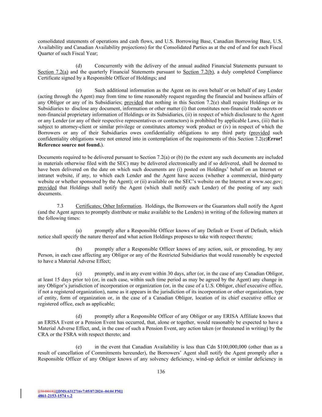 consolidated statements of operations and cash flows, and U.S. Borrowing Base, Canadian Borrowing Base, U.S. Availability and Canadian Availability projections) for the Consolidated Parties as at the end of and for each Fiscal Quarter of such Fiscal Year; (d) Concurrently with the delivery of the annual audited Financial Statements pursuant to Section 7.2(a) and the quarterly Financial Statements pursuant to Section 7.2(b), a duly completed Compliance Certificate signed by a Responsible Officer of Holdings; and (e) Such additional information as the Agent on its own behalf or on behalf of any Lender (acting through the Agent) may from time to time reasonably request regarding the financial and business affairs of any Obligor or any of its Subsidiaries; provided that nothing in this Section 7.2(e) shall require Holdings or its Subsidiaries to disclose any document, information or other matter (i) that constitutes non-financial trade secrets or non-financial proprietary information of Holdings or its Subsidiaries, (ii) in respect of which disclosure to the Agent or any Lender (or any of their respective representatives or contractors) is prohibited by applicable Laws, (iii) that is subject to attorney-client or similar privilege or constitutes attorney work product or (iv) in respect of which the Borrowers or any of their Subsidiaries owes confidentiality obligations to any third party (provided such confidentiality obligations were not entered into in contemplation of the requirements of this Section 7.2(e)Error! Reference source not found.). Documents required to be delivered pursuant to Section 7.2(a) or (b) (to the extent any such documents are included in materials otherwise filed with the SEC) may be delivered electronically and if so delivered, shall be deemed to have been delivered on the date on which such documents are (i) posted on Holdings’ behalf on an Internet or intranet website, if any, to which each Lender and the Agent have access (whether a commercial, third-party website or whether sponsored by the Agent); or (ii) available on the SEC’s website on the Internet at www.sec.gov; provided that Holdings shall notify the Agent (which shall notify each Lender) of the posting of any such documents. 7.3 Certificates; Other Information. Holdings, the Borrowers or the Guarantors shall notify the Agent (and the Agent agrees to promptly distribute or make available to the Lenders) in writing of the following matters at the following times: (a) promptly after a Responsible Officer knows of any Default or Event of Default, which notice shall specify the nature thereof and what action Holdings proposes to take with respect thereto; (b) promptly after a Responsible Officer knows of any action, suit, or proceeding, by any Person, in each case affecting any Obligor or any of the Restricted Subsidiaries that would reasonably be expected to have a Material Adverse Effect; (c) promptly, and in any event within 30 days, after (or, in the case of any Canadian Obligor, at least 15 days prior to) (or, in each case, within such time period as may be agreed by the Agent) any change in any Obligor’s jurisdiction of incorporation or organization (or, in the case of a U.S. Obligor, chief executive office, if not a registered organization), name as it appears in the jurisdiction of its incorporation or other organization, type of entity, form of organization or, in the case of a Canadian Obligor, location of its chief executive office or registered office, each as applicable; (d) promptly after a Responsible Officer of any Obligor or any ERISA Affiliate knows that an ERISA Event or a Pension Event has occurred, that, alone or together, would reasonably be expected to have a Material Adverse Effect, and, in the case of such a Pension Event, any action taken (or threatened in writing) by the CRA or the FSRA with respect thereto; and (e) in the event that Canadian Availability is less than Cdn $100,000,000 (other than as a result of cancellation of Commitments hereunder), the Borrowers’ Agent shall notify the Agent promptly after a Responsible Officer of any Obligor knows of any solvency deficiency, wind-up deficit or similar deficiency in 136 [[5848018]][[DMS:6312716v7:05/07/2024--04:04 PM]] 4861-2153-1574 v.2
