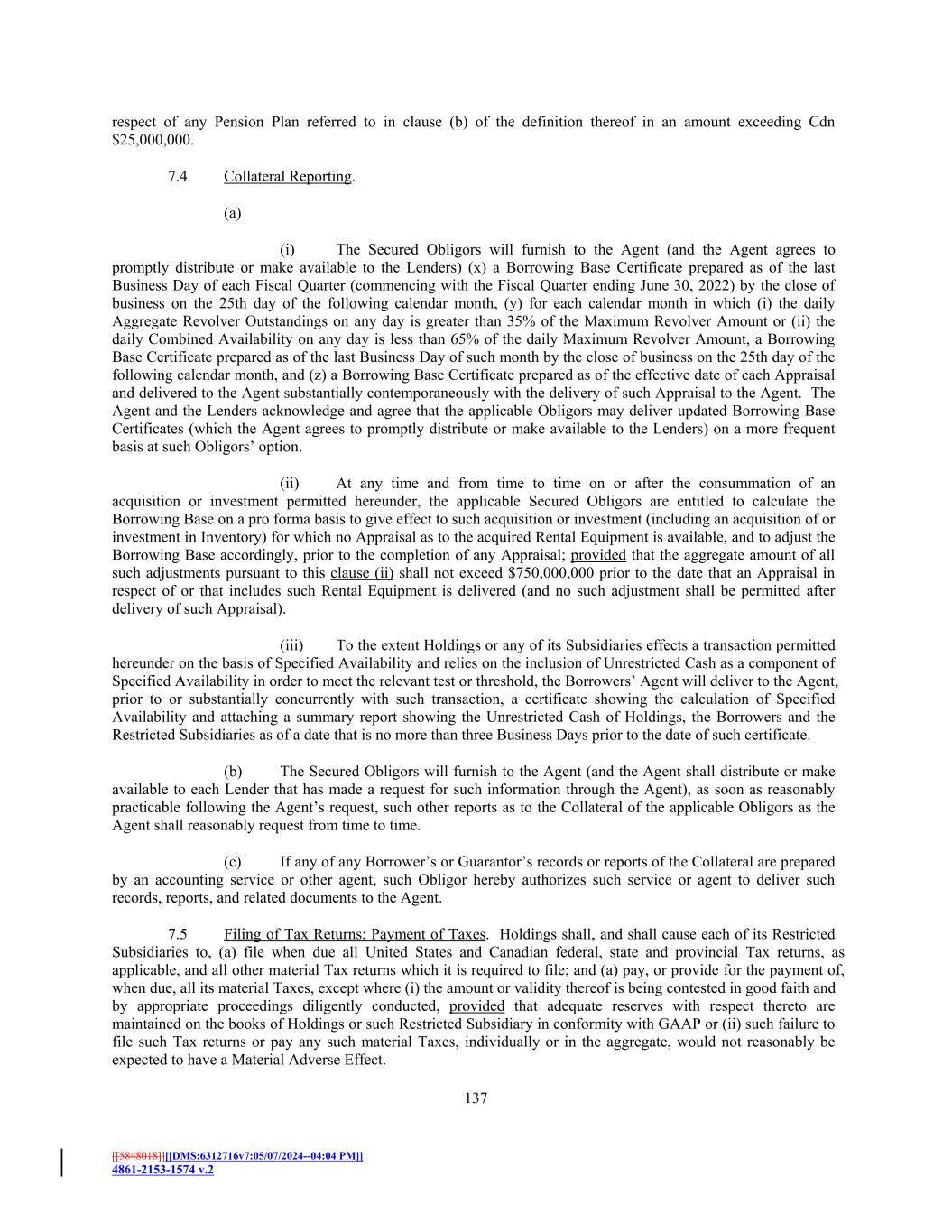 respect of any Pension Plan referred to in clause (b) of the definition thereof in an amount exceeding Cdn $25,000,000. 7.4 Collateral Reporting. (a) (i) The Secured Obligors will furnish to the Agent (and the Agent agrees to promptly distribute or make available to the Lenders) (x) a Borrowing Base Certificate prepared as of the last Business Day of each Fiscal Quarter (commencing with the Fiscal Quarter ending June 30, 2022) by the close of business on the 25th day of the following calendar month, (y) for each calendar month in which (i) the daily Aggregate Revolver Outstandings on any day is greater than 35% of the Maximum Revolver Amount or (ii) the daily Combined Availability on any day is less than 65% of the daily Maximum Revolver Amount, a Borrowing Base Certificate prepared as of the last Business Day of such month by the close of business on the 25th day of the following calendar month, and (z) a Borrowing Base Certificate prepared as of the effective date of each Appraisal and delivered to the Agent substantially contemporaneously with the delivery of such Appraisal to the Agent. The Agent and the Lenders acknowledge and agree that the applicable Obligors may deliver updated Borrowing Base Certificates (which the Agent agrees to promptly distribute or make available to the Lenders) on a more frequent basis at such Obligors’ option. (ii) At any time and from time to time on or after the consummation of an acquisition or investment permitted hereunder, the applicable Secured Obligors are entitled to calculate the Borrowing Base on a pro forma basis to give effect to such acquisition or investment (including an acquisition of or investment in Inventory) for which no Appraisal as to the acquired Rental Equipment is available, and to adjust the Borrowing Base accordingly, prior to the completion of any Appraisal; provided that the aggregate amount of all such adjustments pursuant to this clause (ii) shall not exceed $750,000,000 prior to the date that an Appraisal in respect of or that includes such Rental Equipment is delivered (and no such adjustment shall be permitted after delivery of such Appraisal). (iii) To the extent Holdings or any of its Subsidiaries effects a transaction permitted hereunder on the basis of Specified Availability and relies on the inclusion of Unrestricted Cash as a component of Specified Availability in order to meet the relevant test or threshold, the Borrowers’ Agent will deliver to the Agent, prior to or substantially concurrently with such transaction, a certificate showing the calculation of Specified Availability and attaching a summary report showing the Unrestricted Cash of Holdings, the Borrowers and the Restricted Subsidiaries as of a date that is no more than three Business Days prior to the date of such certificate. (b) The Secured Obligors will furnish to the Agent (and the Agent shall distribute or make available to each Lender that has made a request for such information through the Agent), as soon as reasonably practicable following the Agent’s request, such other reports as to the Collateral of the applicable Obligors as the Agent shall reasonably request from time to time. (c) If any of any Borrower’s or Guarantor’s records or reports of the Collateral are prepared by an accounting service or other agent, such Obligor hereby authorizes such service or agent to deliver such records, reports, and related documents to the Agent. 7.5 Filing of Tax Returns; Payment of Taxes. Holdings shall, and shall cause each of its Restricted Subsidiaries to, (a) file when due all United States and Canadian federal, state and provincial Tax returns, as applicable, and all other material Tax returns which it is required to file; and (a) pay, or provide for the payment of, when due, all its material Taxes, except where (i) the amount or validity thereof is being contested in good faith and by appropriate proceedings diligently conducted, provided that adequate reserves with respect thereto are maintained on the books of Holdings or such Restricted Subsidiary in conformity with GAAP or (ii) such failure to file such Tax returns or pay any such material Taxes, individually or in the aggregate, would not reasonably be expected to have a Material Adverse Effect. 137 [[5848018]][[DMS:6312716v7:05/07/2024--04:04 PM]] 4861-2153-1574 v.2