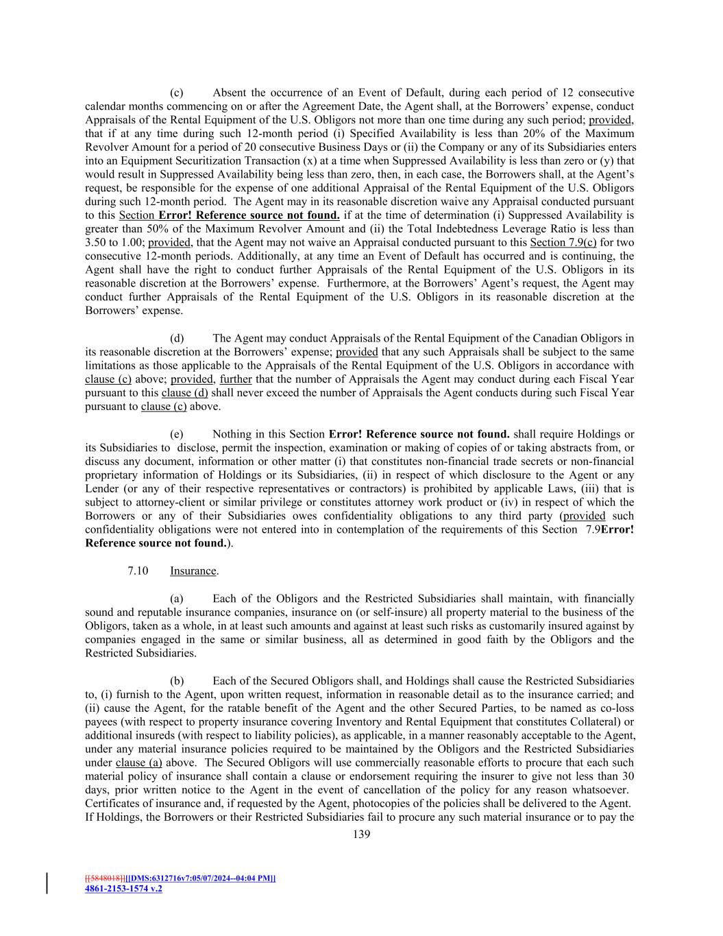 (c) Absent the occurrence of an Event of Default, during each period of 12 consecutive calendar months commencing on or after the Agreement Date, the Agent shall, at the Borrowers’ expense, conduct Appraisals of the Rental Equipment of the U.S. Obligors not more than one time during any such period; provided, that if at any time during such 12-month period (i) Specified Availability is less than 20% of the Maximum Revolver Amount for a period of 20 consecutive Business Days or (ii) the Company or any of its Subsidiaries enters into an Equipment Securitization Transaction (x) at a time when Suppressed Availability is less than zero or (y) that would result in Suppressed Availability being less than zero, then, in each case, the Borrowers shall, at the Agent’s request, be responsible for the expense of one additional Appraisal of the Rental Equipment of the U.S. Obligors during such 12-month period. The Agent may in its reasonable discretion waive any Appraisal conducted pursuant to this Section Error! Reference source not found. if at the time of determination (i) Suppressed Availability is greater than 50% of the Maximum Revolver Amount and (ii) the Total Indebtedness Leverage Ratio is less than 3.50 to 1.00; provided, that the Agent may not waive an Appraisal conducted pursuant to this Section 7.9(c) for two consecutive 12-month periods. Additionally, at any time an Event of Default has occurred and is continuing, the Agent shall have the right to conduct further Appraisals of the Rental Equipment of the U.S. Obligors in its reasonable discretion at the Borrowers’ expense. Furthermore, at the Borrowers’ Agent’s request, the Agent may conduct further Appraisals of the Rental Equipment of the U.S. Obligors in its reasonable discretion at the Borrowers’ expense. (d) The Agent may conduct Appraisals of the Rental Equipment of the Canadian Obligors in its reasonable discretion at the Borrowers’ expense; provided that any such Appraisals shall be subject to the same limitations as those applicable to the Appraisals of the Rental Equipment of the U.S. Obligors in accordance with clause (c) above; provided, further that the number of Appraisals the Agent may conduct during each Fiscal Year pursuant to this clause (d) shall never exceed the number of Appraisals the Agent conducts during such Fiscal Year pursuant to clause (c) above. (e) Nothing in this Section Error! Reference source not found. shall require Holdings or its Subsidiaries to disclose, permit the inspection, examination or making of copies of or taking abstracts from, or discuss any document, information or other matter (i) that constitutes non-financial trade secrets or non-financial proprietary information of Holdings or its Subsidiaries, (ii) in respect of which disclosure to the Agent or any Lender (or any of their respective representatives or contractors) is prohibited by applicable Laws, (iii) that is subject to attorney-client or similar privilege or constitutes attorney work product or (iv) in respect of which the Borrowers or any of their Subsidiaries owes confidentiality obligations to any third party (provided such confidentiality obligations were not entered into in contemplation of the requirements of this Section 7.9Error! Reference source not found.). 7.10 Insurance. (a) Each of the Obligors and the Restricted Subsidiaries shall maintain, with financially sound and reputable insurance companies, insurance on (or self-insure) all property material to the business of the Obligors, taken as a whole, in at least such amounts and against at least such risks as customarily insured against by companies engaged in the same or similar business, all as determined in good faith by the Obligors and the Restricted Subsidiaries. (b) Each of the Secured Obligors shall, and Holdings shall cause the Restricted Subsidiaries to, (i) furnish to the Agent, upon written request, information in reasonable detail as to the insurance carried; and (ii) cause the Agent, for the ratable benefit of the Agent and the other Secured Parties, to be named as co-loss payees (with respect to property insurance covering Inventory and Rental Equipment that constitutes Collateral) or additional insureds (with respect to liability policies), as applicable, in a manner reasonably acceptable to the Agent, under any material insurance policies required to be maintained by the Obligors and the Restricted Subsidiaries under clause (a) above. The Secured Obligors will use commercially reasonable efforts to procure that each such material policy of insurance shall contain a clause or endorsement requiring the insurer to give not less than 30 days, prior written notice to the Agent in the event of cancellation of the policy for any reason whatsoever. Certificates of insurance and, if requested by the Agent, photocopies of the policies shall be delivered to the Agent. If Holdings, the Borrowers or their Restricted Subsidiaries fail to procure any such material insurance or to pay the 139 [[5848018]][[DMS:6312716v7:05/07/2024--04:04 PM]] 4861-2153-1574 v.2